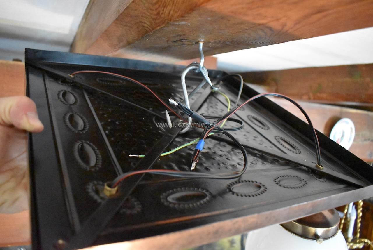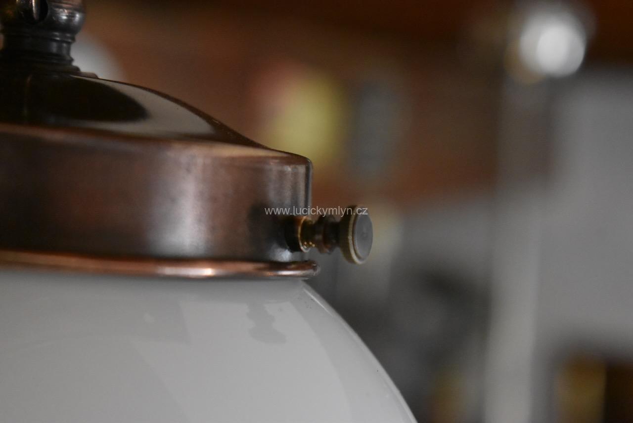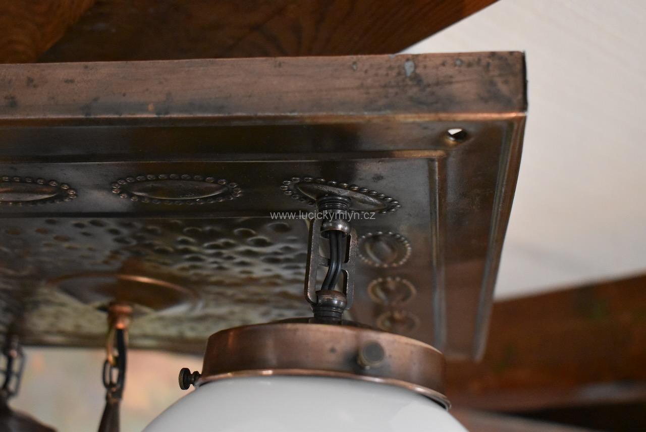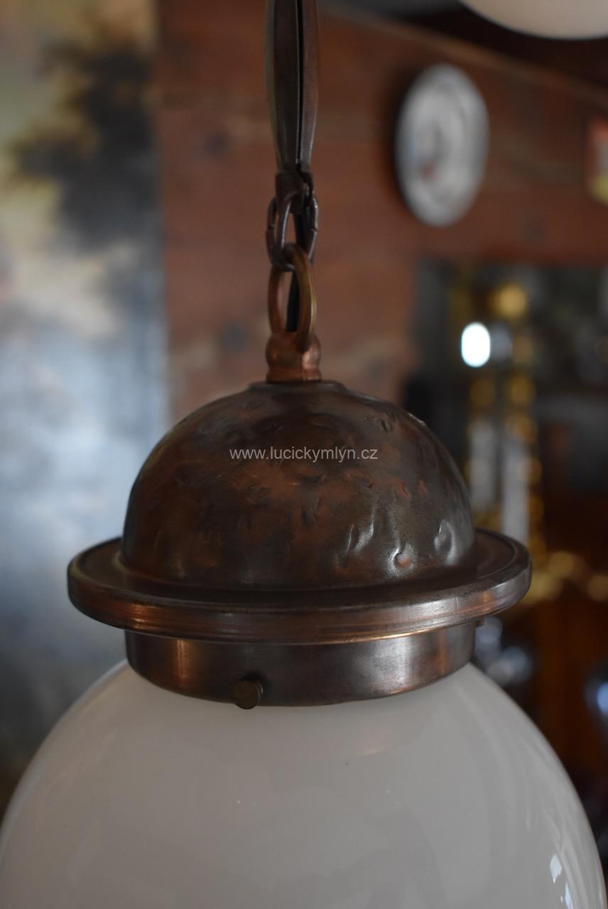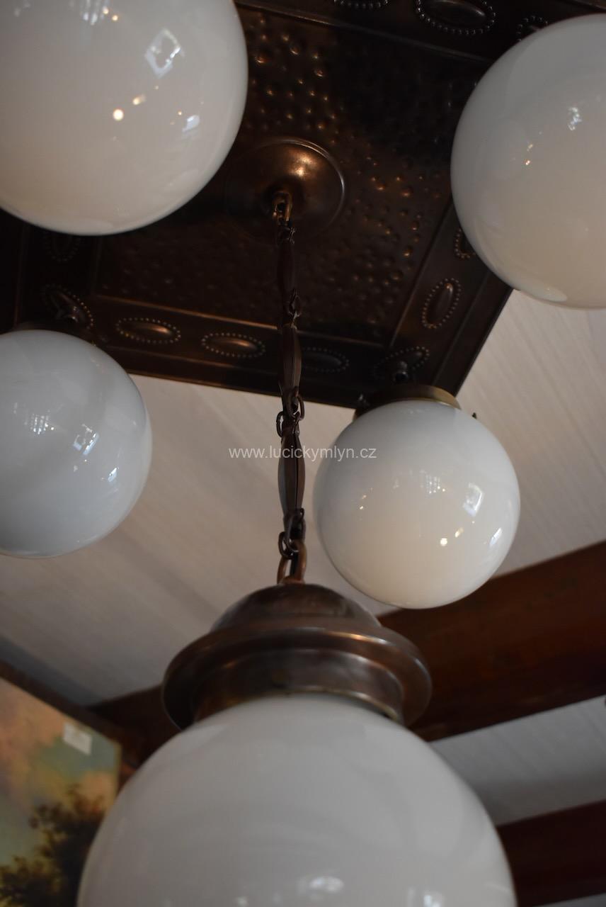 Větší starožitné sdružené světlo v pozdně secesním stylu má základnu v podobě vykládané kazety. Tato nižší stropní základna, byla pasířsky vyrobena z plechu patinovaného na starý bronz. V jejím středu je na delším řetízkovém závěsu upevněna o něco větší mléčně bílá koule. Další závěsné koule jsou ze stejného bílého skla, ale mají o trochu menší průměr. Kovové dílce lustru, byly vyrobeny z ozdobně tlačené mosazi a oceli a mají příjemně tmavý měděný nádech. Postranní stínidla jsou zavěšená na krátkých ozdobných článcích. Všechny základny stínících koulí byly osazeny objímkami na běžné žárovky stejně jako stínidlo centrální. Toto osobité prvorepublikové světlo se dá zavěsit nebo i přímo přišroubovat ke stropu. Starožitné, pozdně secesní, salonní světlo je po celkové nákladné renovaci, včetně nové elektroinstalace.