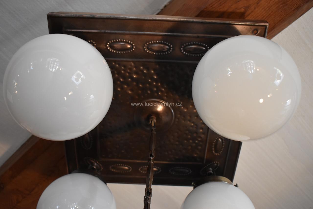 Atypický salonní prvorepublikový lustr čtvercového půdorysu s větší centrální závěsnou koulí a čtyřmi postranními