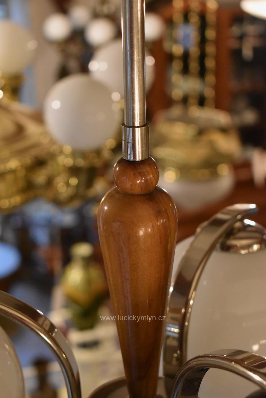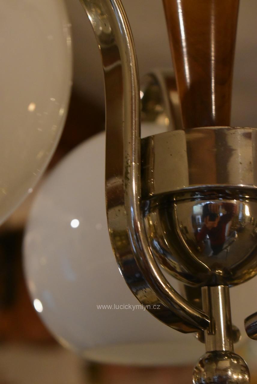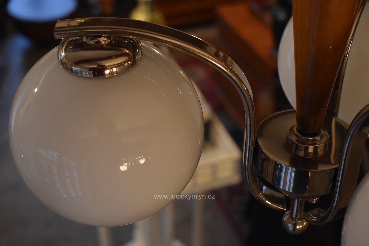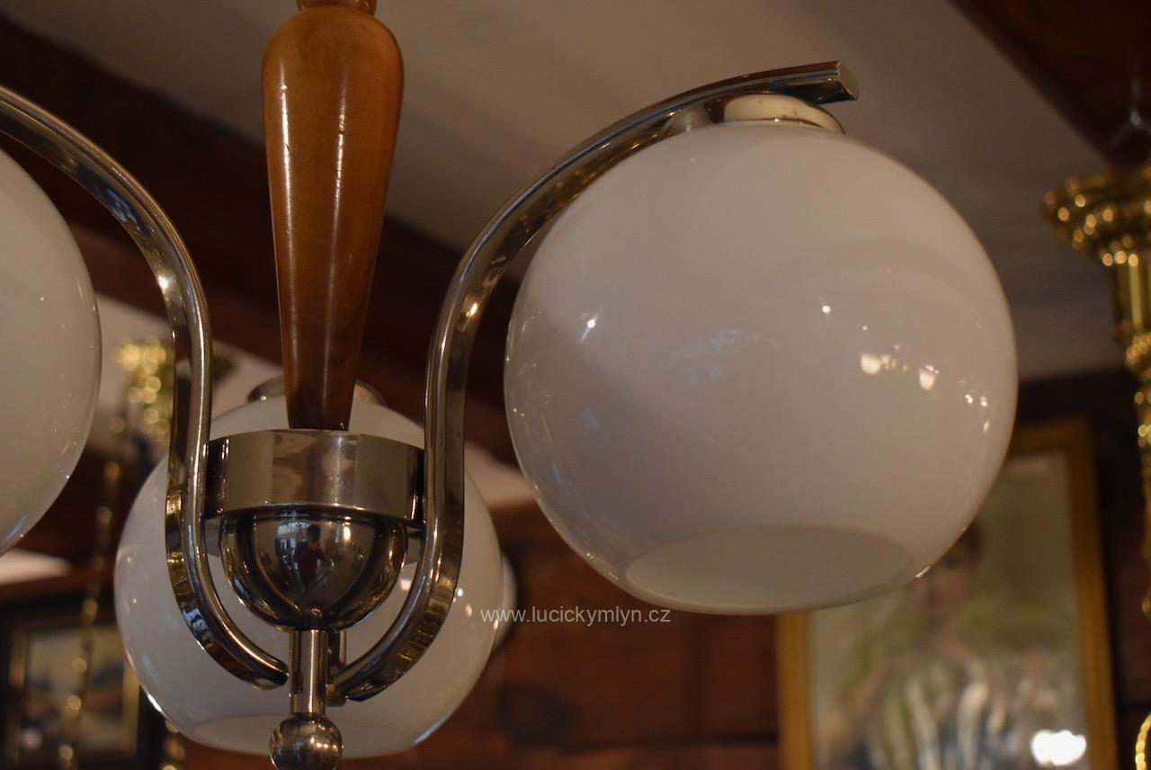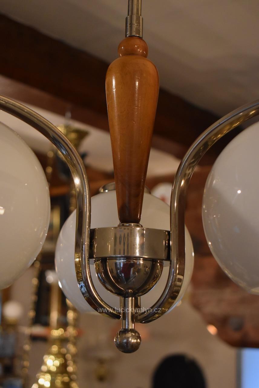 Menší starožitný, zajímavě ztvárněný, chromovaný funkcionalistický lustr s ořechovým centrálním dílcem a otevřenými koulemi z bílého skla