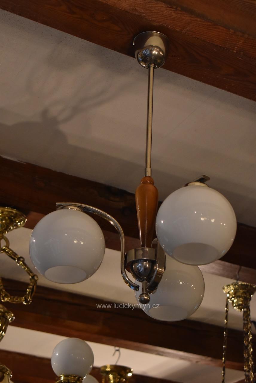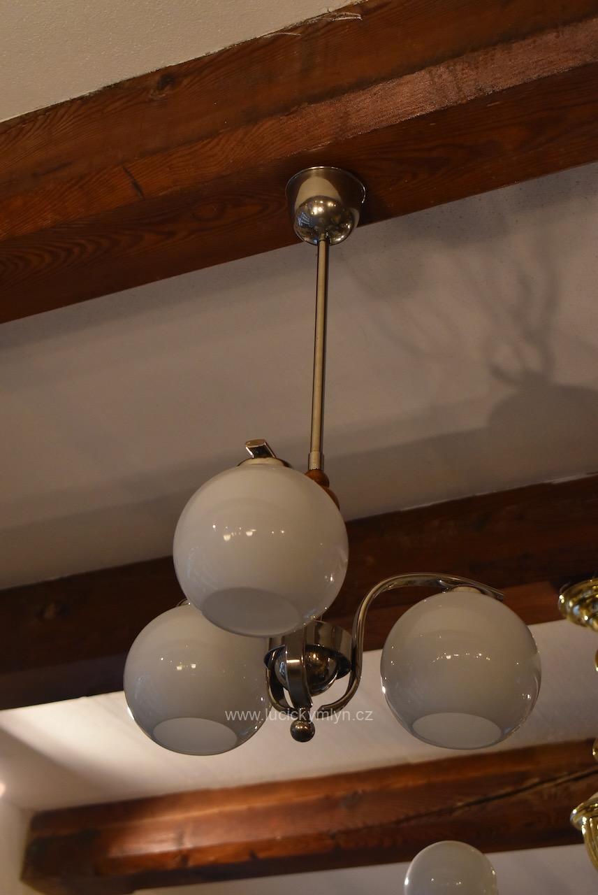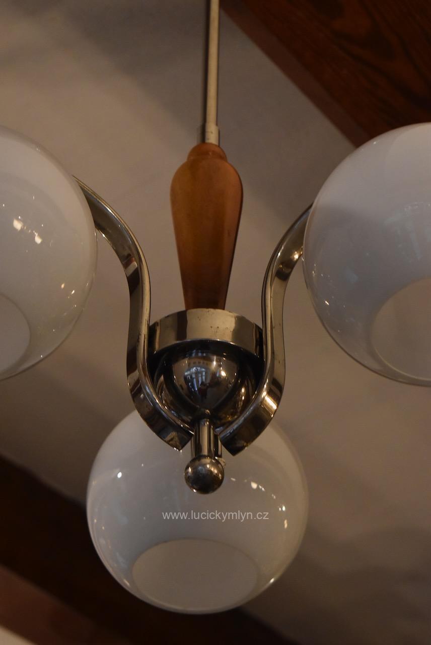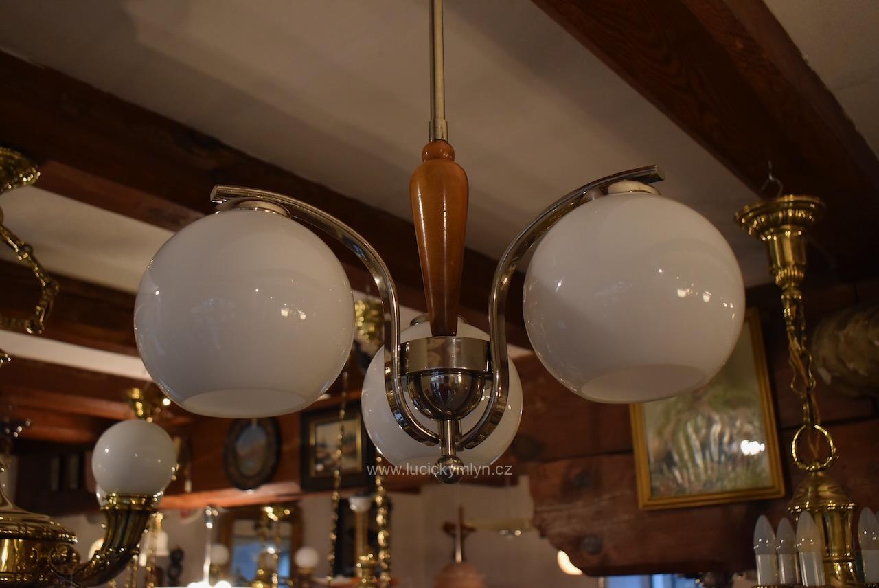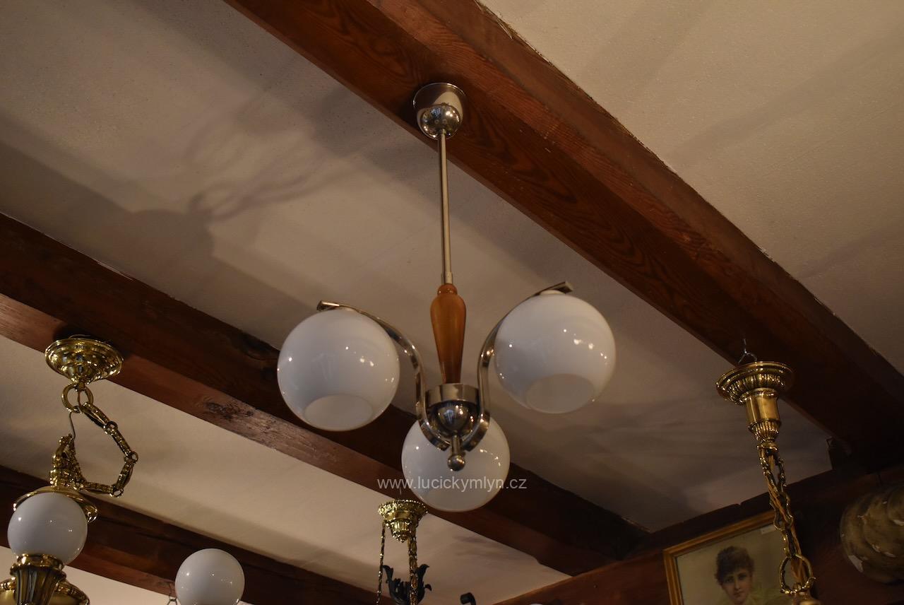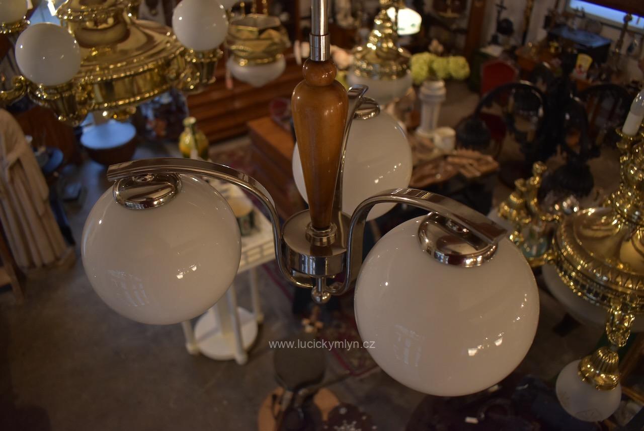 Menší starožitný, zajímavě ztvárněný, chromovaný funkcionalistický lustr s ořechovým centrálním dílcem a otevřenými koulemi z bílého skla