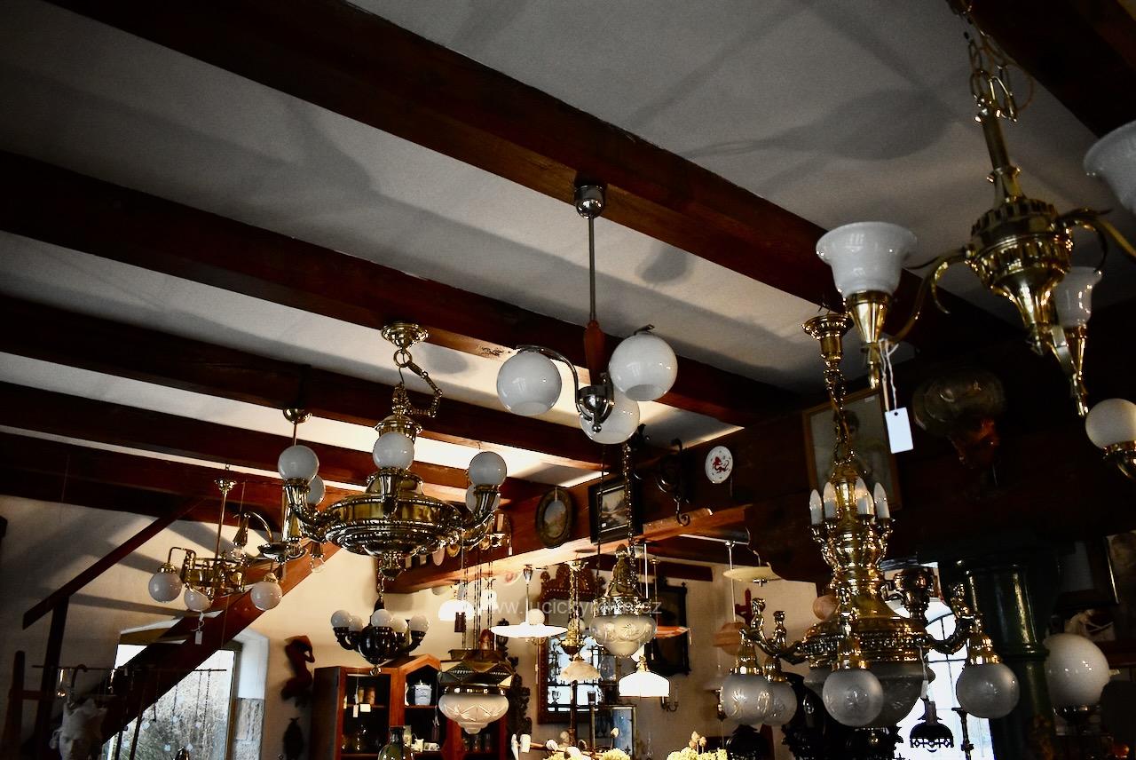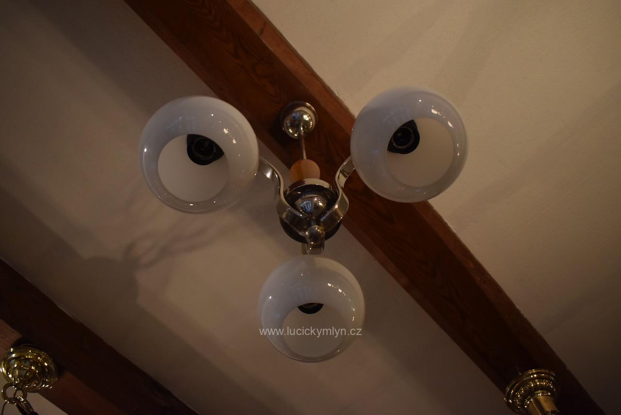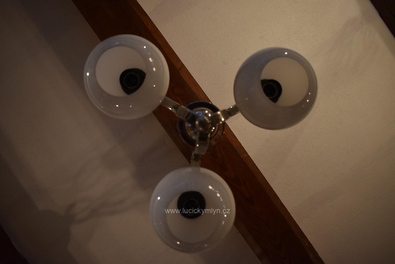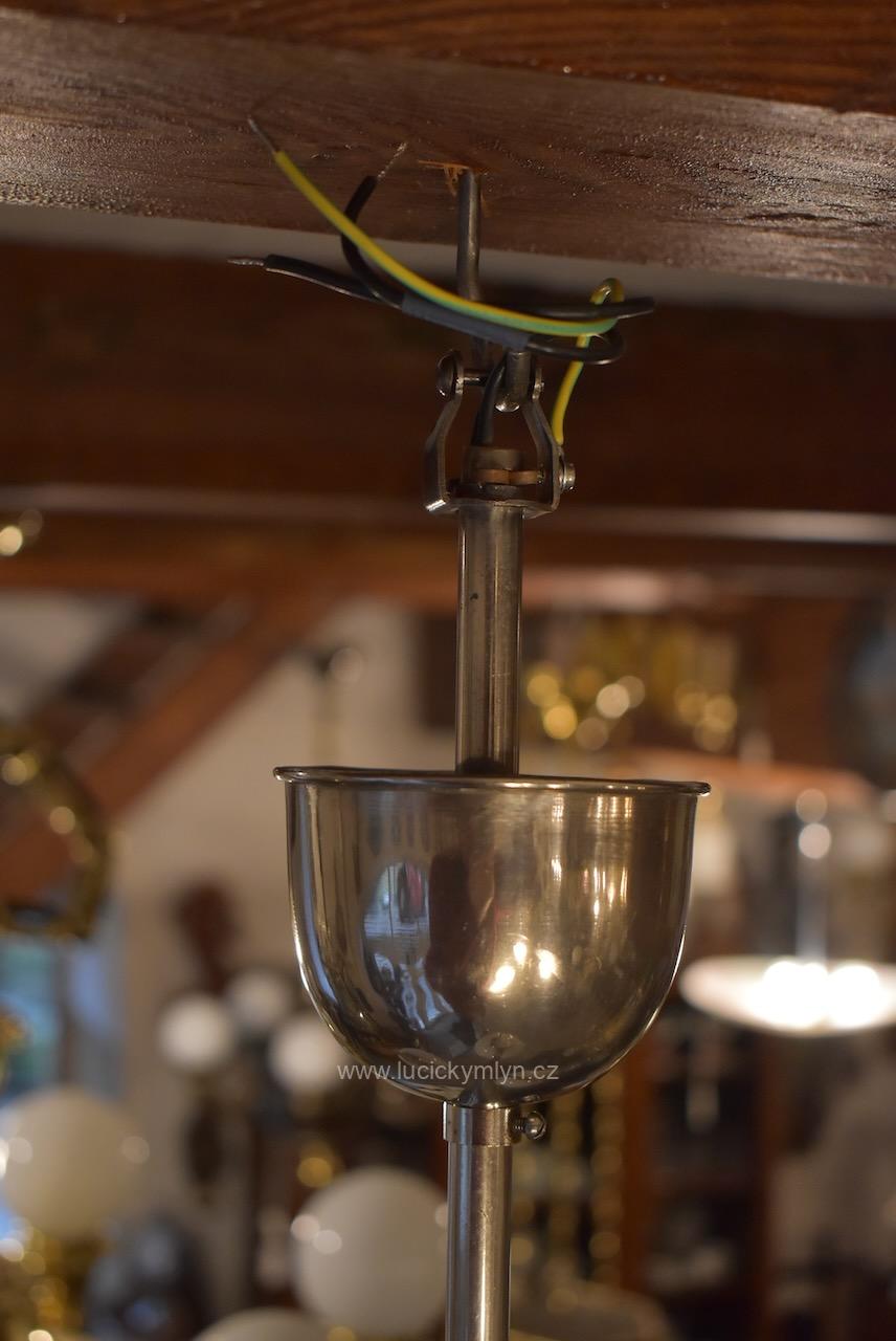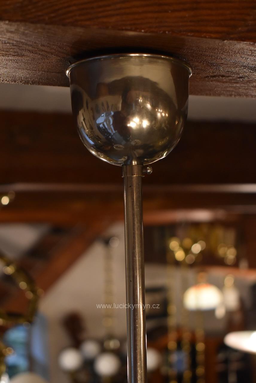 Hezké závěsné světlo bylo vyrobeno okolo roku 1935 z chromovaných dílců. Lustr má 3 elegantní, téměř esovitě ztvárněná polokruhová ramena, nahoře zakončená spodně ukotvenými kloboučky z tlačené chromované mosazi. Stínidla z lesklého mléčně bílého skla jsou upevněna přítlačným obvodovým šroubením na žárovkové objímce. Toto jednoduché, ale velmi vkusné svítidlo je po celkové renovaci a s novou elektroinstalací. Do starožitného lustru se šroubují žárovky s běžným závitem.