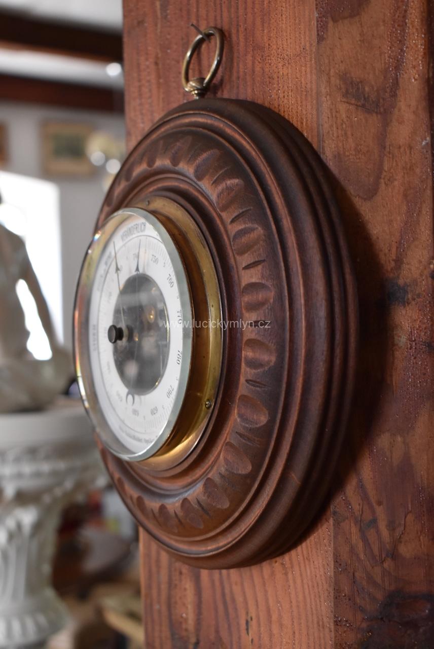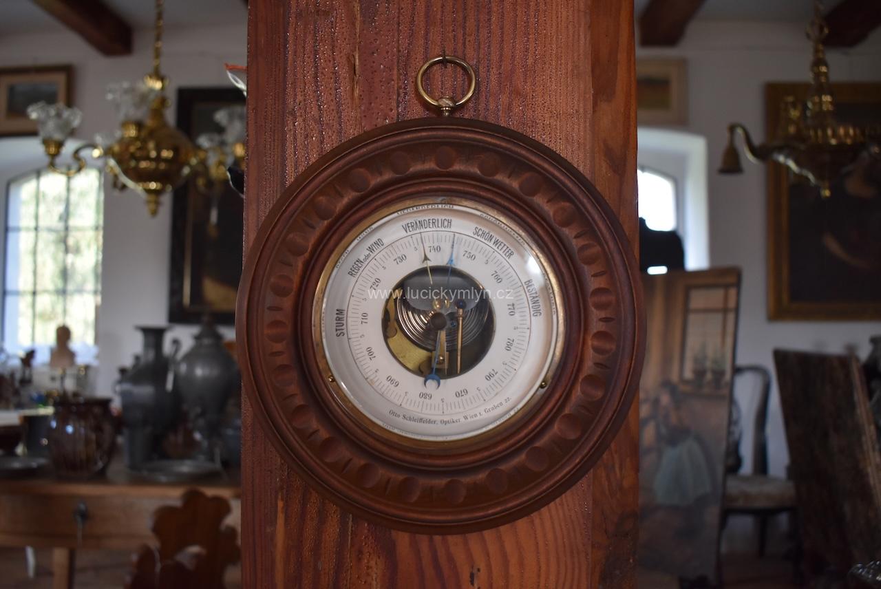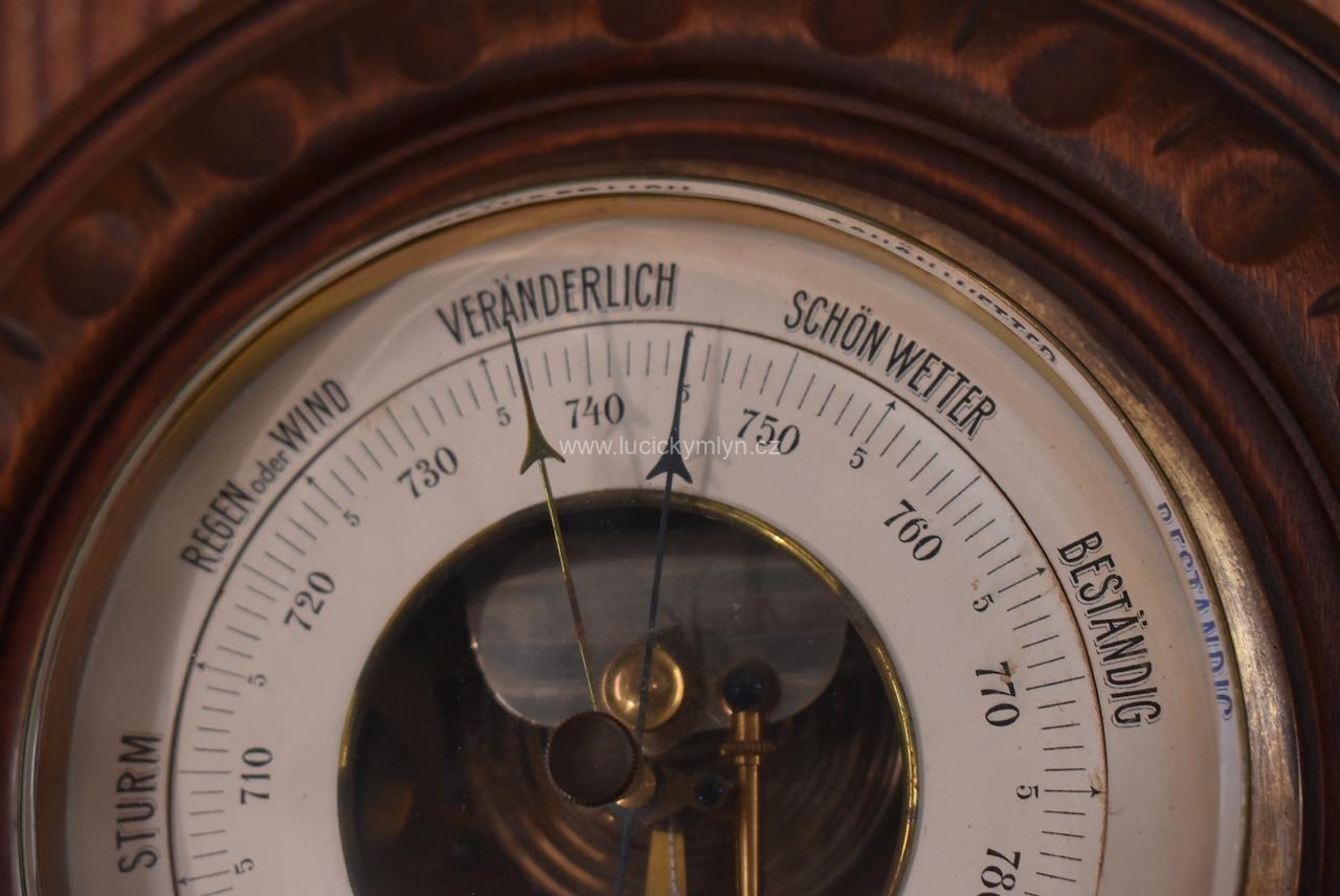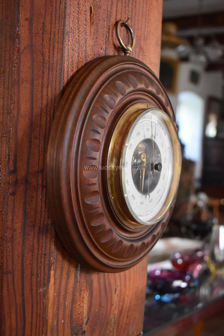 Dnes už málo vídané, technické zařízení pro měření atmosférického tlaku, sloužilo ke snadnější předpovědi počasí. Více jak stoletý, precizně zhotovený měřící přístroj, byl vložený do soustružené, ručně řezané a tmavé mořené, dřevěné schránky. Plně funkční starožitný barometr ve velmi dobrém původním stavu po vyčištění.