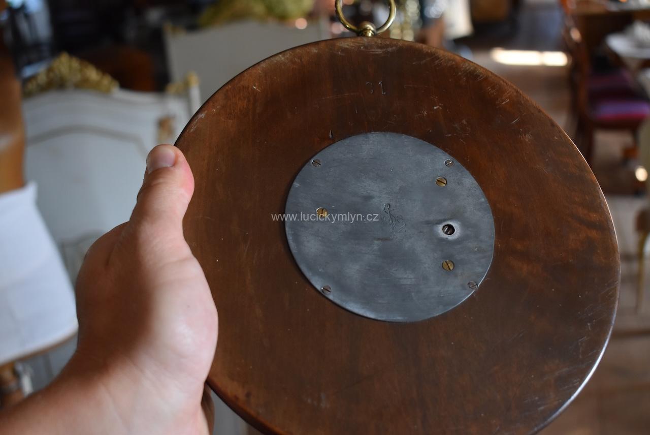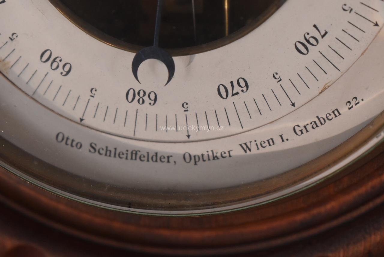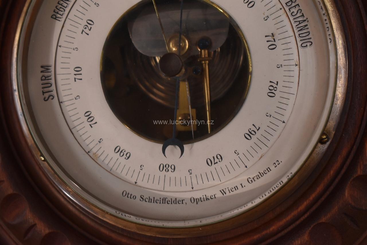 Funkční starožitný více jak 100letý závěsný barometr kulatého tvaru, značený Otto Schleiffelder, Optiker, Wien