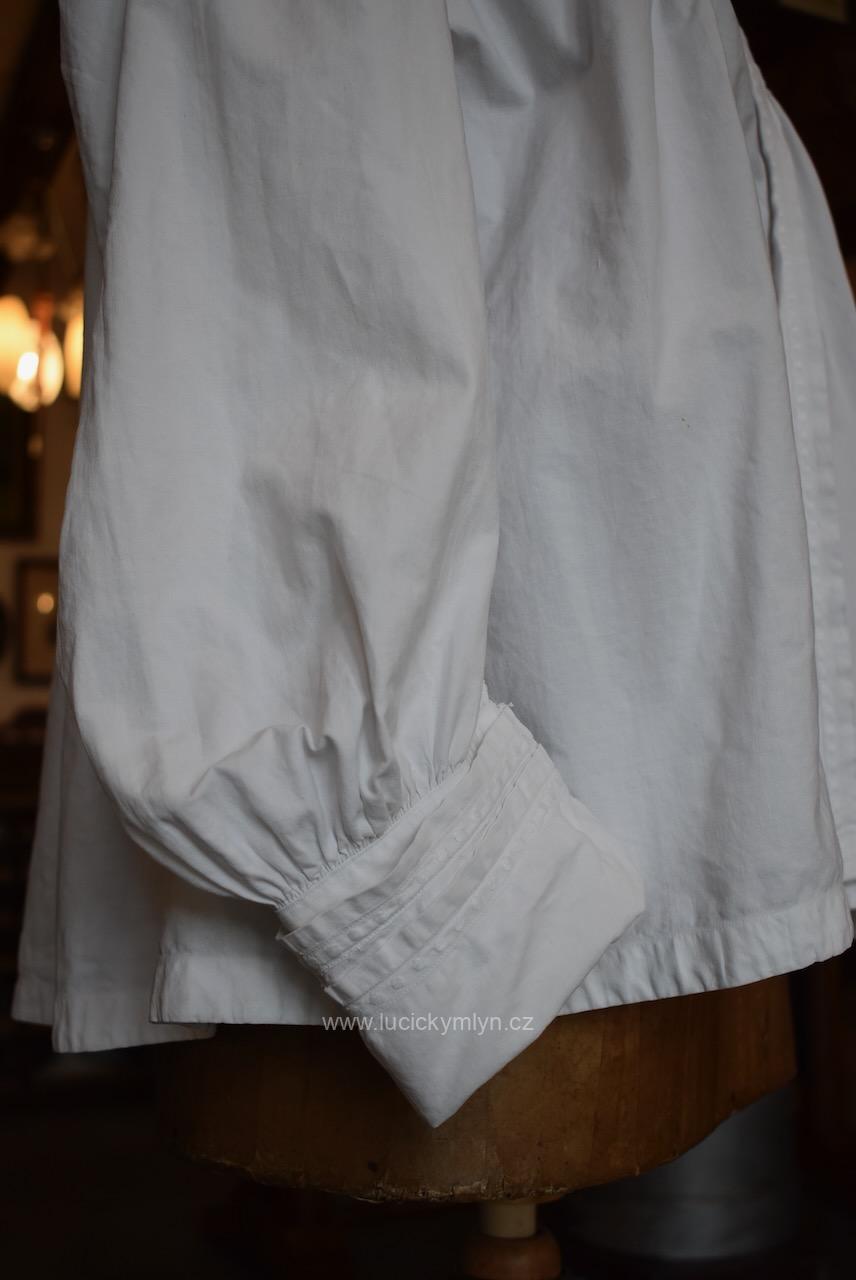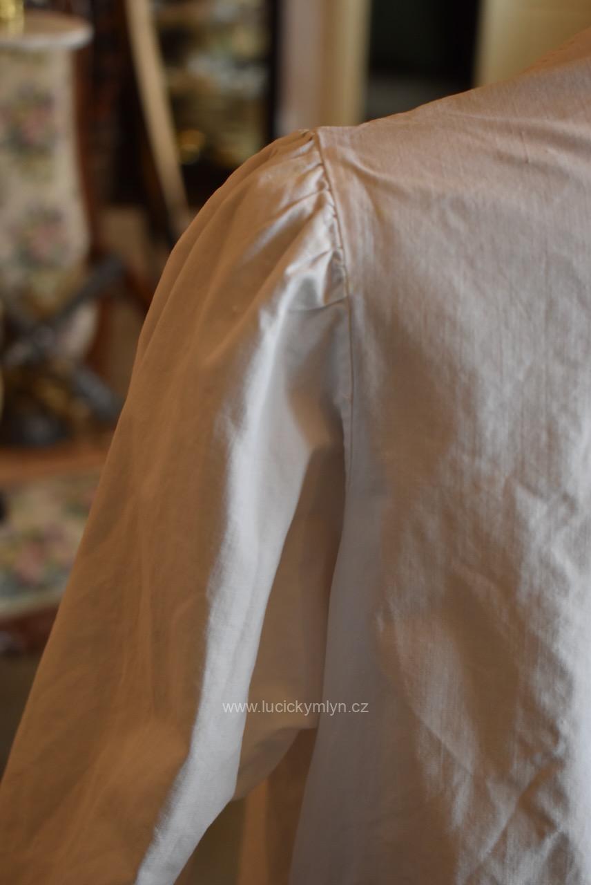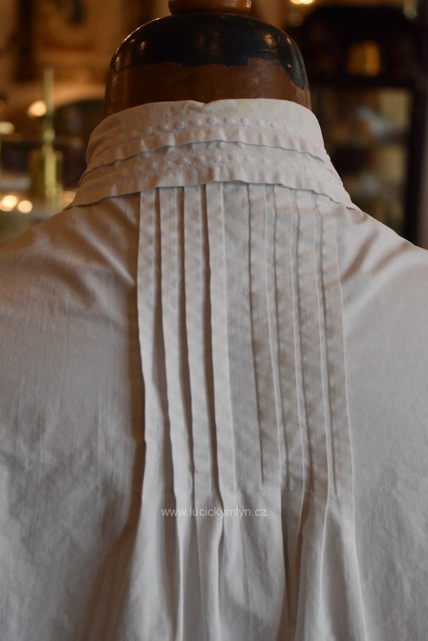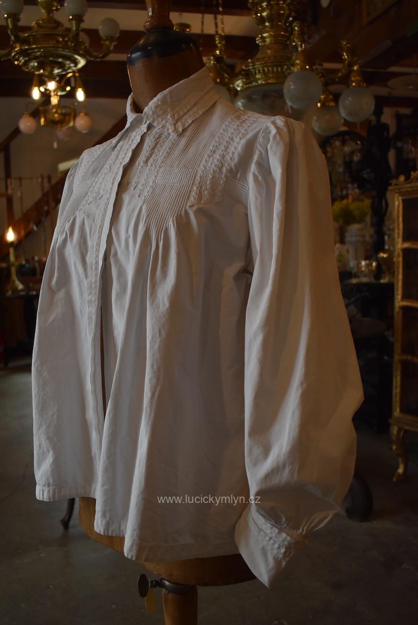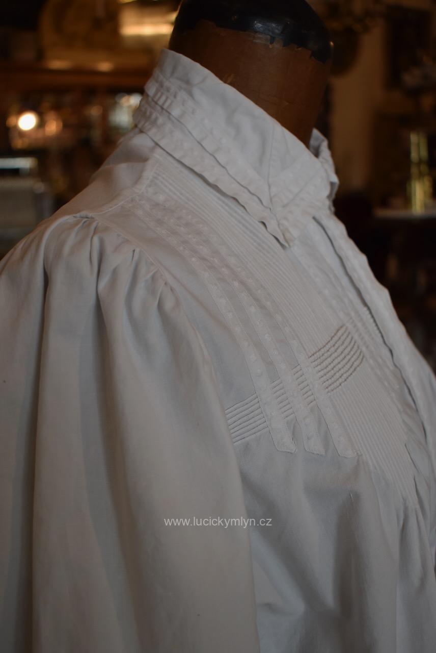 Krejčovské dílko z Moravy, pochází z měšťanského nebo bohatšího venkovského prostředí. Košilka byla decentně plasticky oživena celou soustavou vertikálně vedeného lemování a prošívání. Originální společenské oblečení s vysokým podílem náročného ručního zpracování a výzdoby, pochází z období okolo roku 1910. Kratší starožitná košilka se díky pečlivosti minimálně dvou generací, zachovala ve velmi dobrém původním stavu a je po vyprání.