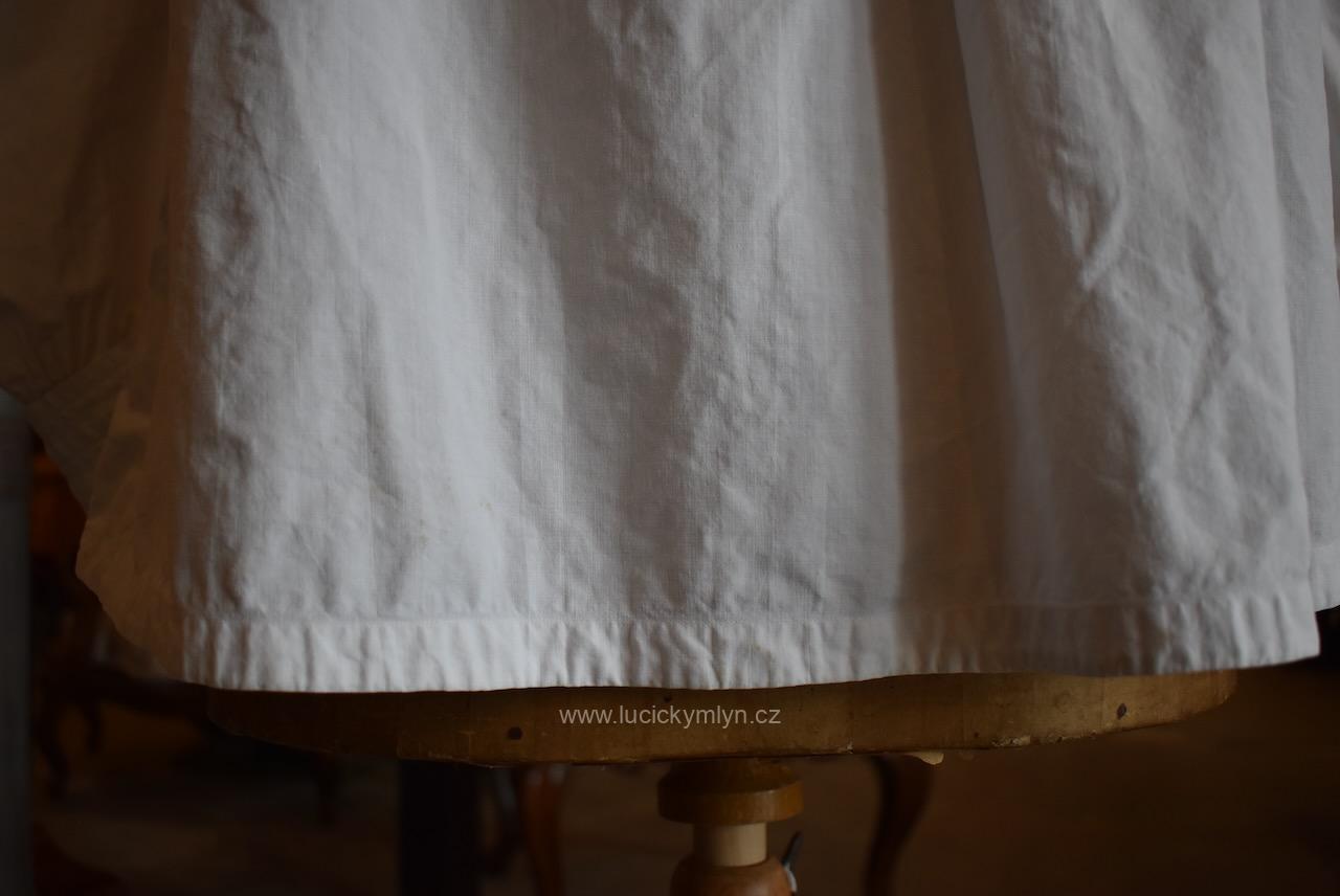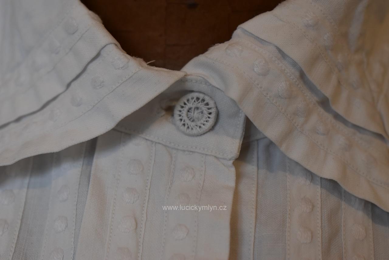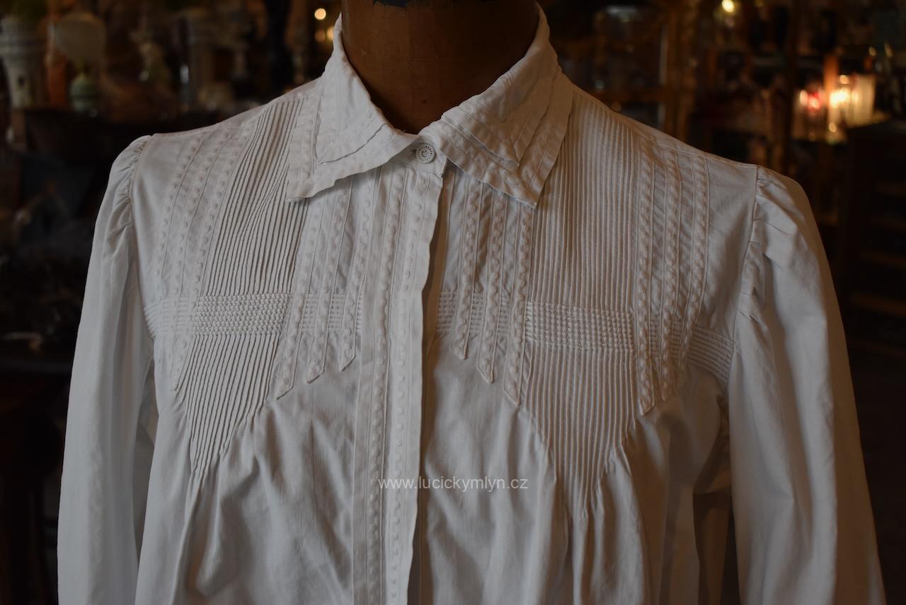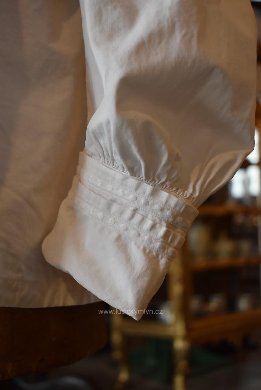 Krejčovské dílko z Moravy, pochází z měšťanského nebo bohatšího venkovského prostředí. Košilka byla decentně plasticky oživena celou soustavou vertikálně vedeného lemování a prošívání. Originální společenské oblečení s vysokým podílem náročného ručního zpracování a výzdoby, pochází z období okolo roku 1910. Kratší starožitná košilka se díky pečlivosti minimálně dvou generací, zachovala ve velmi dobrém původním stavu a je po vyprání.