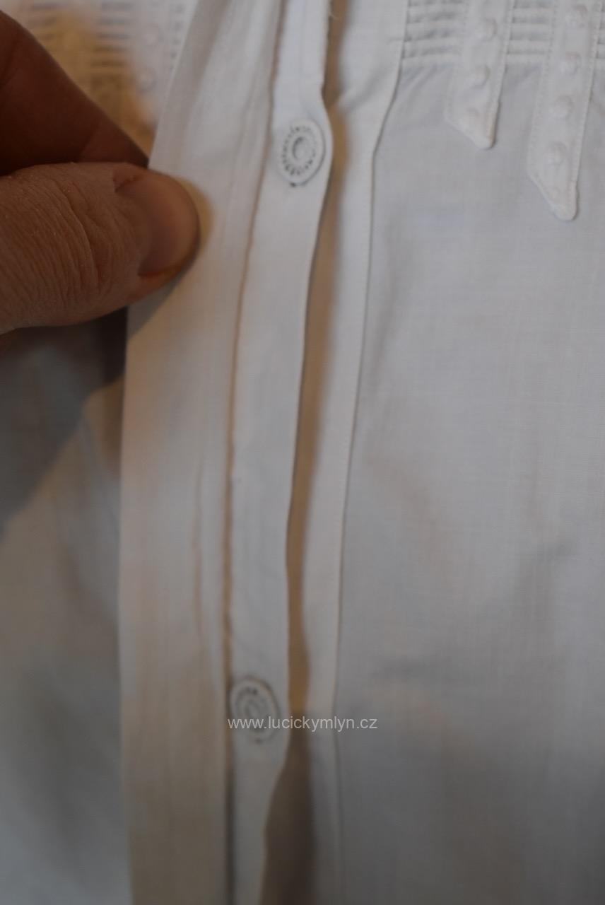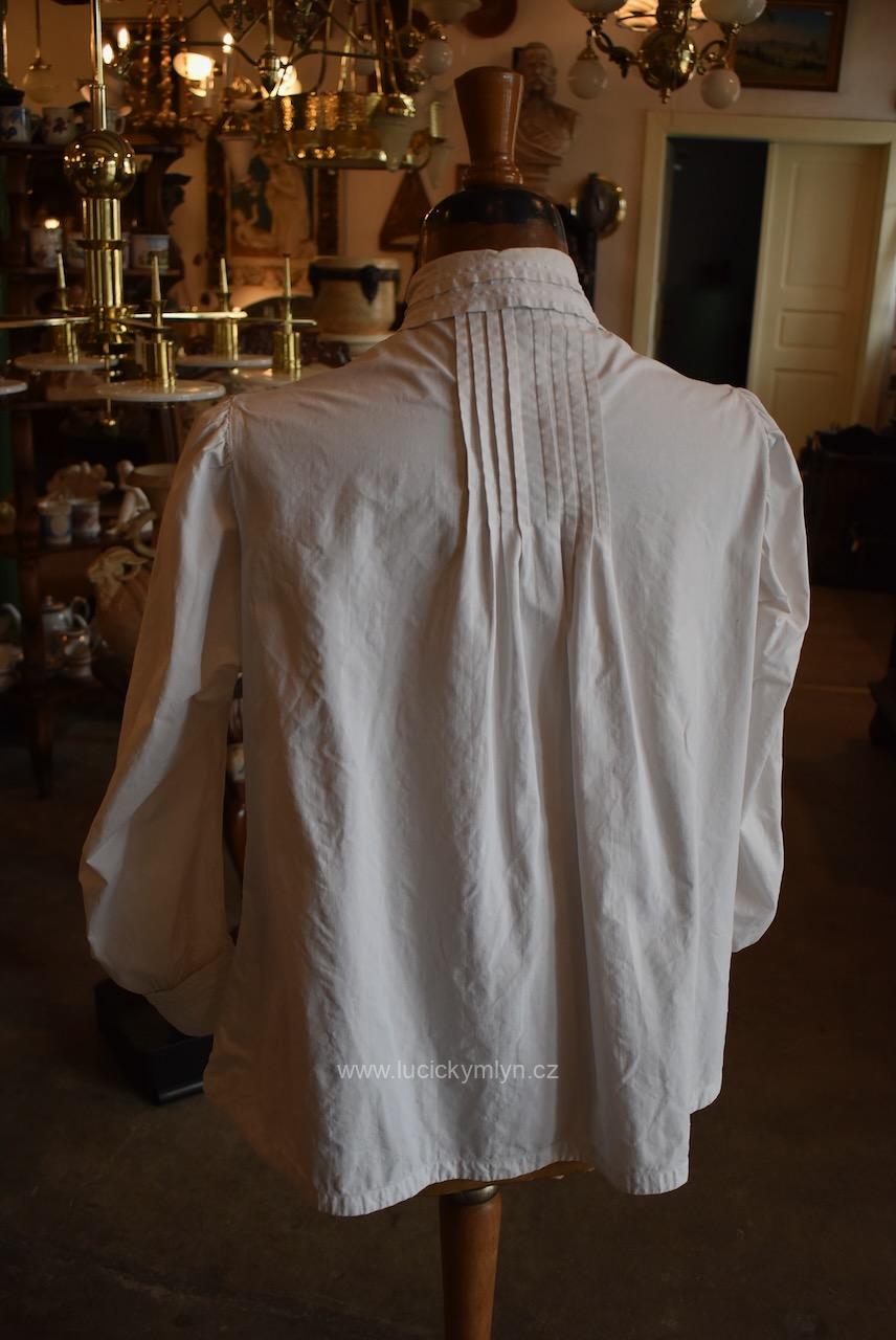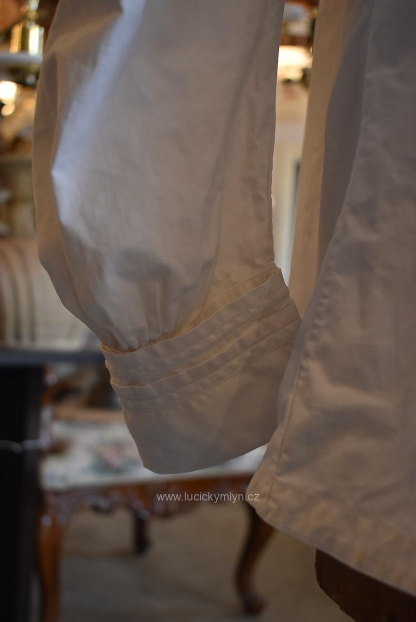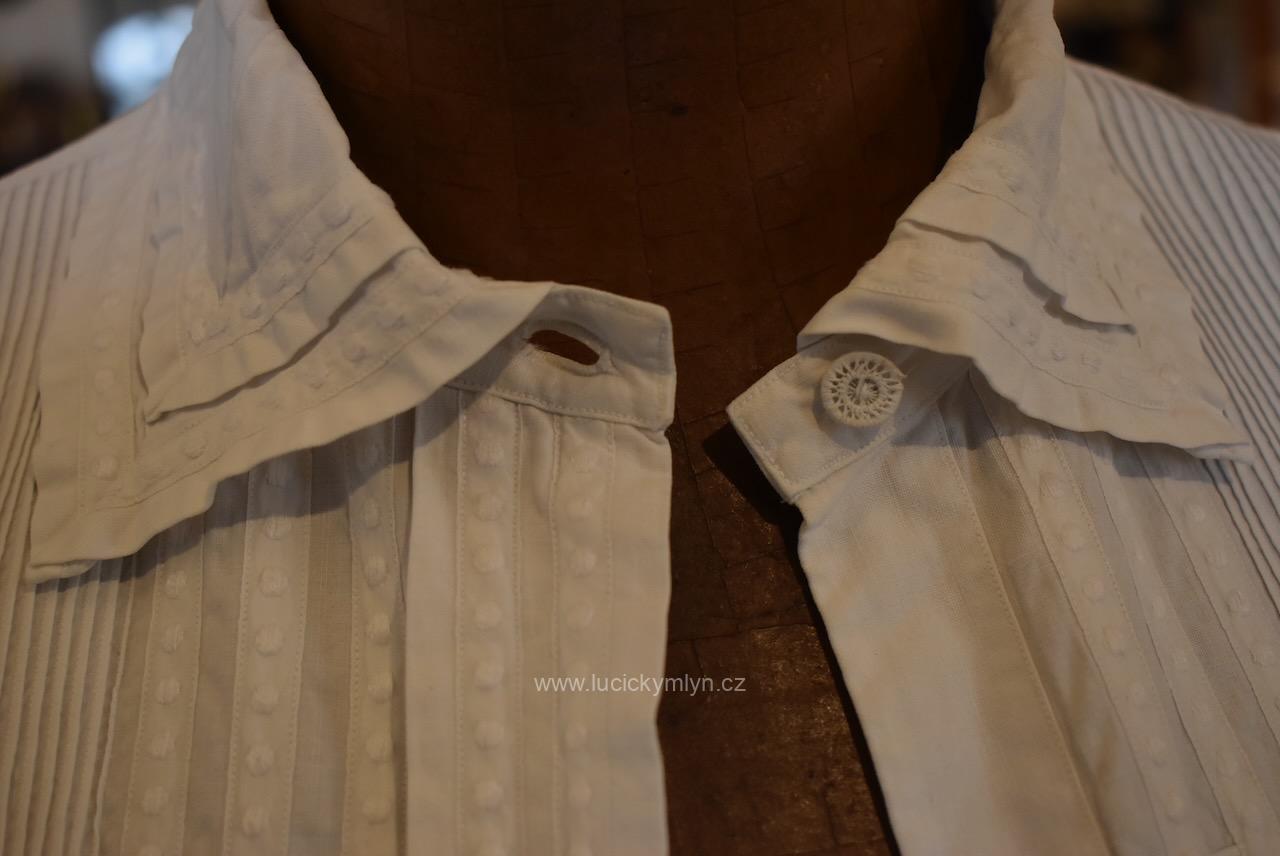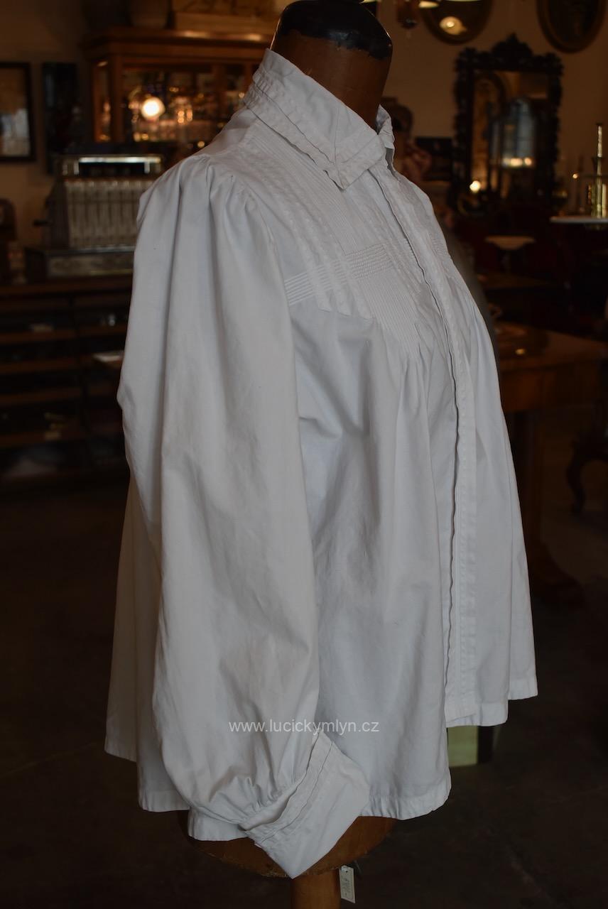 Krejčovské dílko z Moravy, pochází z měšťanského nebo bohatšího venkovského prostředí. Košilka byla decentně plasticky oživena celou soustavou vertikálně vedeného lemování a prošívání. Originální společenské oblečení s vysokým podílem náročného ručního zpracování a výzdoby, pochází z období okolo roku 1910. Kratší starožitná košilka se díky pečlivosti minimálně dvou generací, zachovala ve velmi dobrém původním stavu a je po vyprání.