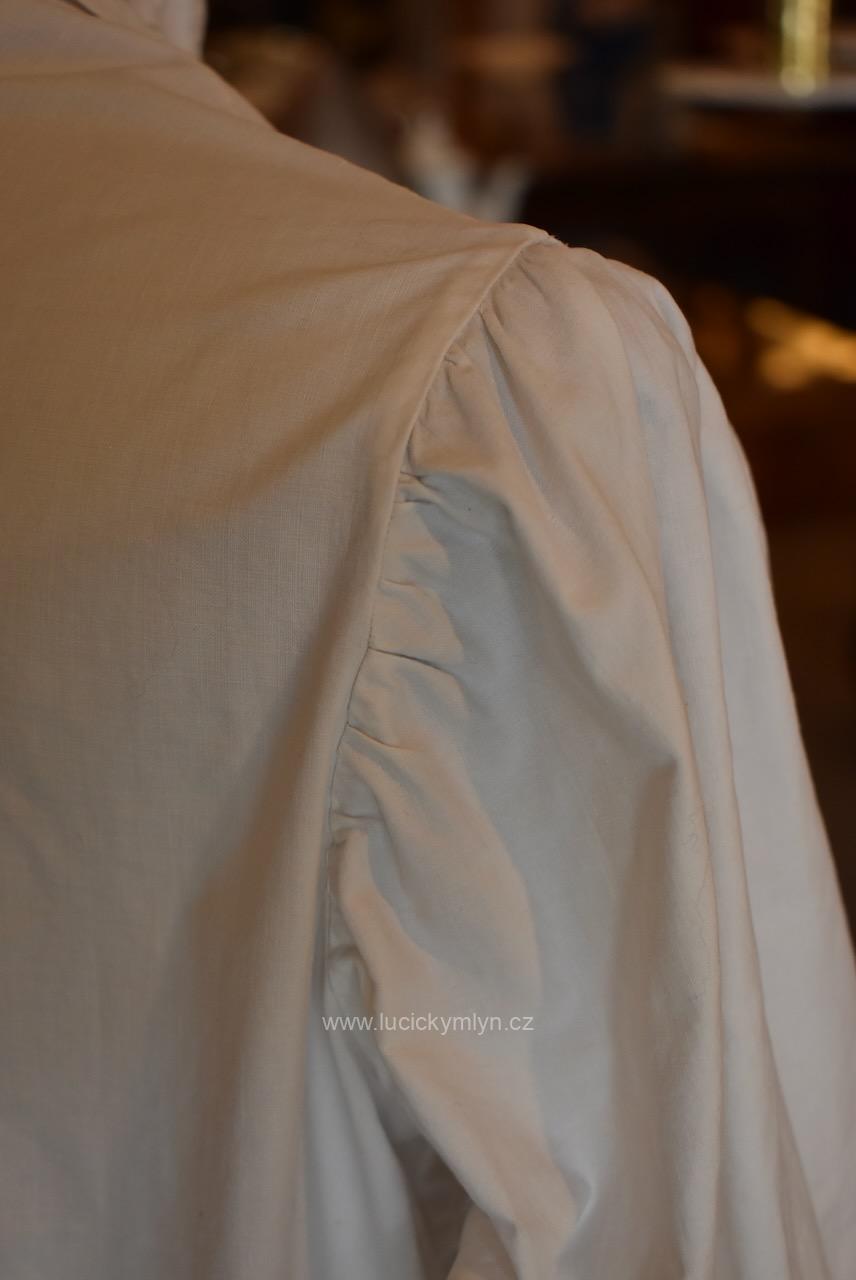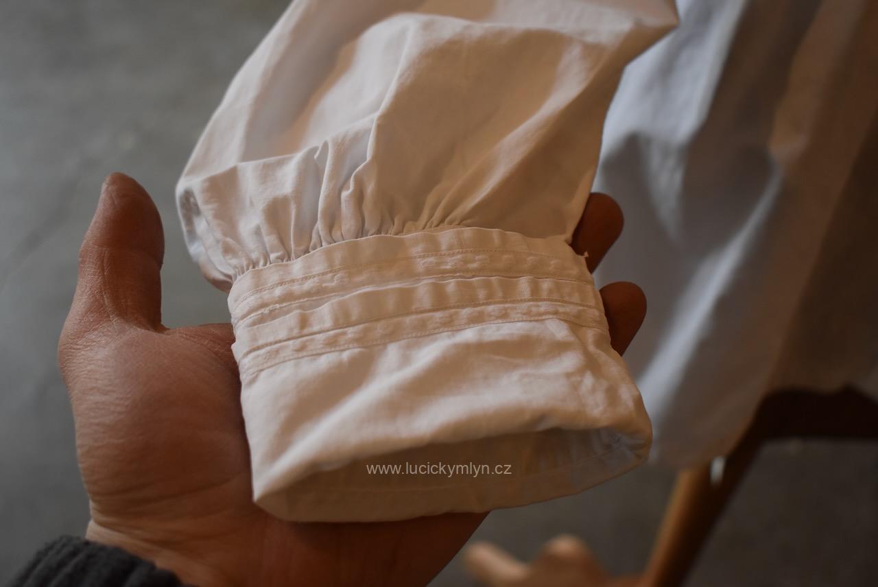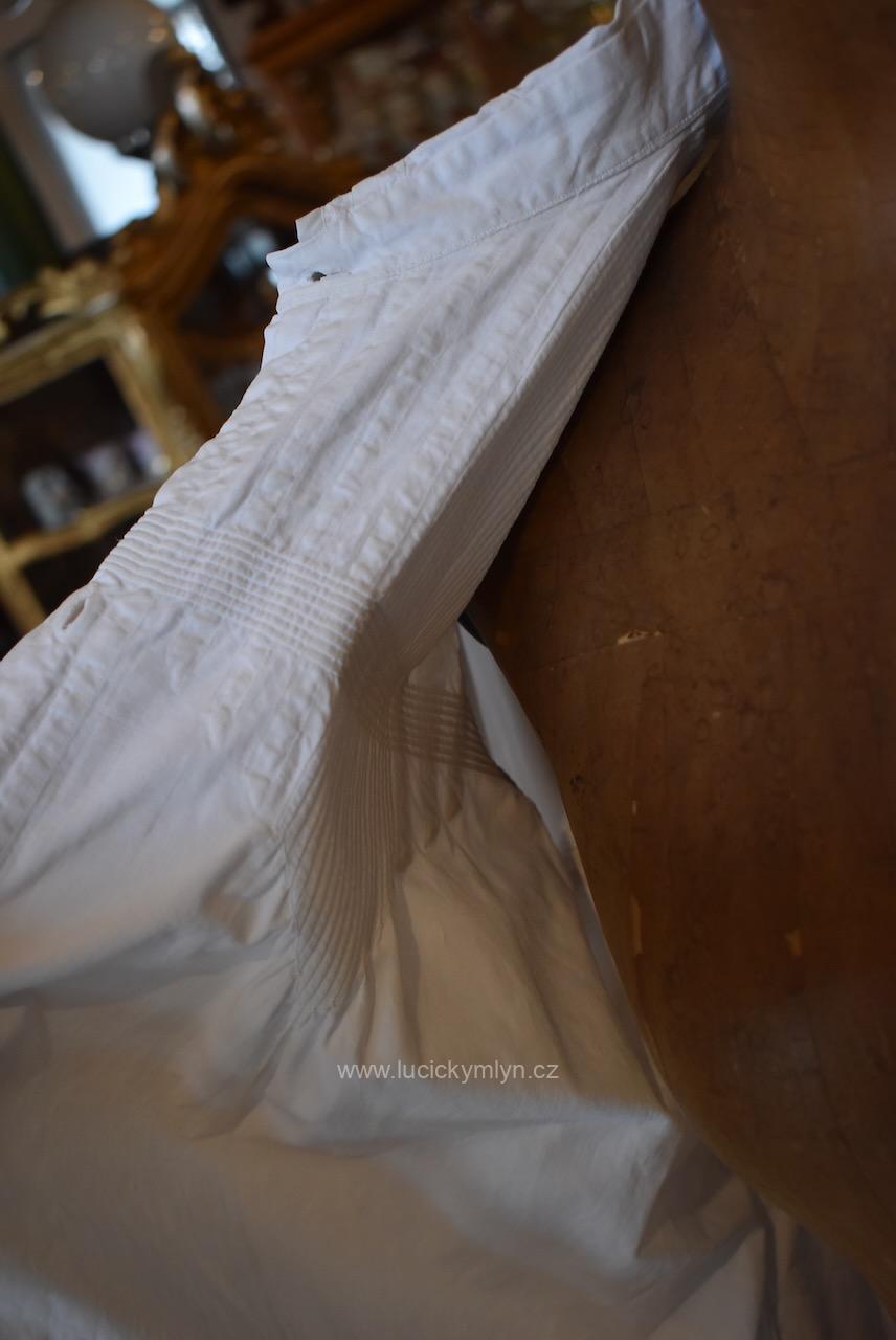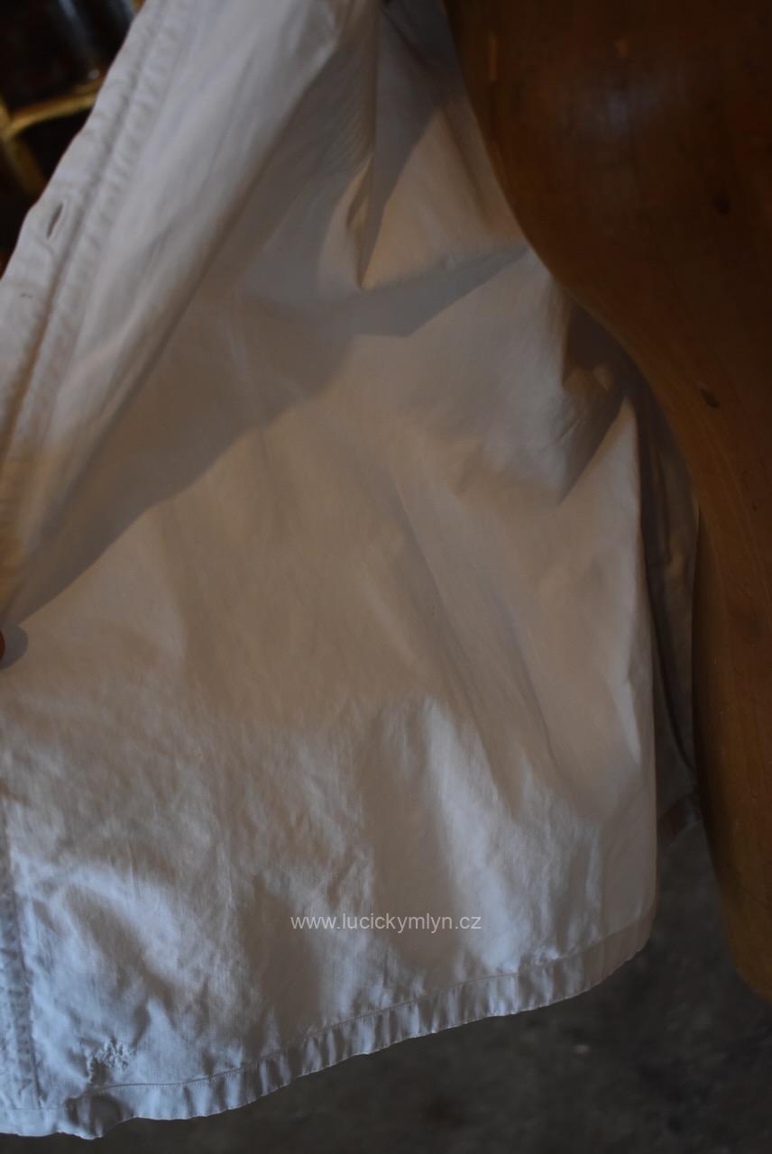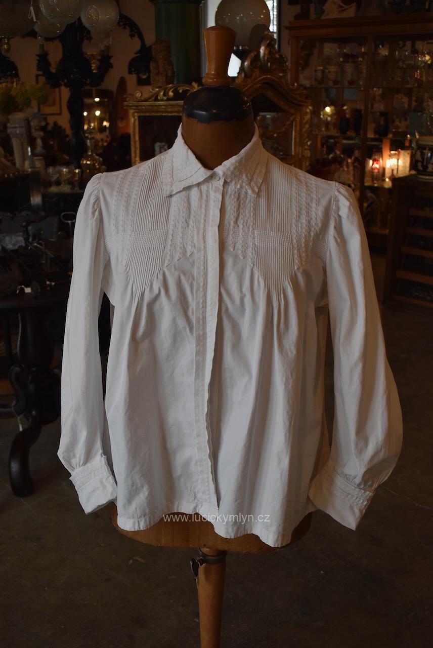 Krejčovské dílko z Moravy, pochází z měšťanského nebo bohatšího venkovského prostředí. Košilka byla decentně plasticky oživena celou soustavou vertikálně vedeného lemování a prošívání. Originální společenské oblečení s vysokým podílem náročného ručního zpracování a výzdoby, pochází z období okolo roku 1910. Kratší starožitná košilka se díky pečlivosti minimálně dvou generací, zachovala ve velmi dobrém původním stavu a je po vyprání.