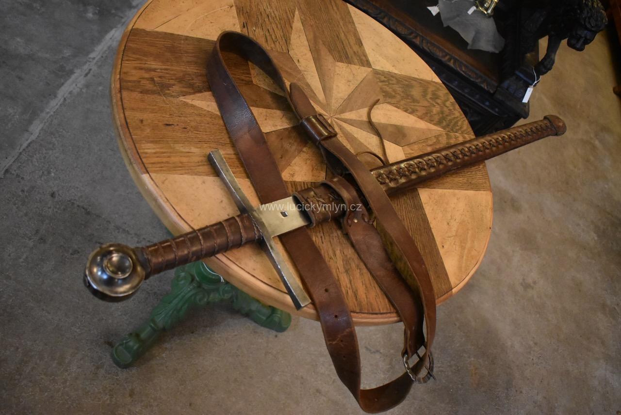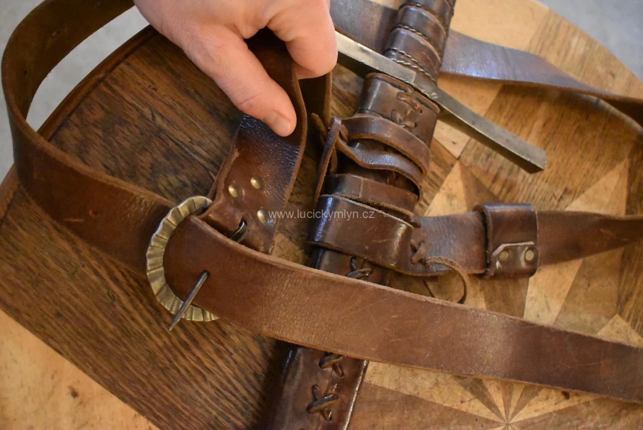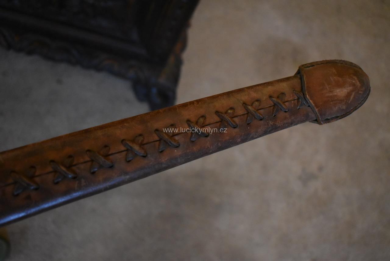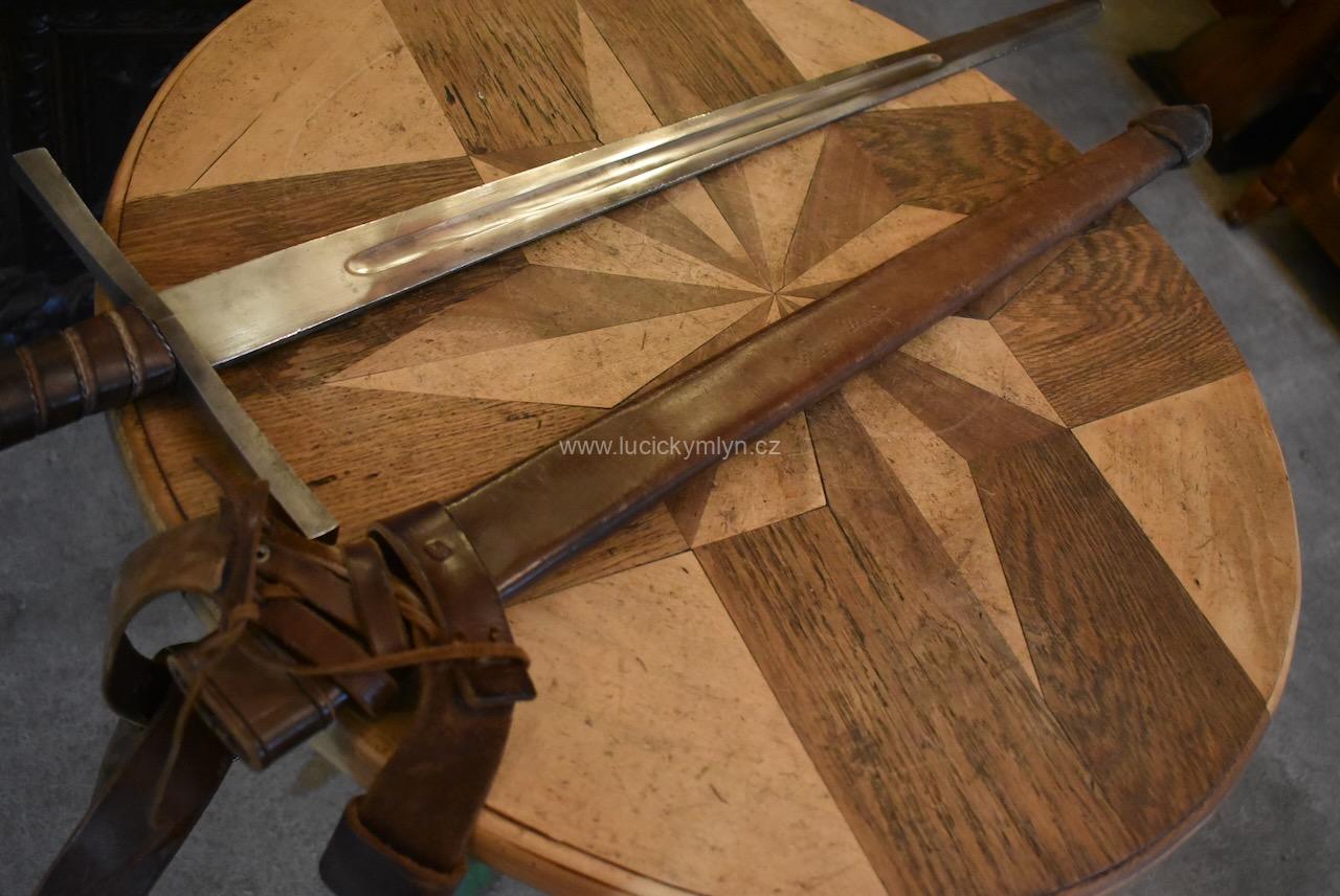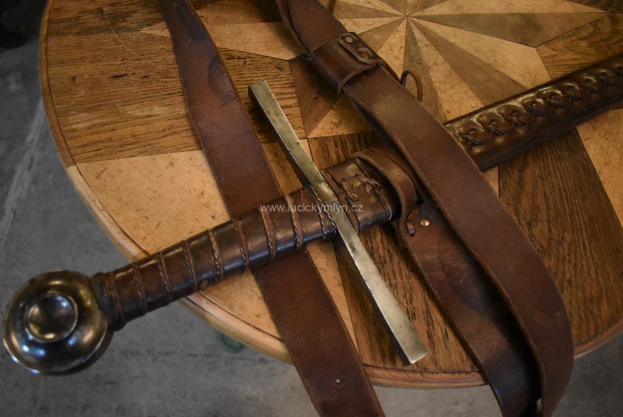 Historická kopie jeden a půl ručního středověkého meče s koženou pochvou užívaná pro potřebu historického šermu