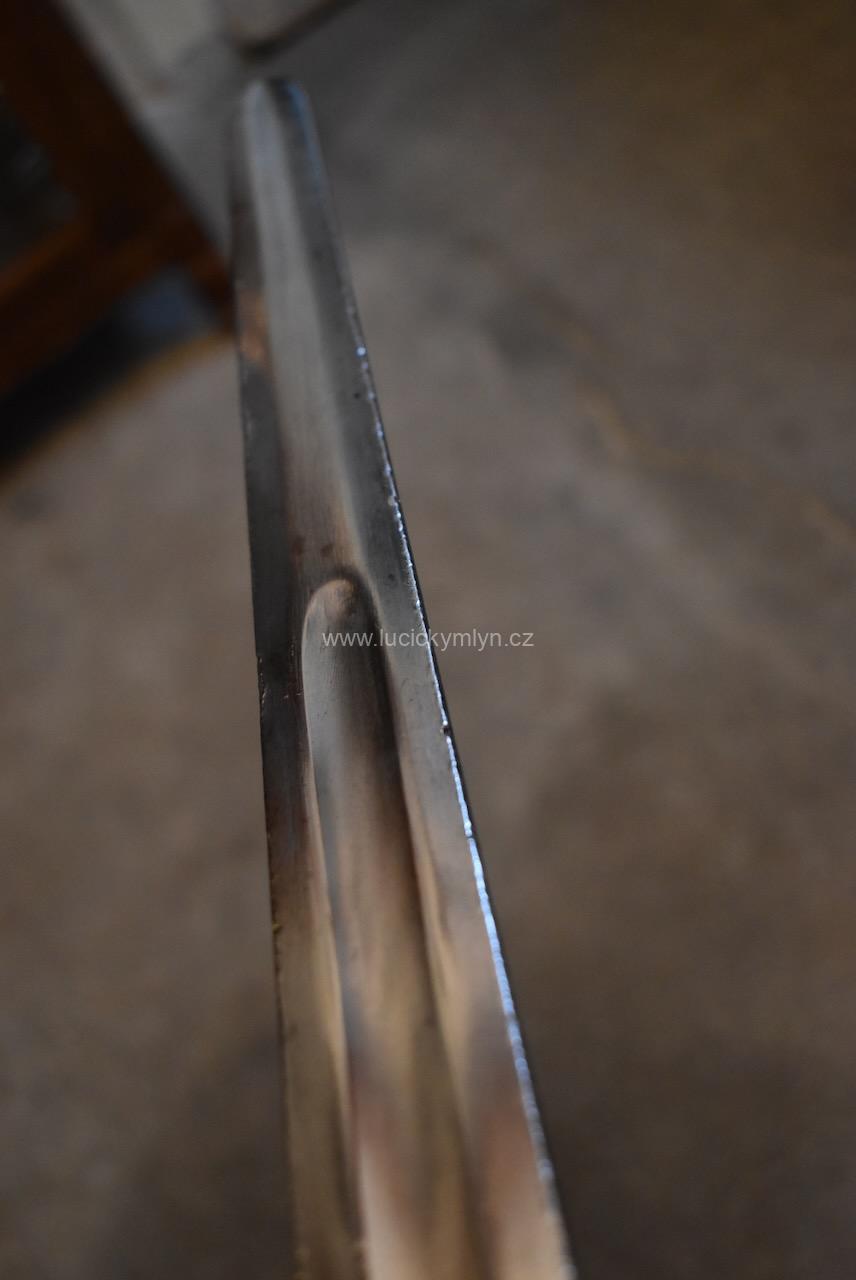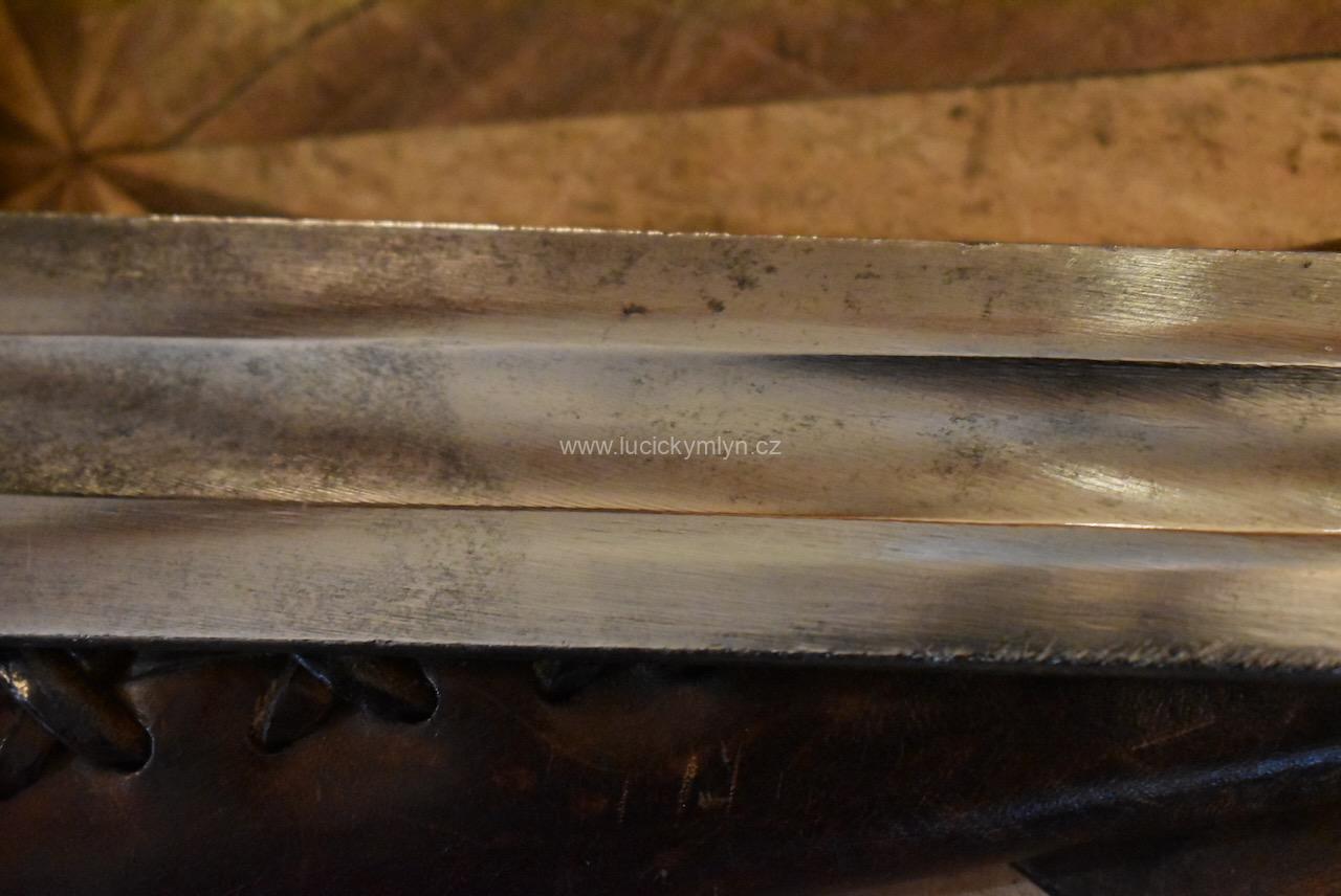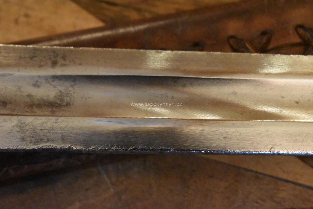 Kvalitní a dlouhý ocelový meč nese na svém záměrně tupém ostří větší množství stop po mnoha sezónách profesionálně inscenovaných šermířských soubojů. Tento meč ze 2. pol. 20. stol. byl záměrně vyrobený pro šermířské souboje a díky použité pružnější speciální oceli, není jako jiné dekorativní meče křehký. Na čepeli je ražená čtvercová značka specializovaného výrobce.