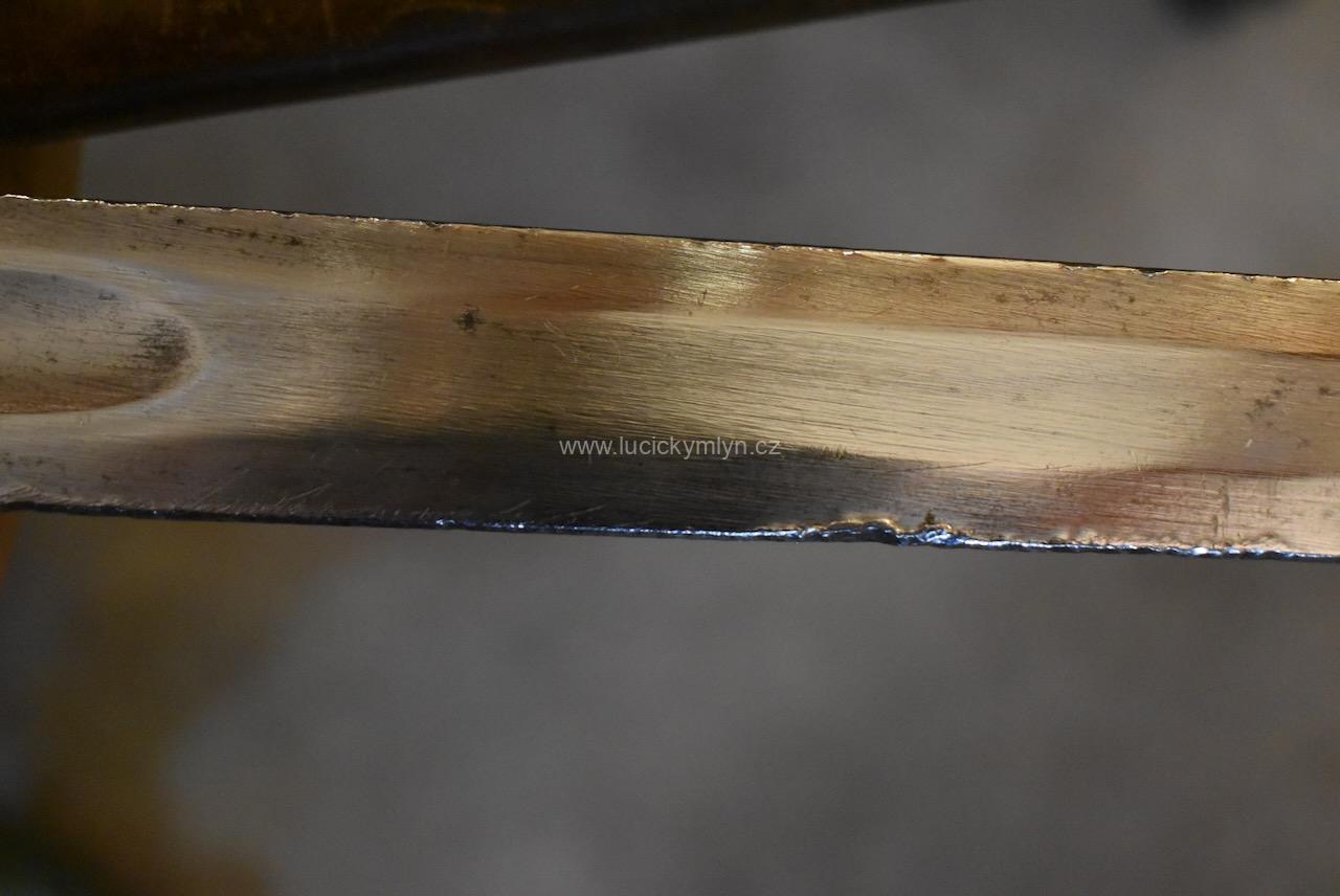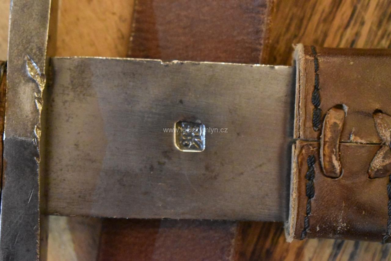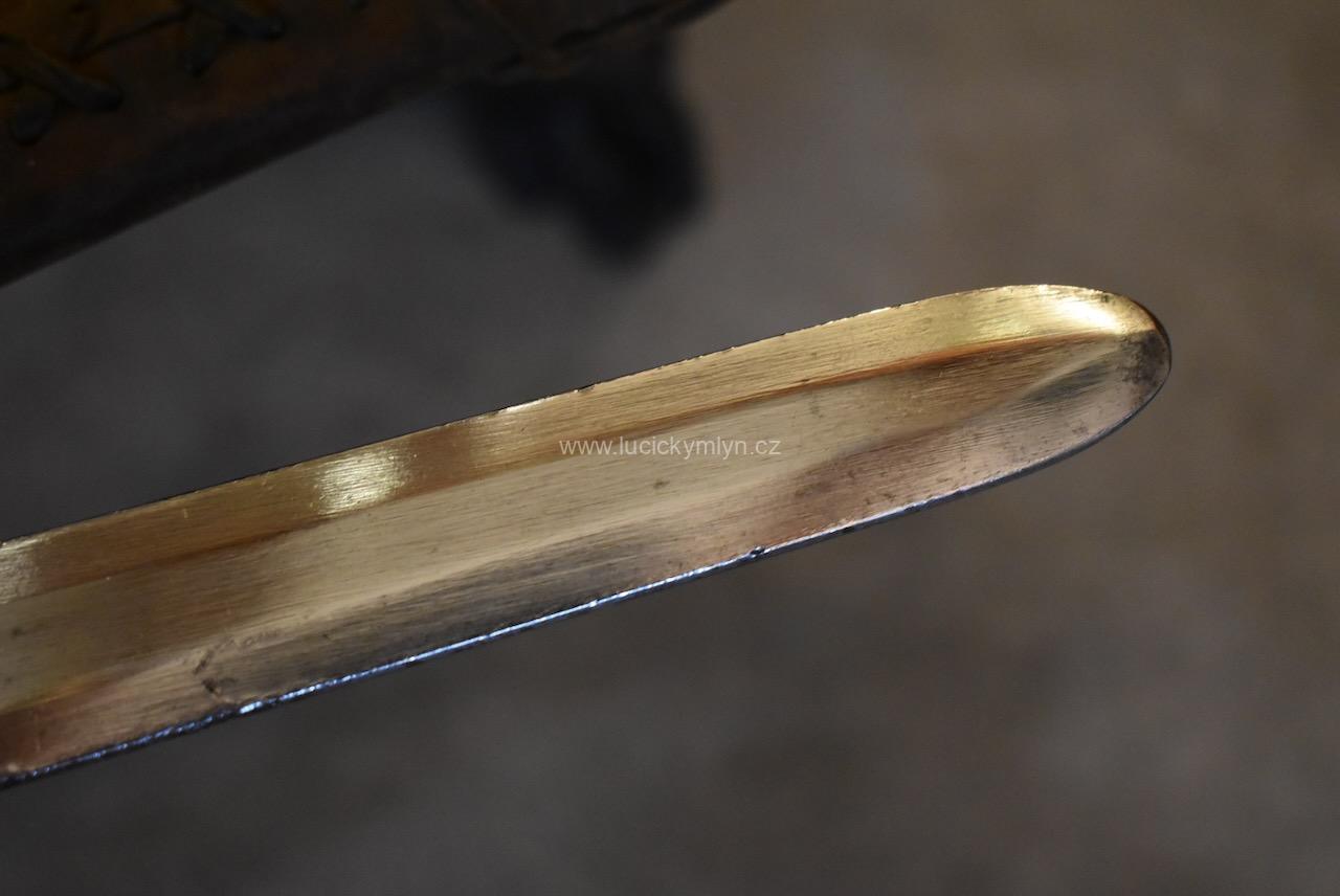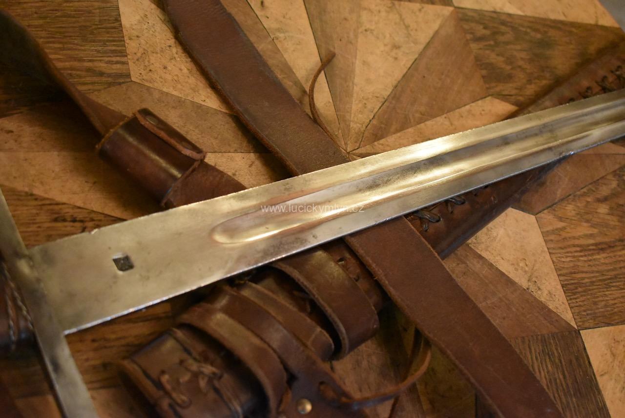 Kvalitní a dlouhý ocelový meč nese na svém záměrně tupém ostří větší množství stop po mnoha sezónách profesionálně inscenovaných šermířských soubojů. Tento meč ze 2. pol. 20. stol. byl záměrně vyrobený pro šermířské souboje a díky použité pružnější speciální oceli, není jako jiné dekorativní meče křehký. Na čepeli je ražená čtvercová značka specializovaného výrobce.