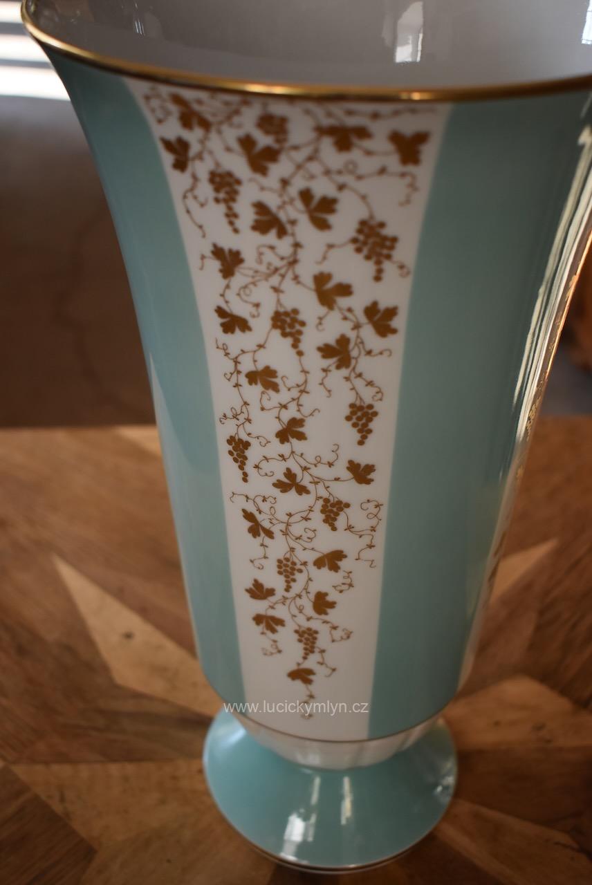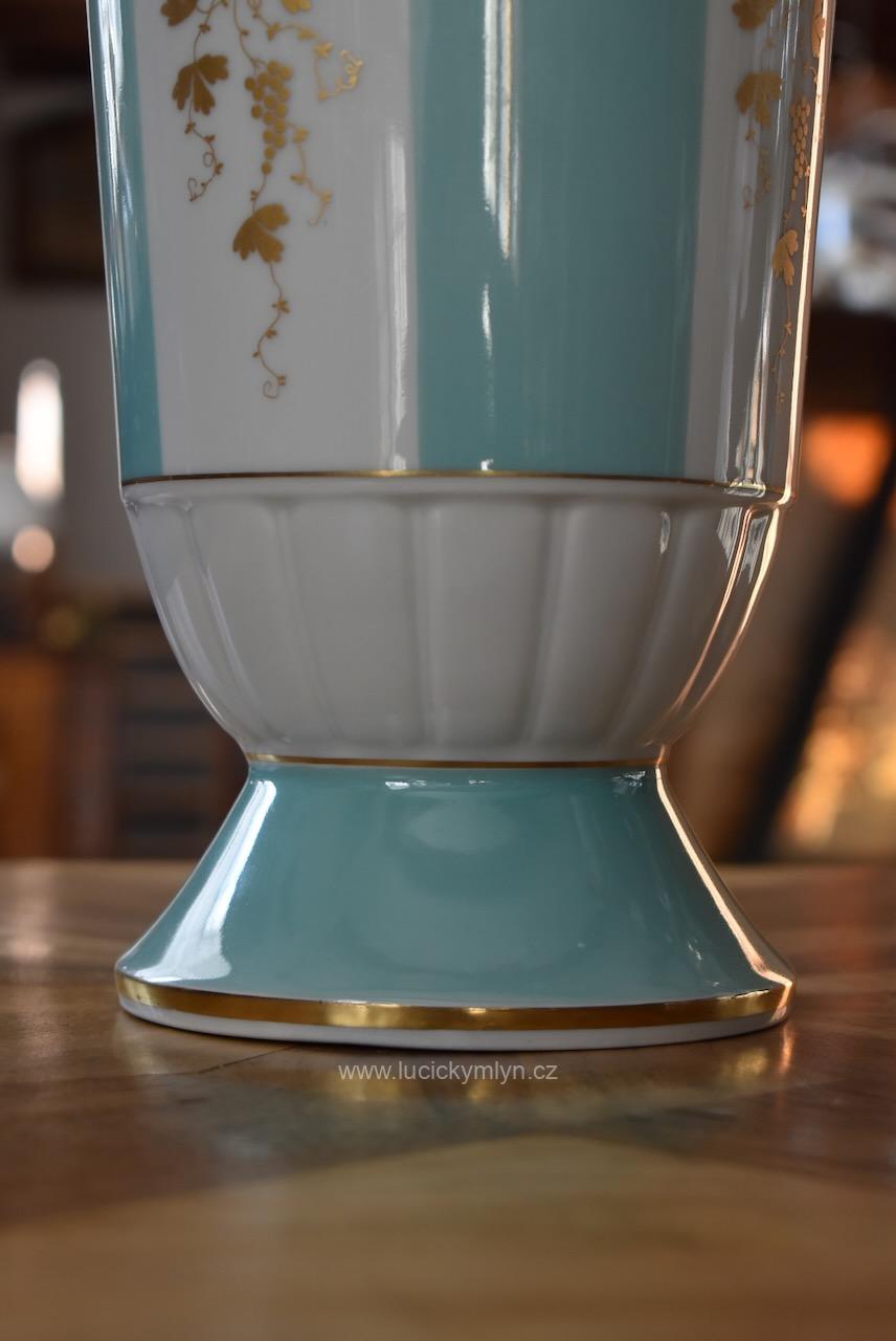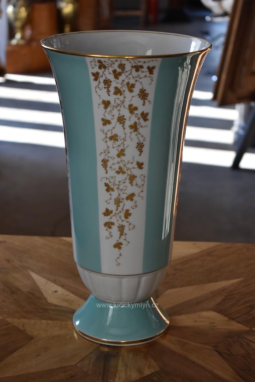 Elegantní porcelánová váza stabilně usazená na kulaté kónické základně, pochází z porcelánky v německém městečku Lichte, jejíž kořeny sahají k manufaktuře Gebrüder Heubach založené již v roce 1822. Hezká váza vhodná na velkou kytici, nese zelenou podglazurní značku „Lichte VEB“ s motivem stylizovaného stromu, která se používala v podniku Volkseigener Betrieb až do roku 1965. Váza má zajímavě navrženou hladkou kónickou základu, jež přechází do plasticky ztvárněného a bílého prstence ve tvaru přivřeného květu s úzkými okvětními lístky. Od tohoto výrazného a z antiky převzatého prvku se pásově vybarvené válcové tělo vázy, jen velmi pozvolna rozšiřuje, aby se na konec pohárovitě rozevřelo. Nadčasově navržený bílý porcelán, směle užívá odstínu světle tyrkysové, jež se střídá s bílými pruhy tradičně oživenými decentně zlaceným dekorem vinné révy s jemným listovím a bohatými hrozny. Široké hrdlo i okraj patky jsou zvýrazněny zlatou linkou. Díky štíhlým a elegantním proporcím i decentnímu, přitom reprezentativnímu zdobení se malovaná váza může používat jak pro vyšší kytice (růže, gladioly), tak jako samostatný dekorativní objekt v oblíbeném retro stylu 50.–60. let. Kvalitní porcelán směle navazující na prvorepublikový styl ART-DECO, pěkně doplní interiér laděný do mid‑century či klasického retra. Nepoškozeno.