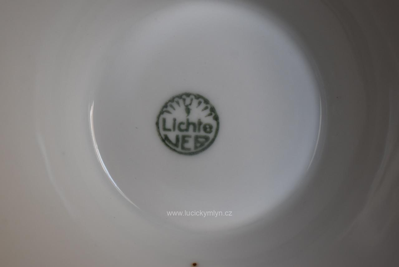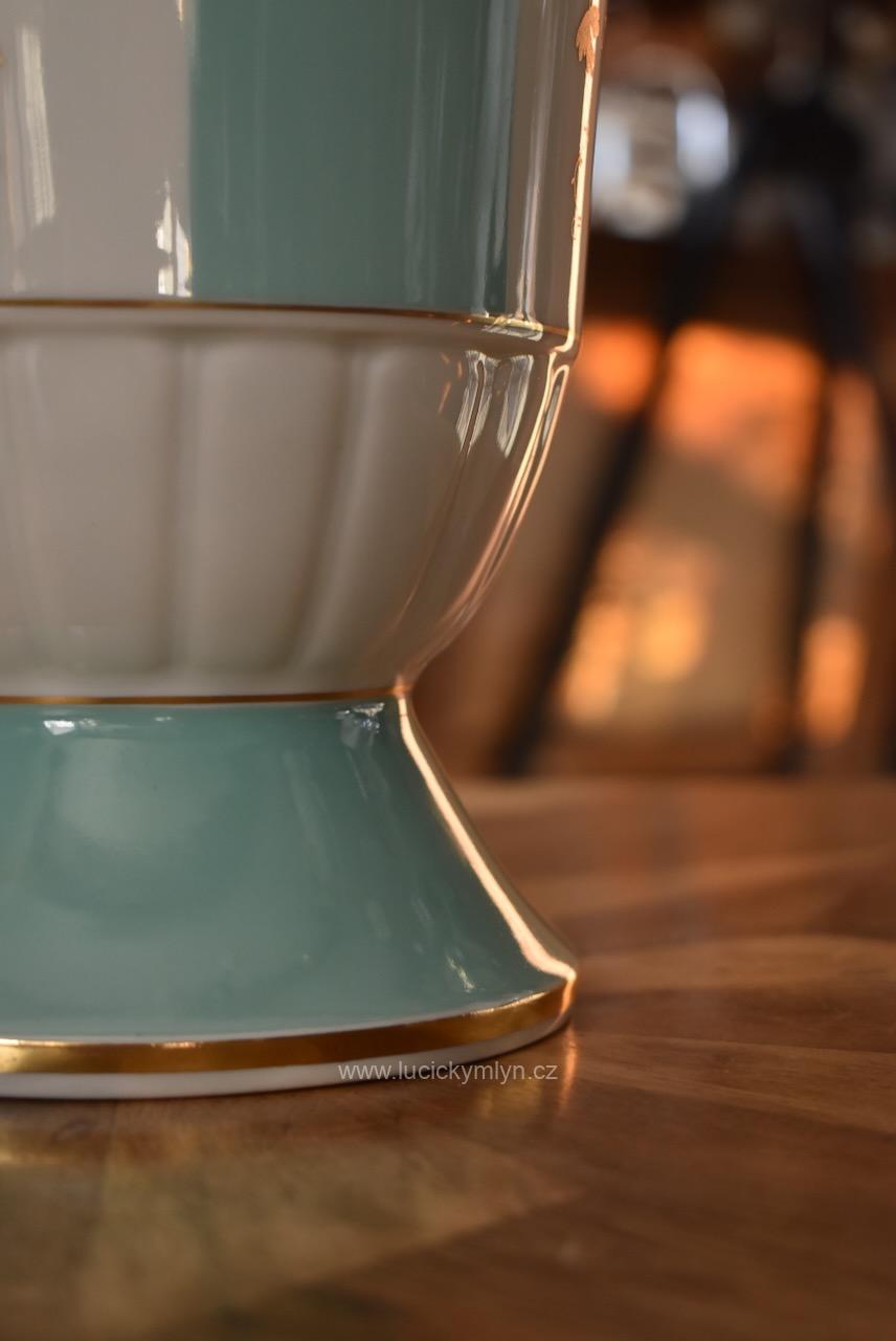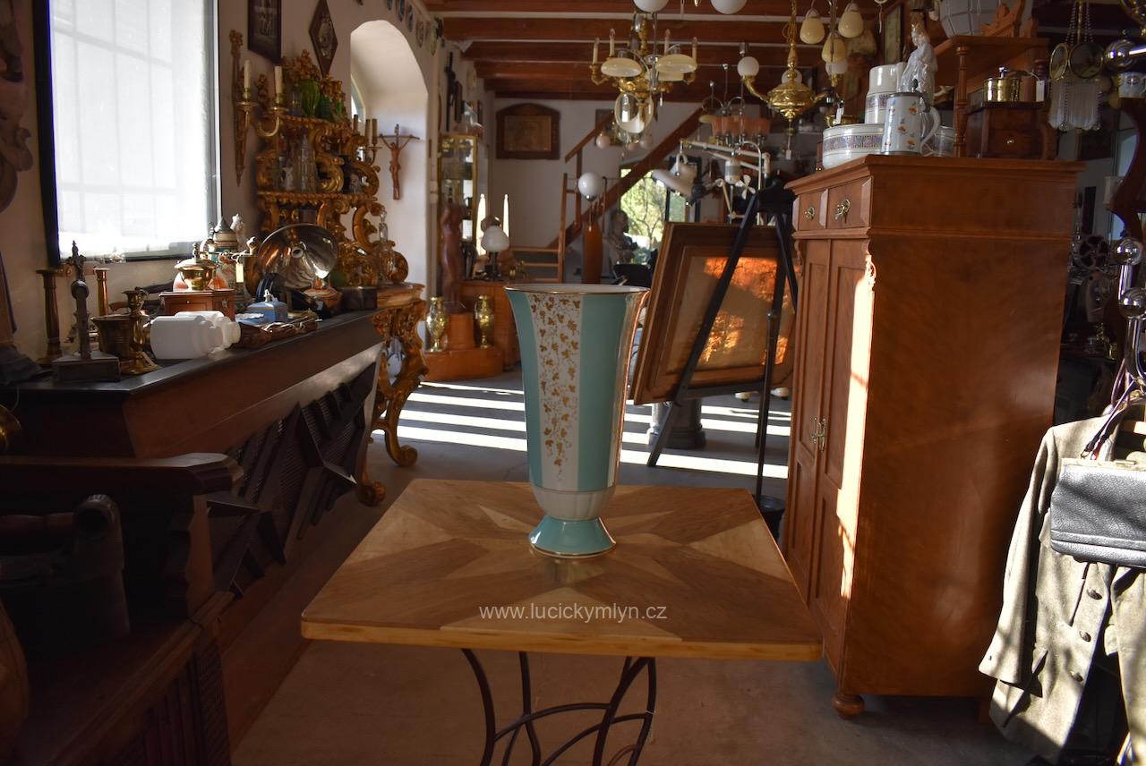 Elegantní porcelánová váza stabilně usazená na kulaté kónické základně, pochází z porcelánky v německém městečku Lichte, jejíž kořeny sahají k manufaktuře Gebrüder Heubach založené již v roce 1822. Hezká váza vhodná na velkou kytici, nese zelenou podglazurní značku „Lichte VEB“ s motivem stylizovaného stromu, která se používala v podniku Volkseigener Betrieb až do roku 1965. Váza má zajímavě navrženou hladkou kónickou základu, jež přechází do plasticky ztvárněného a bílého prstence ve tvaru přivřeného květu s úzkými okvětními lístky. Od tohoto výrazného a z antiky převzatého prvku se pásově vybarvené válcové tělo vázy, jen velmi pozvolna rozšiřuje, aby se na konec pohárovitě rozevřelo. Nadčasově navržený bílý porcelán, směle užívá odstínu světle tyrkysové, jež se střídá s bílými pruhy tradičně oživenými decentně zlaceným dekorem vinné révy s jemným listovím a bohatými hrozny. Široké hrdlo i okraj patky jsou zvýrazněny zlatou linkou. Díky štíhlým a elegantním proporcím i decentnímu, přitom reprezentativnímu zdobení se malovaná váza může používat jak pro vyšší kytice (růže, gladioly), tak jako samostatný dekorativní objekt v oblíbeném retro stylu 50.–60. let. Kvalitní porcelán směle navazující na prvorepublikový styl ART-DECO, pěkně doplní interiér laděný do mid‑century či klasického retra. Nepoškozeno.