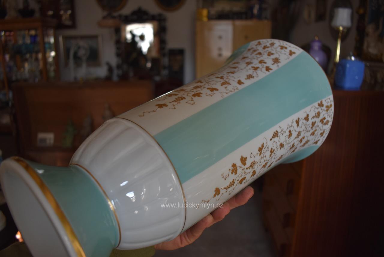 Nápadně větší a vkusná historická váza z bílého zlatou révou dekorovaného porcelánu symetricky oživená svěžími modrozelenými pásy i plasticky ztvárněným prstencem nad kónickou základnou – značeno Lichte VEB mezi lety 1950–1965