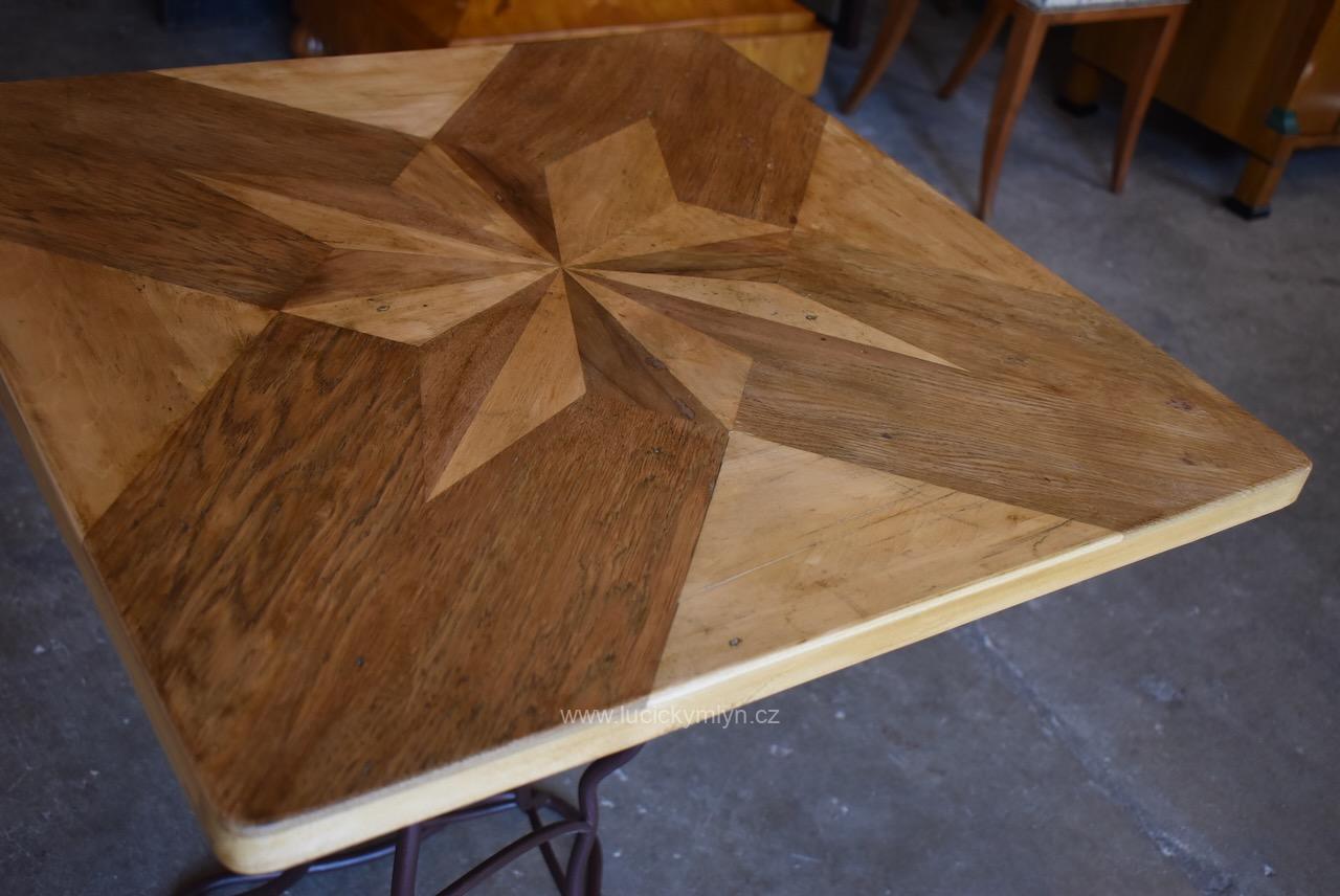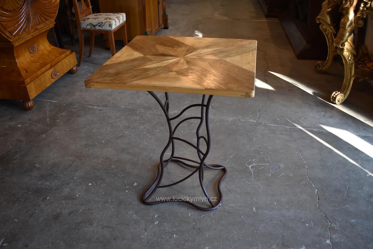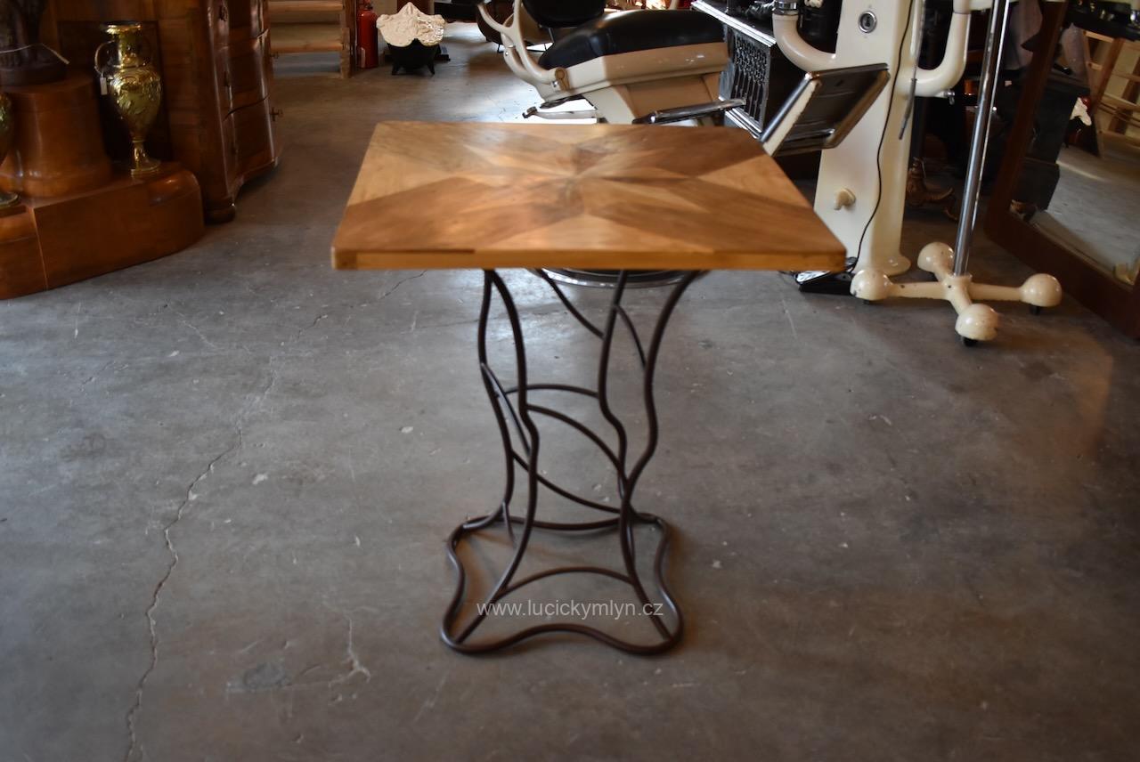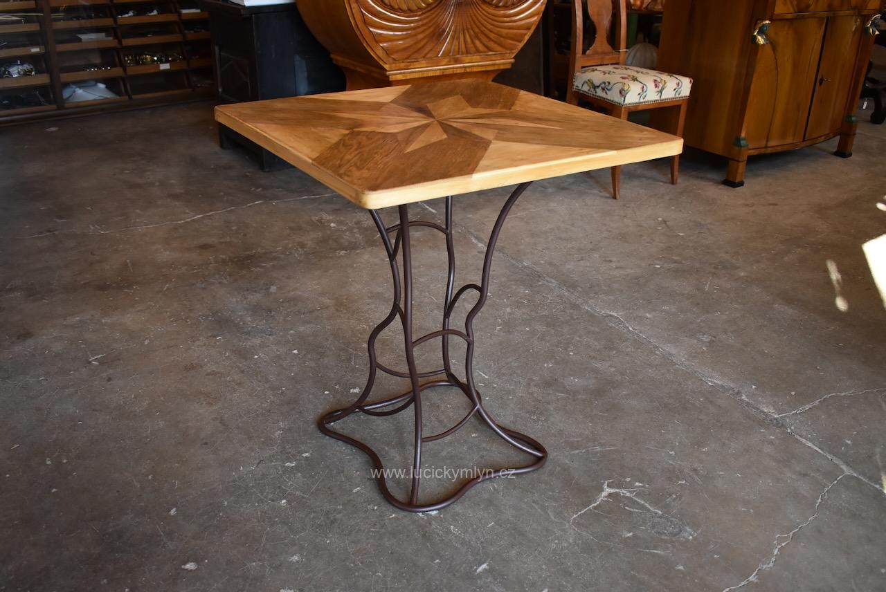 Vkusný a stabilní historický působivě ztvárněný stolek s vegetabilně pojatou podstavou z ohýbané a svařované železné kulatiny osazený originální zámeckou parketovou deskou s hvězdicí vykládanou z ušlechtilých dřev