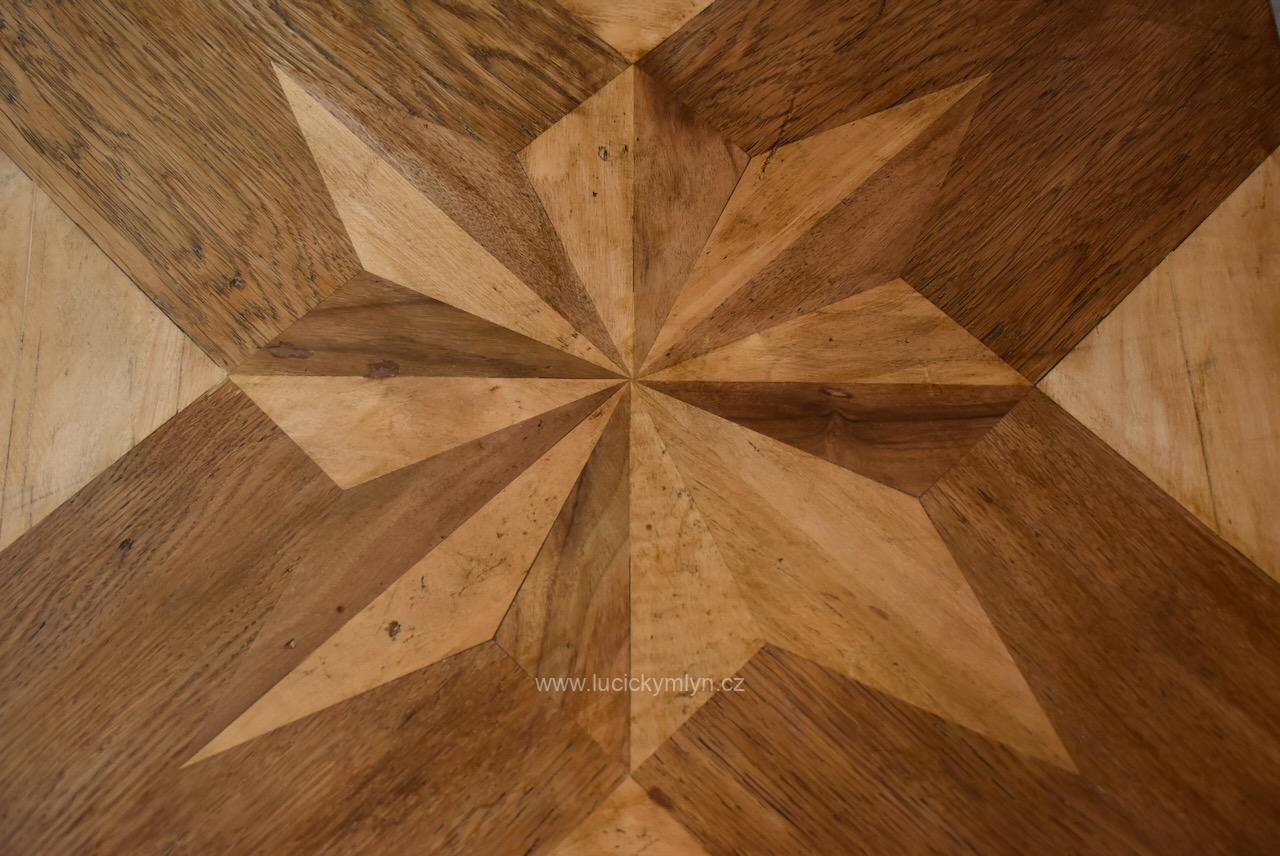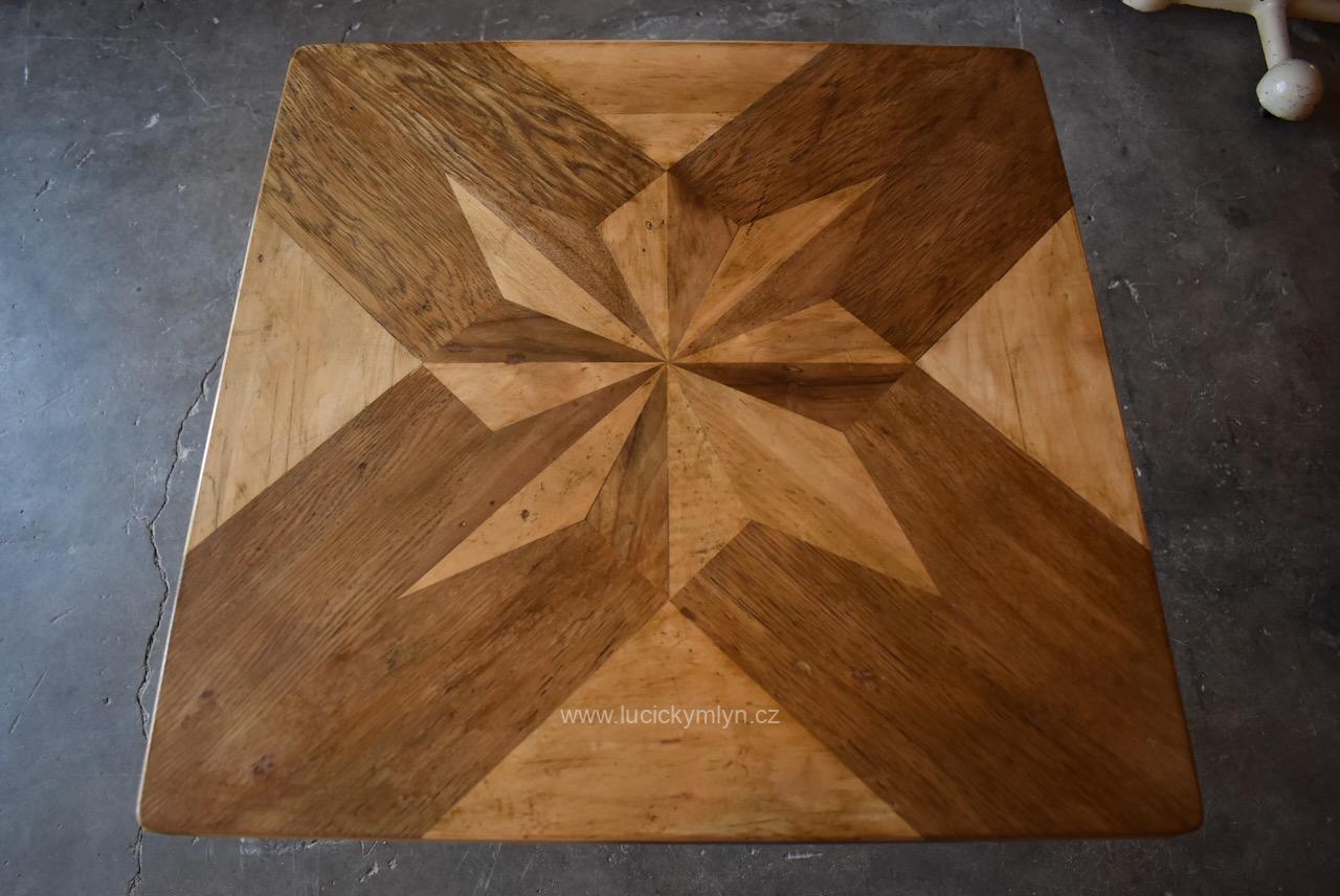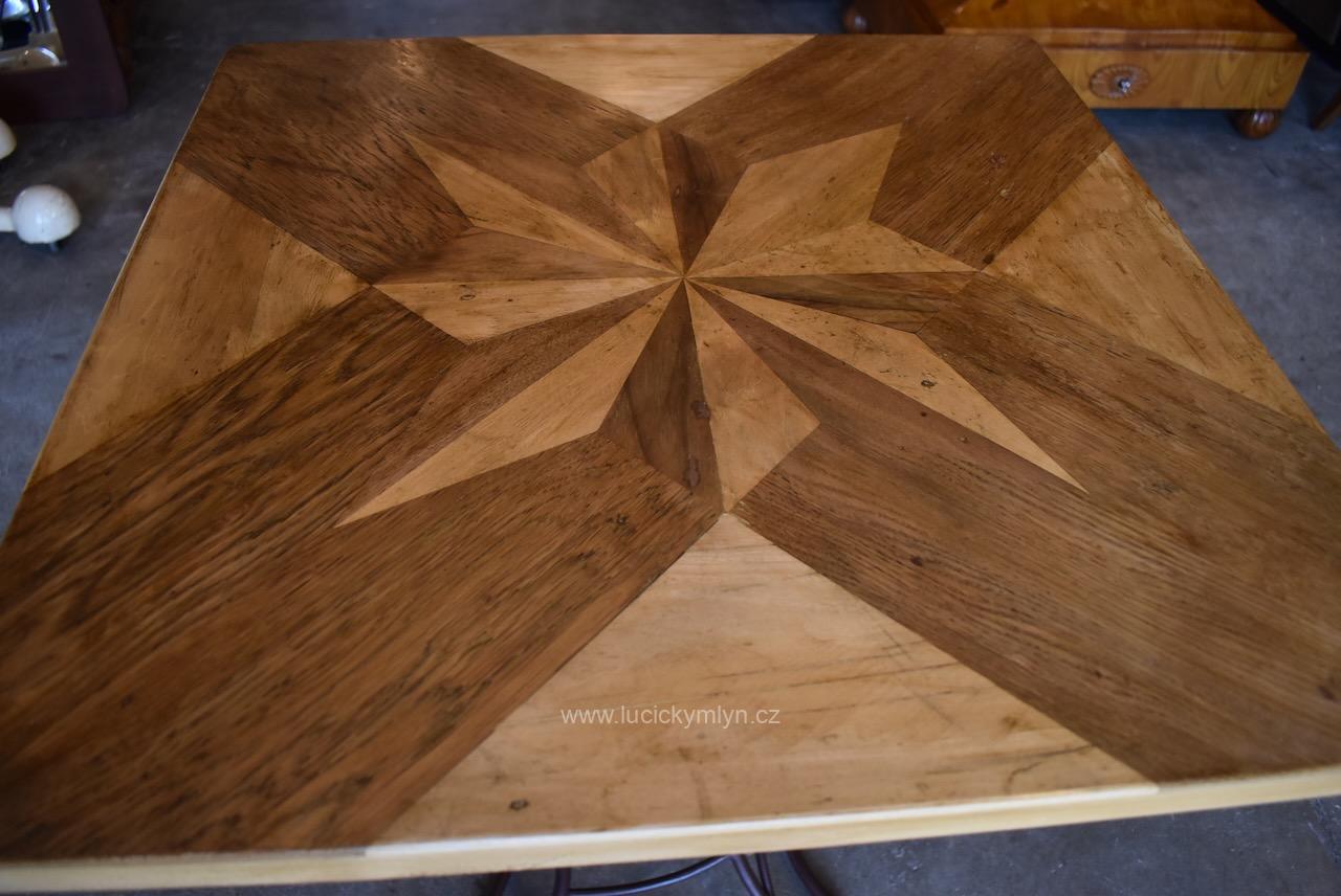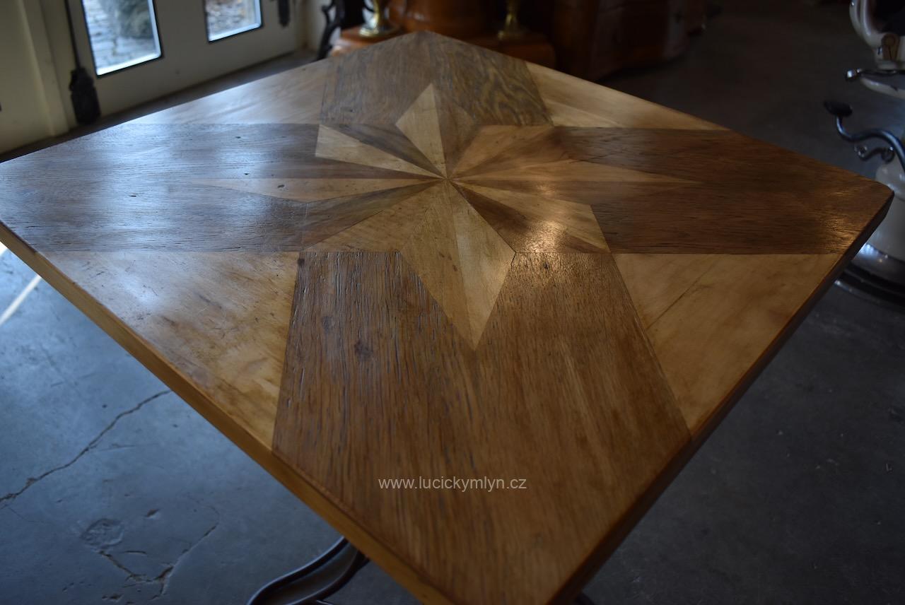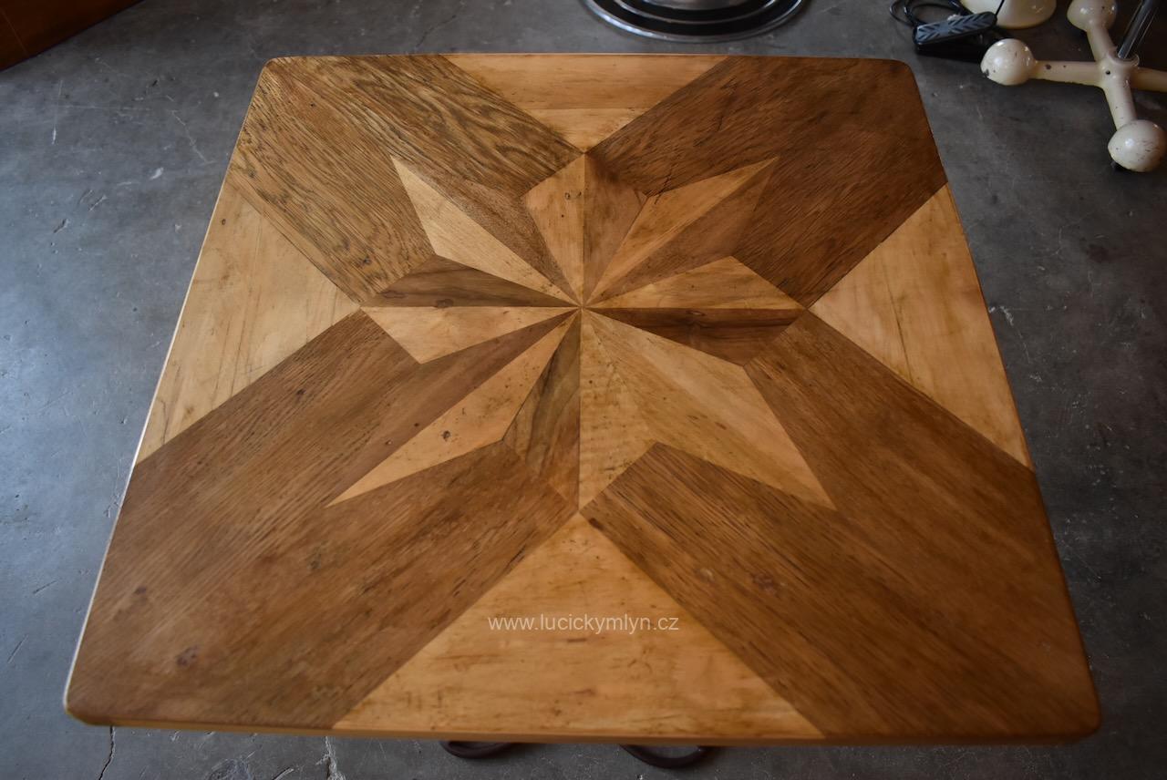 Vkusný a stabilní historický působivě ztvárněný stolek s vegetabilně pojatou podstavou z ohýbané a svařované železné kulatiny osazený originální zámeckou parketovou deskou s hvězdicí vykládanou z ušlechtilých dřev
