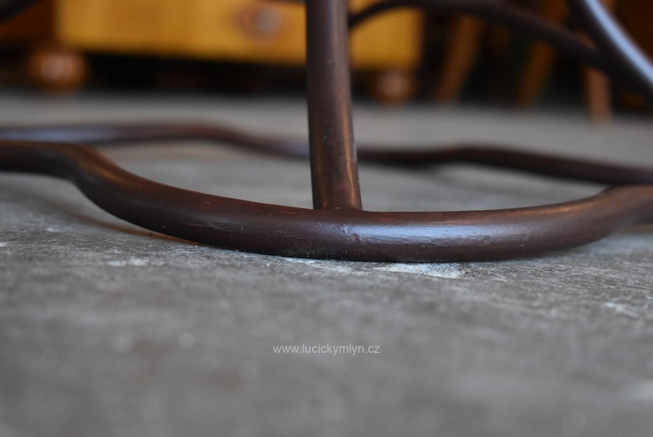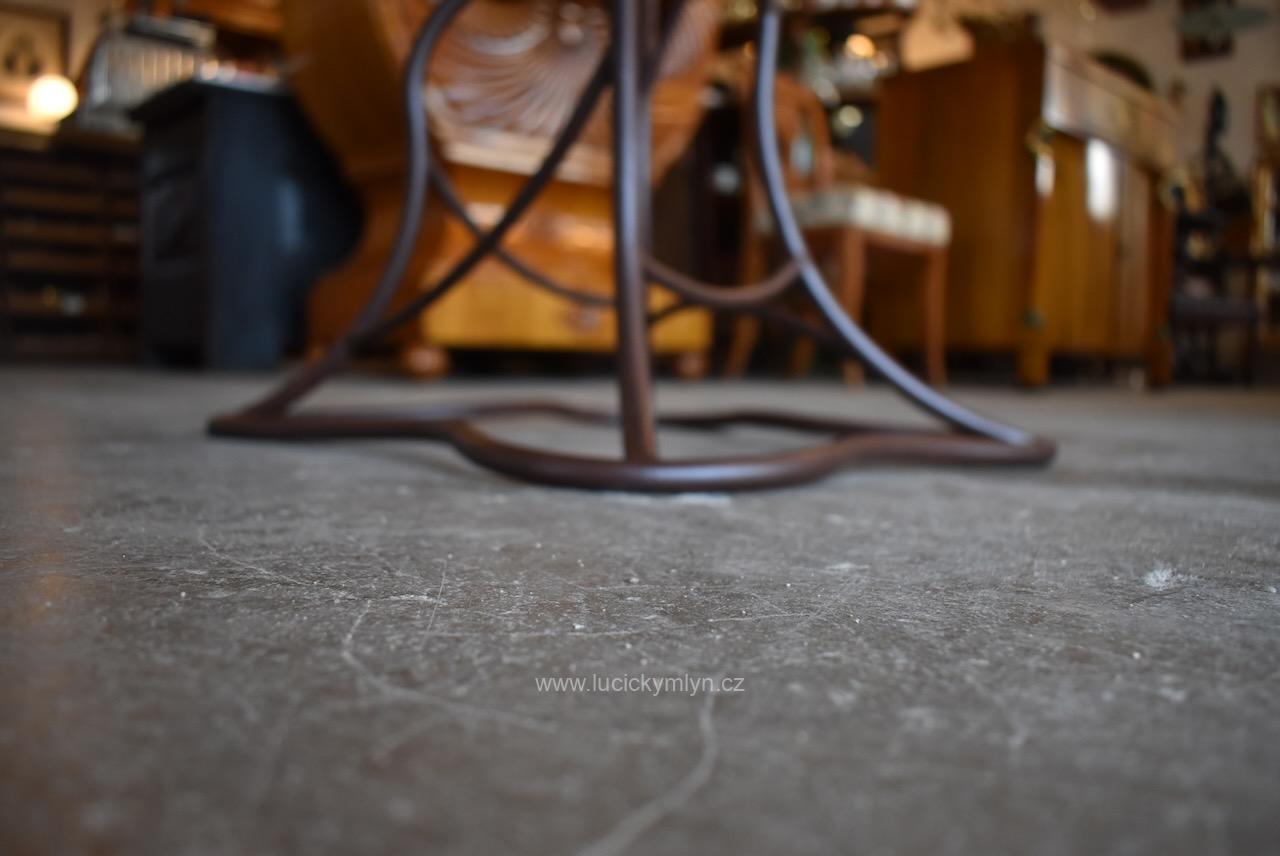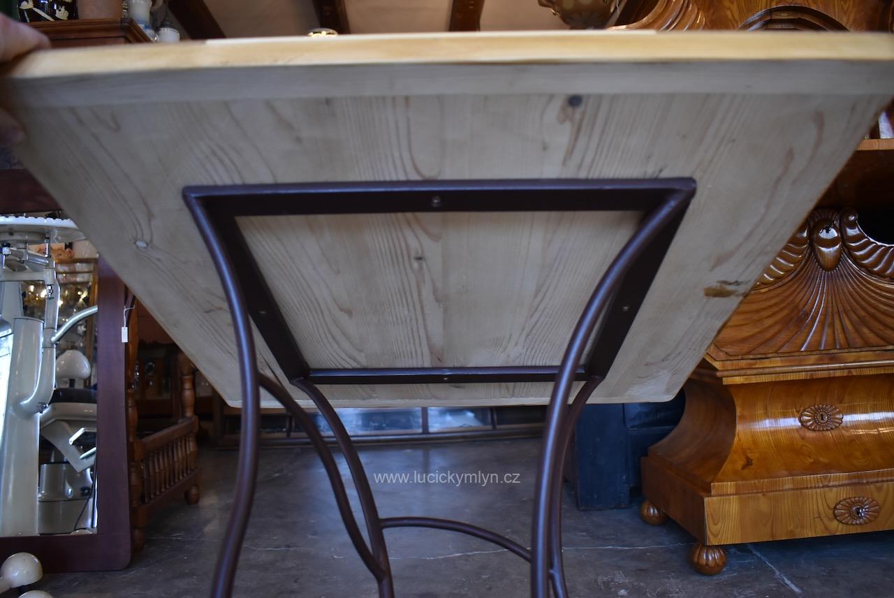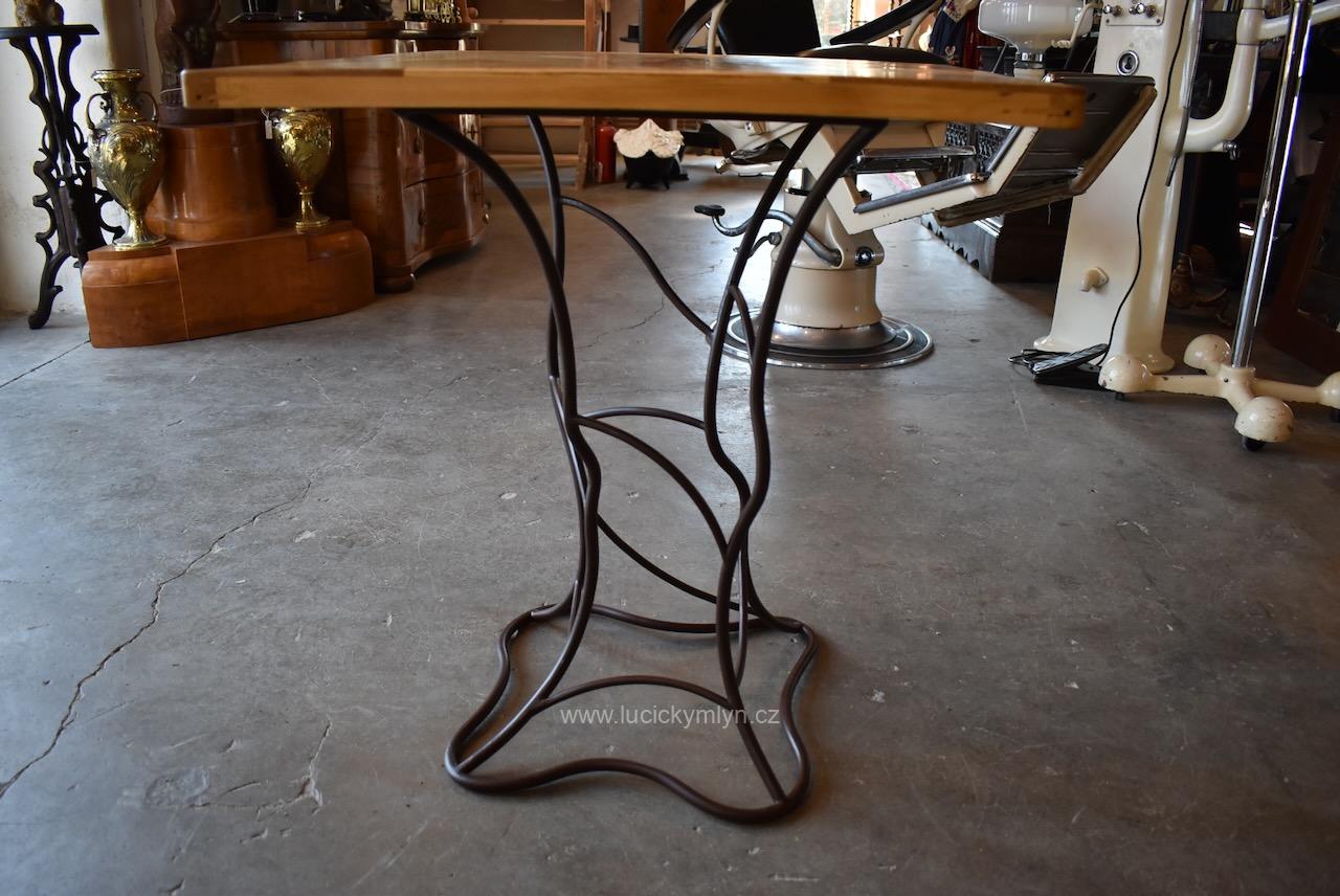 Čtyřboká, kovářsky vyrobená noha osobitě zvlněného a stupňovitého tvaru, záměrně evokuje divokou rostlinnou strukturu. Originální čtvercová deska byla druhotně použita z reprezentativní parketové podlahy, pocházející z měšťanské palácové budovy z počátku 19. století. Tuto starožitnou desku jsme po obvodu lehce zmenšili a pohledovou plochu i okraje přebrousili. Následně byl povrch, vykládaný ořechem, dubem a světlým javorem opatřen vodě odolným voskovým přípravkem. Náš poměrně lehký a vzdušný, výstavní či odkládací stolek, využívá přitažlivé kombinace nadčasového vegetabilního stylu se stylem klasickým, užívaným od období baroka až po klasicismus empír či biedermeier. Kovová podstava byla očištěna od lehké koroze a natřená základní a také vrchní barvou v tmavě hnědém odstínu, který hezky ladí se zmíněnou deskou.