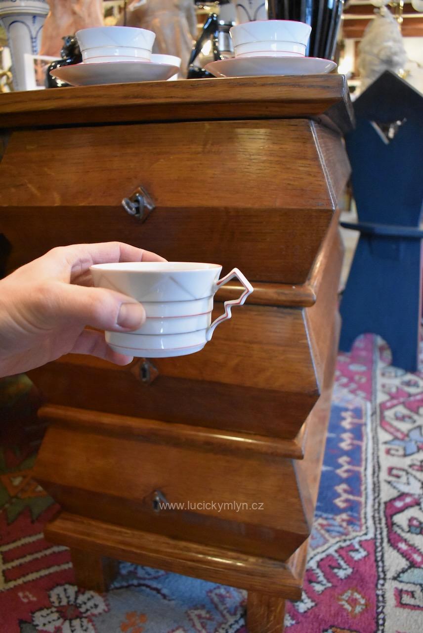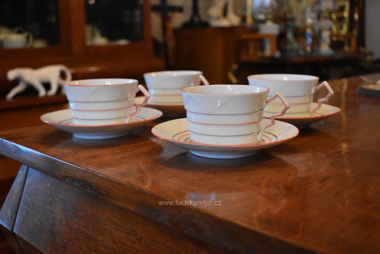 Kolekce 4 ks málo se vyskytujících, starožitných, kubisticky navržených porcelánových šálků s podšálky