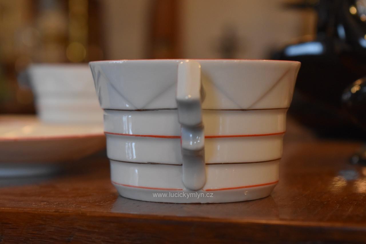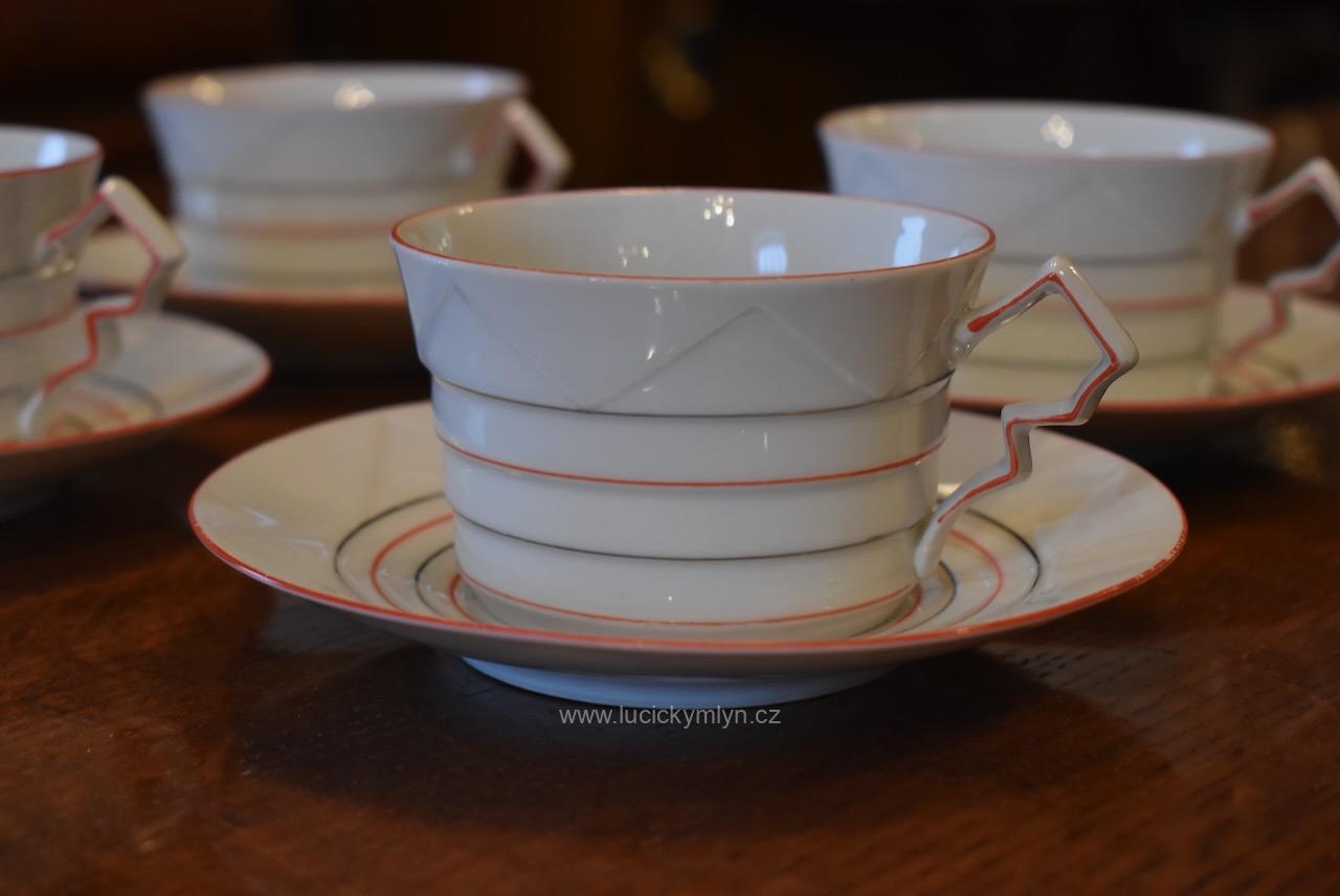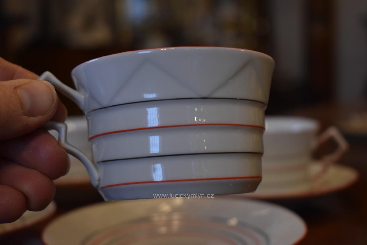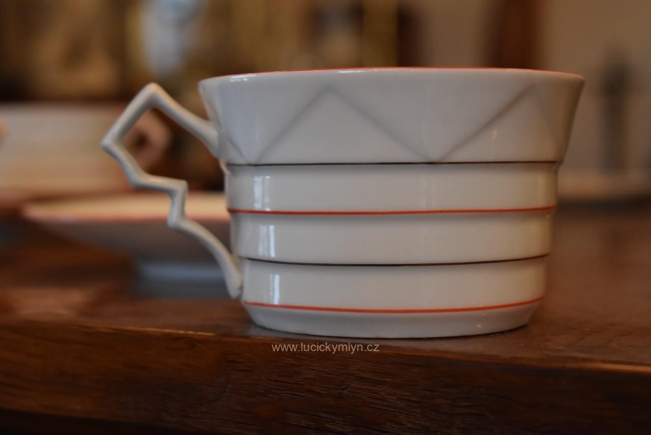 Krásný model hrnečku i talířku má výrazně plasticky vrstvené horizontální linie, zvýrazněné úzkou červenou linkou. Pro decentní zvýraznění zdařilé kubistické myšlenky dávného tvůrce, byl vnější okraj podšálku i šálku obvodově plasticky zvýrazněn mělkým trojúhelníkovým prolisem. Působivě pojaté je i kubisticky ostře lomené ouško hrnečku. Nevšedně navržená kolekce 4 ks starožitných kubistických šálků s podšálky se zachovala zcela bez poškození. Originální český porcelán má původní tištěné značení se znakem kávomlýnku, dlouhodobě užívané firmou Karo-Franckovka.