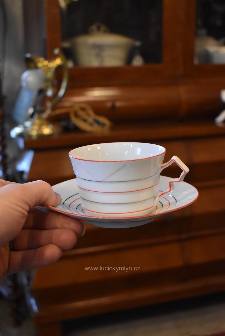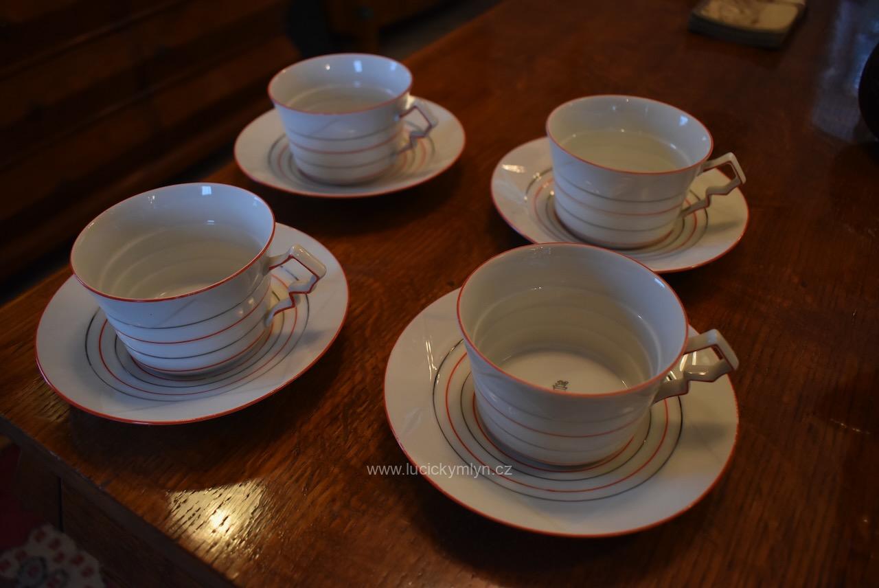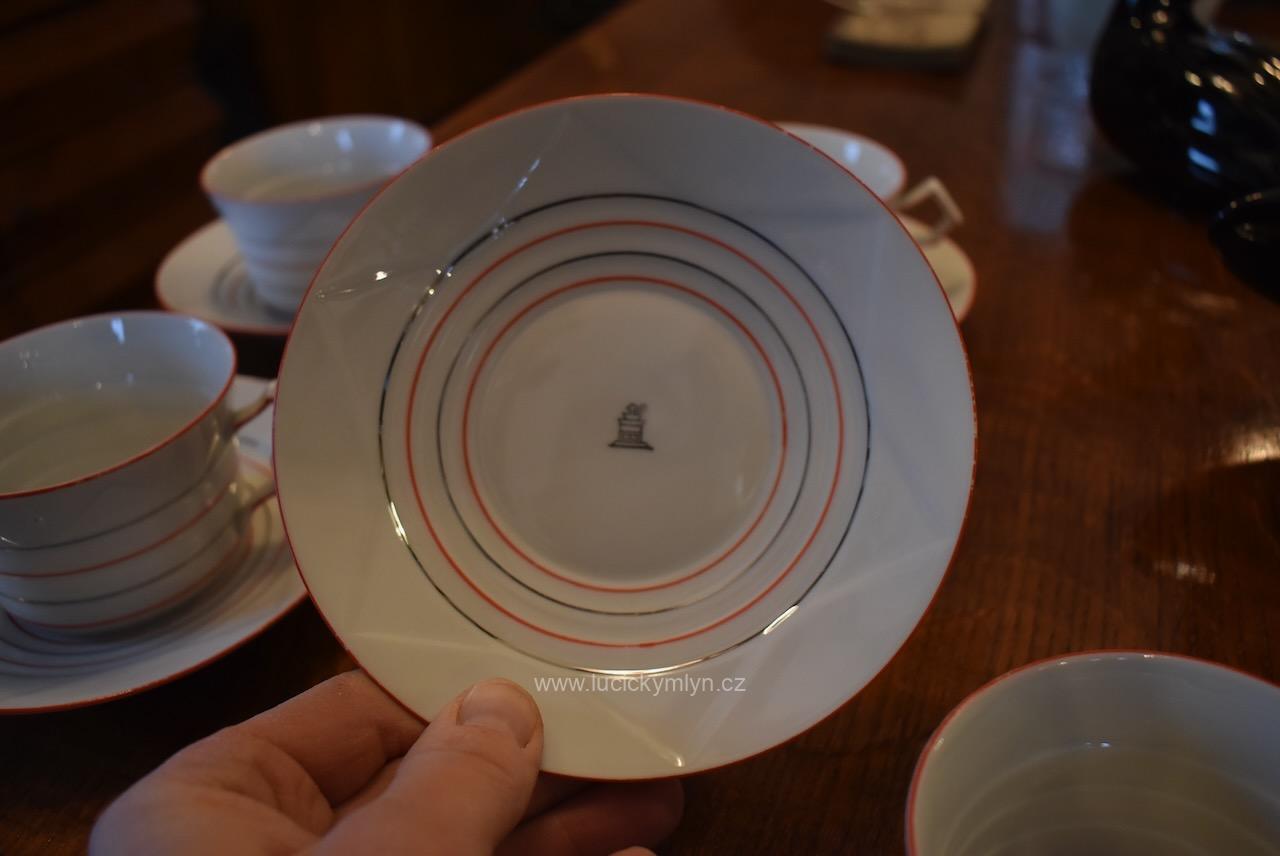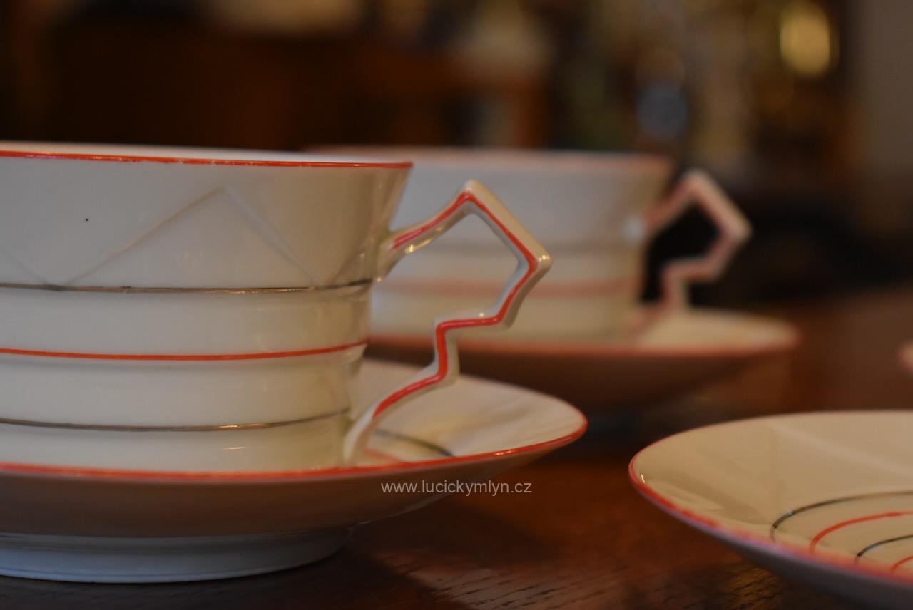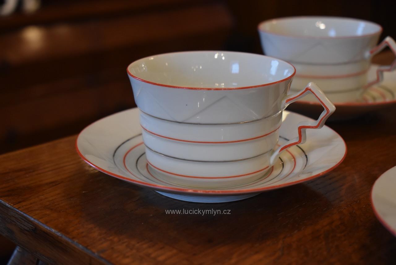 Krásný model hrnečku i talířku má výrazně plasticky vrstvené horizontální linie, zvýrazněné úzkou červenou linkou. Pro decentní zvýraznění zdařilé kubistické myšlenky dávného tvůrce, byl vnější okraj podšálku i šálku obvodově plasticky zvýrazněn mělkým trojúhelníkovým prolisem. Působivě pojaté je i kubisticky ostře lomené ouško hrnečku. Nevšedně navržená kolekce 4 ks starožitných kubistických šálků s podšálky se zachovala zcela bez poškození. Originální český porcelán má původní tištěné značení se znakem kávomlýnku, dlouhodobě užívané firmou Karo-Franckovka.