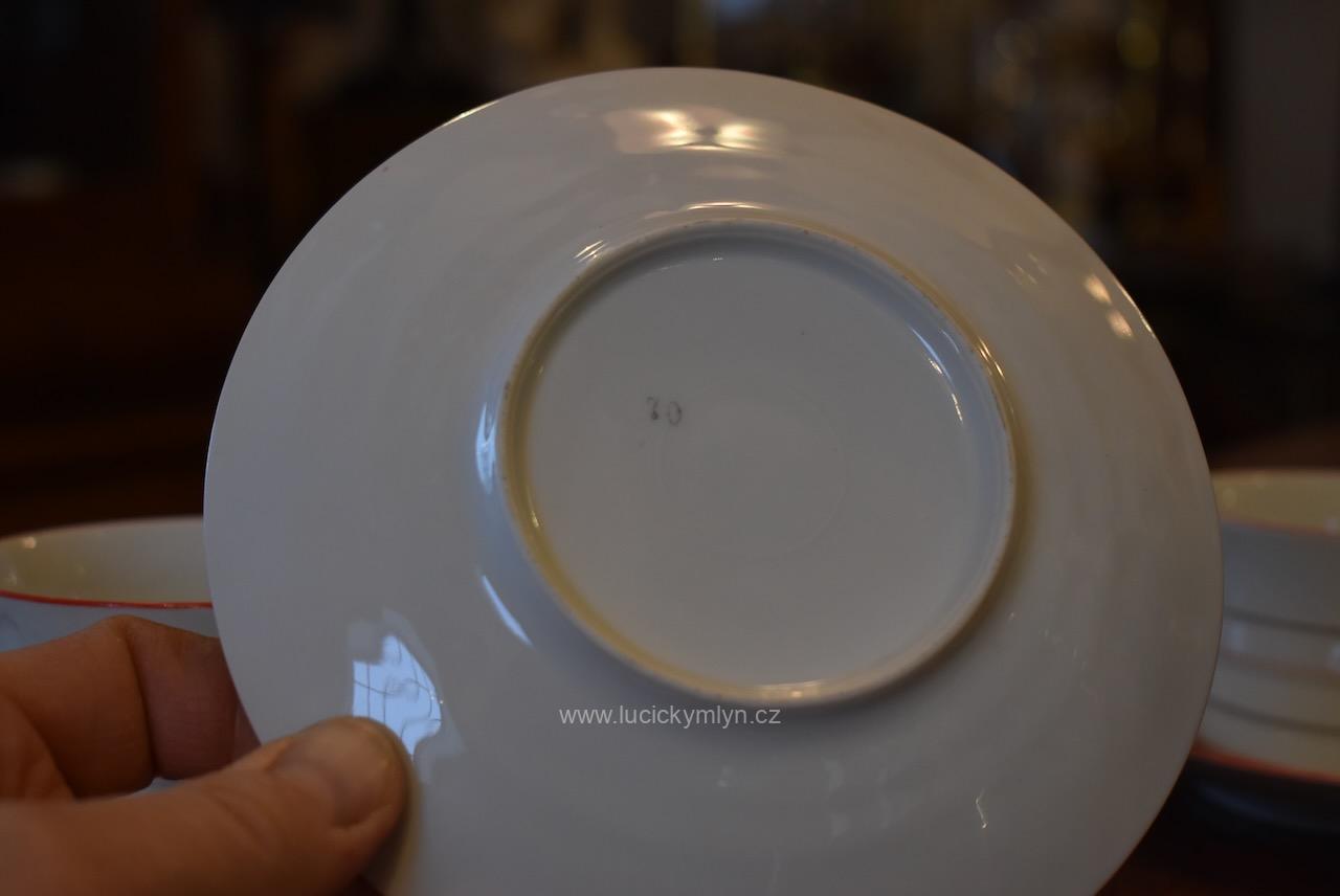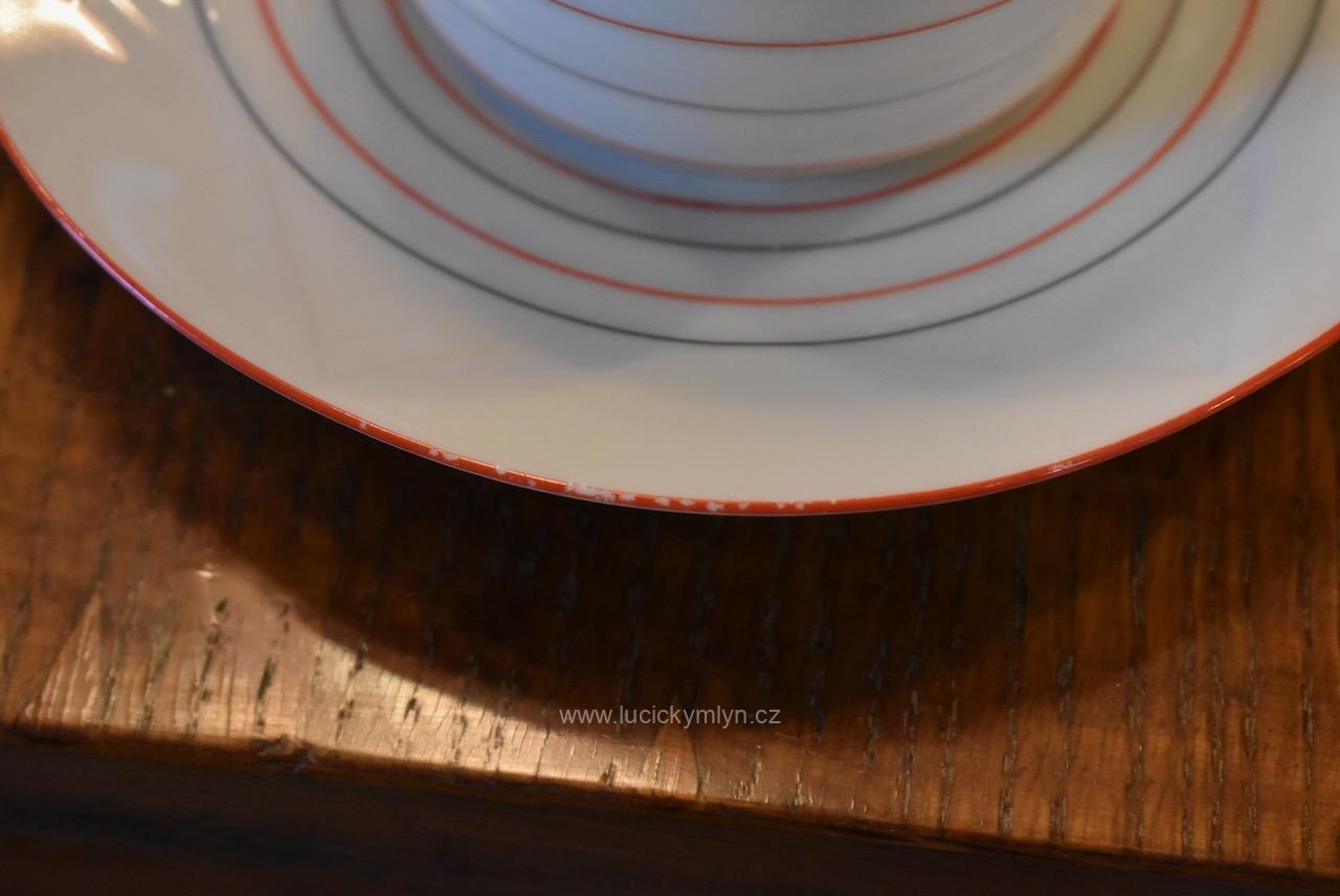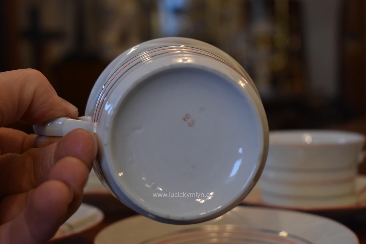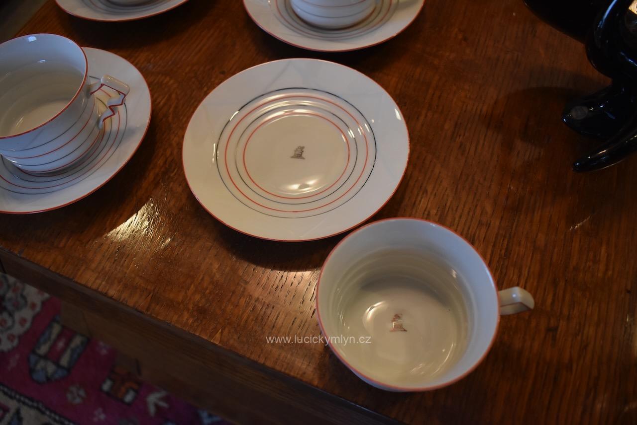 Krásný model hrnečku i talířku má výrazně plasticky vrstvené horizontální linie, zvýrazněné úzkou červenou linkou. Pro decentní zvýraznění zdařilé kubistické myšlenky dávného tvůrce, byl vnější okraj podšálku i šálku obvodově plasticky zvýrazněn mělkým trojúhelníkovým prolisem. Působivě pojaté je i kubisticky ostře lomené ouško hrnečku. Nevšedně navržená kolekce 4 ks starožitných kubistických šálků s podšálky se zachovala zcela bez poškození. Originální český porcelán má původní tištěné značení se znakem kávomlýnku, dlouhodobě užívané firmou Karo-Franckovka.