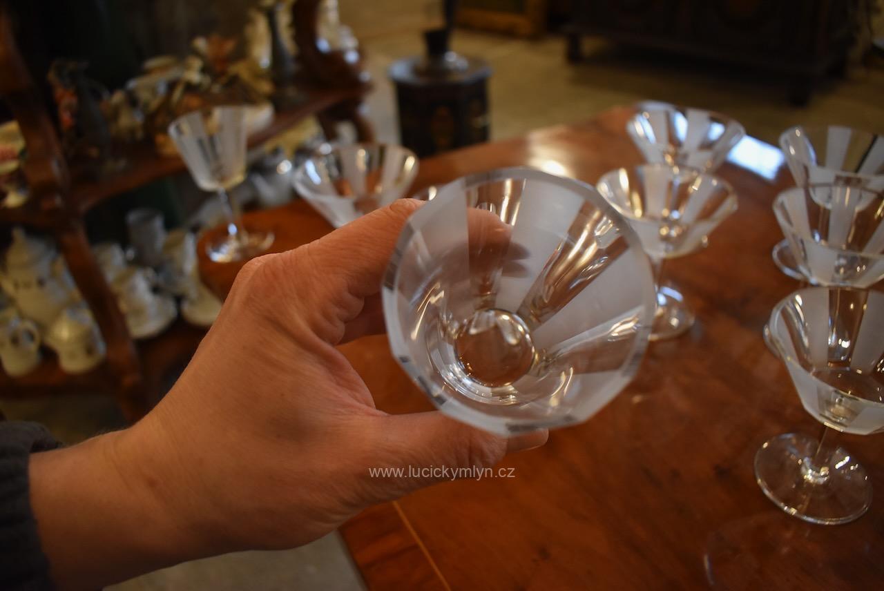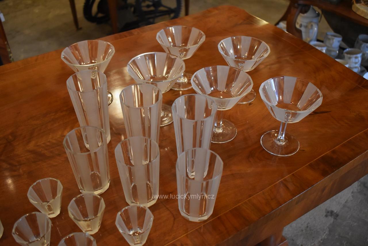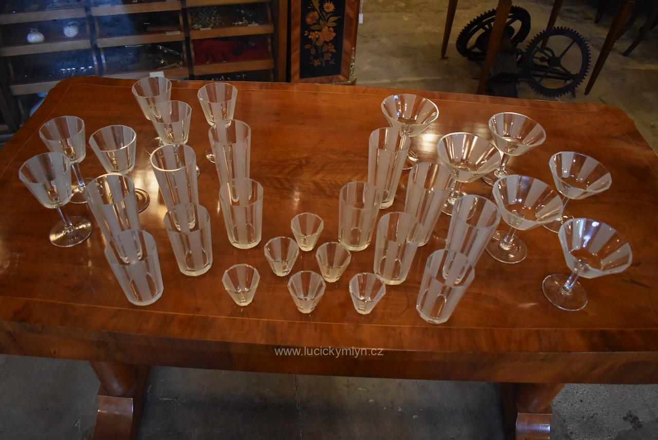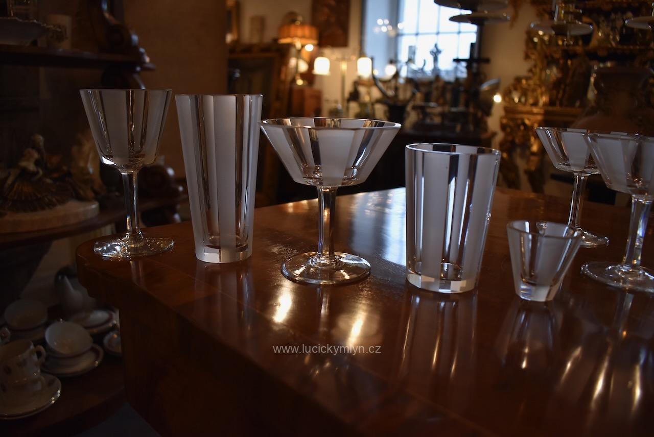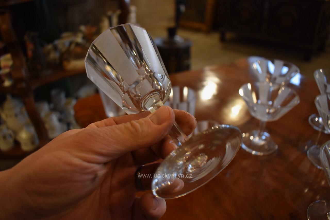 Kompletní , vzácně ucelená, sada s 5 druhy luxusních starožitných skleniček pro 6 osob z broušeného hraněného skla na nápoje, víno a alkohol, vše navržené v nadčasové stylu ART-DECO