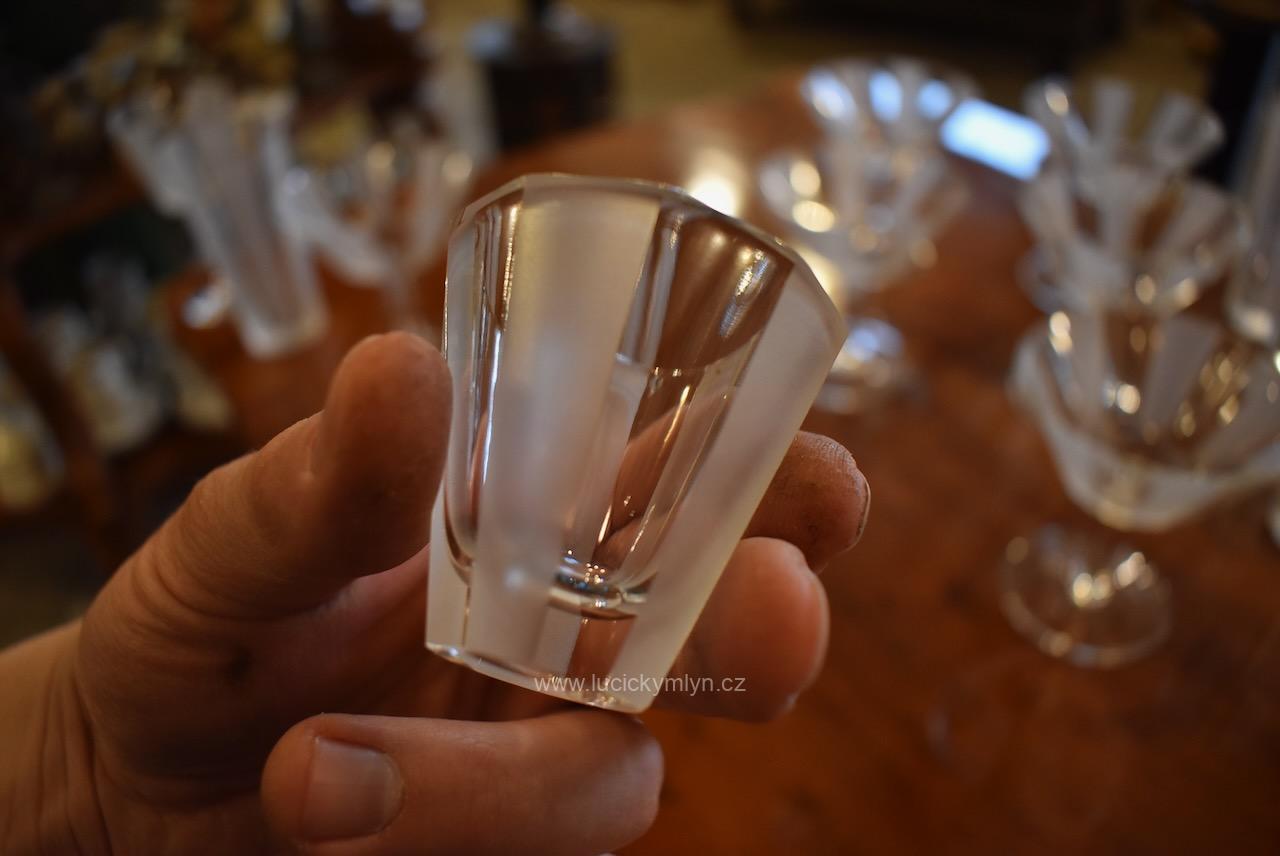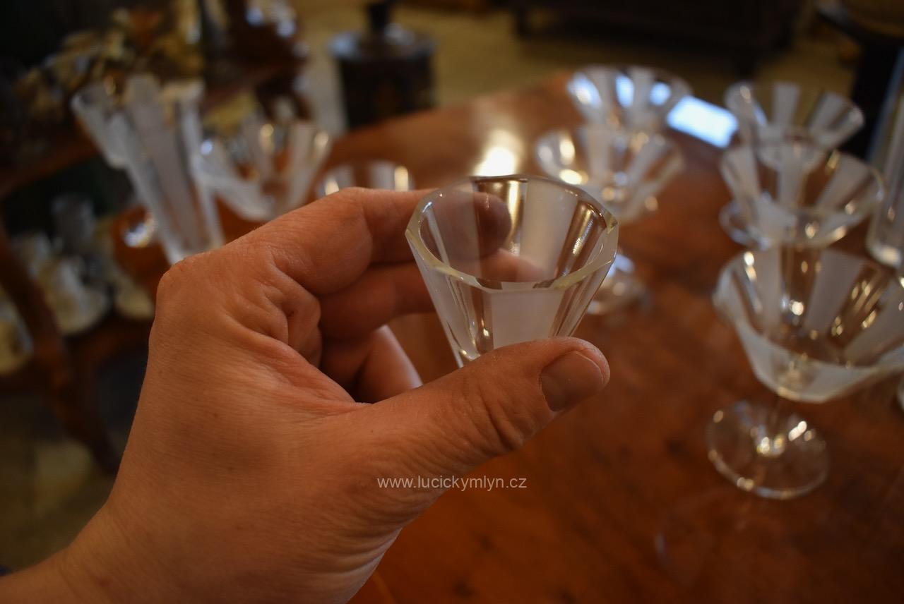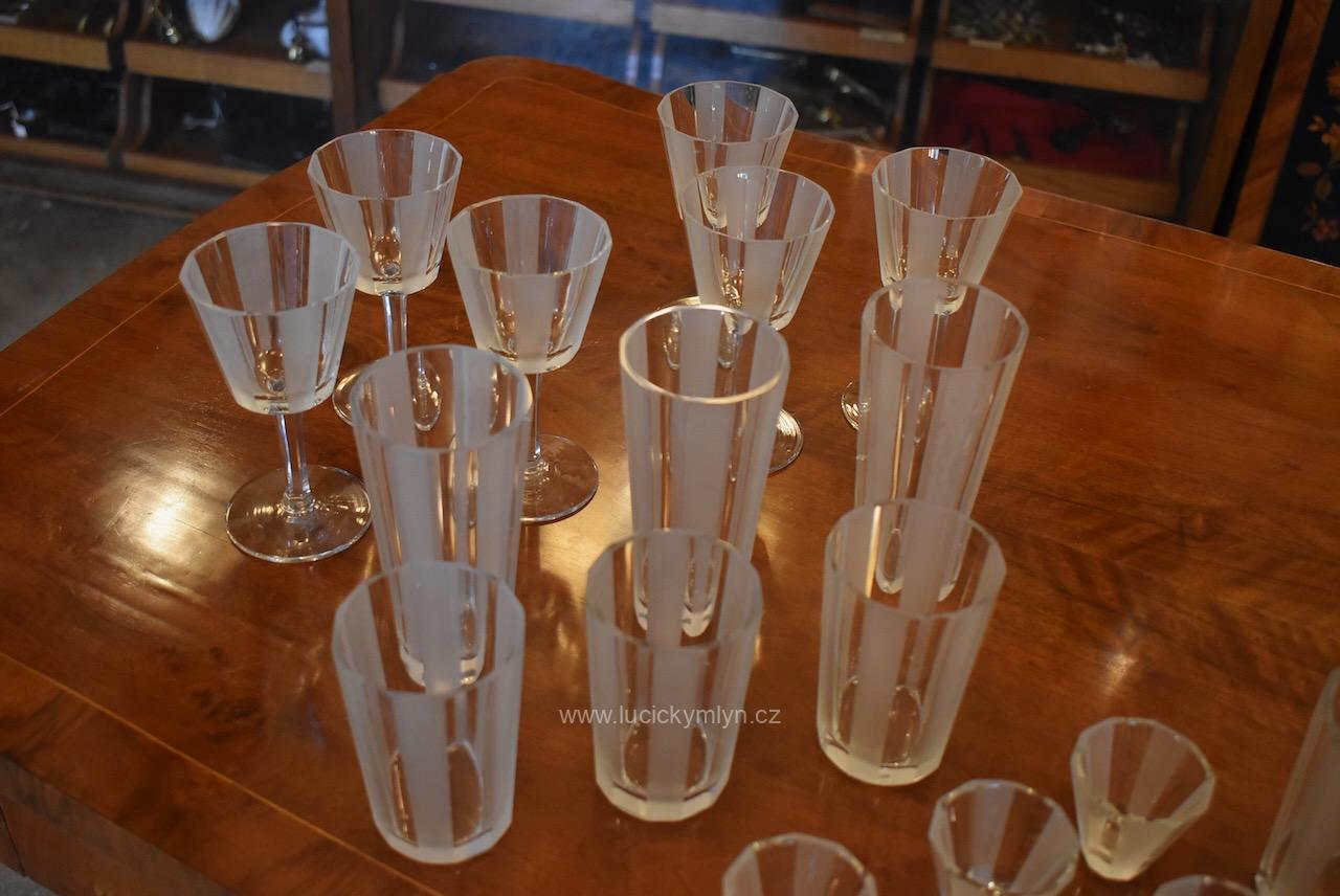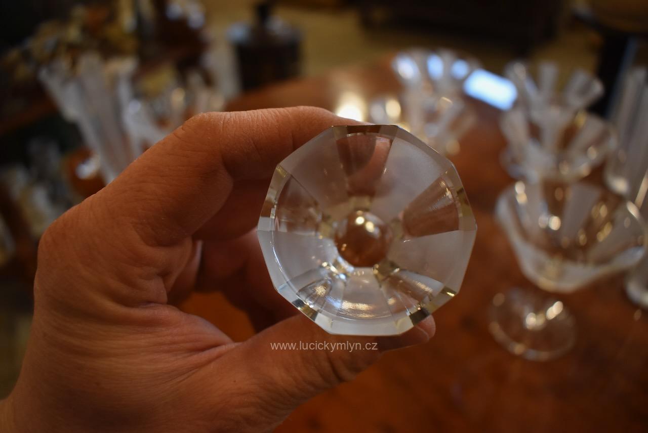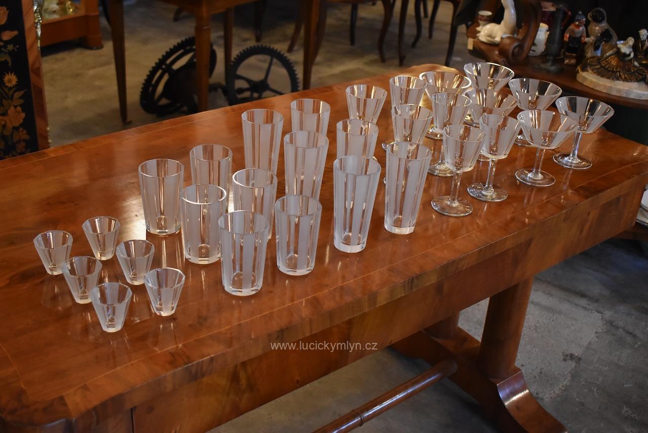 Kompletní , vzácně ucelená, sada s 5 druhy luxusních starožitných skleniček pro 6 osob z broušeného hraněného skla na nápoje, víno a alkohol, vše navržené v nadčasové stylu ART-DECO