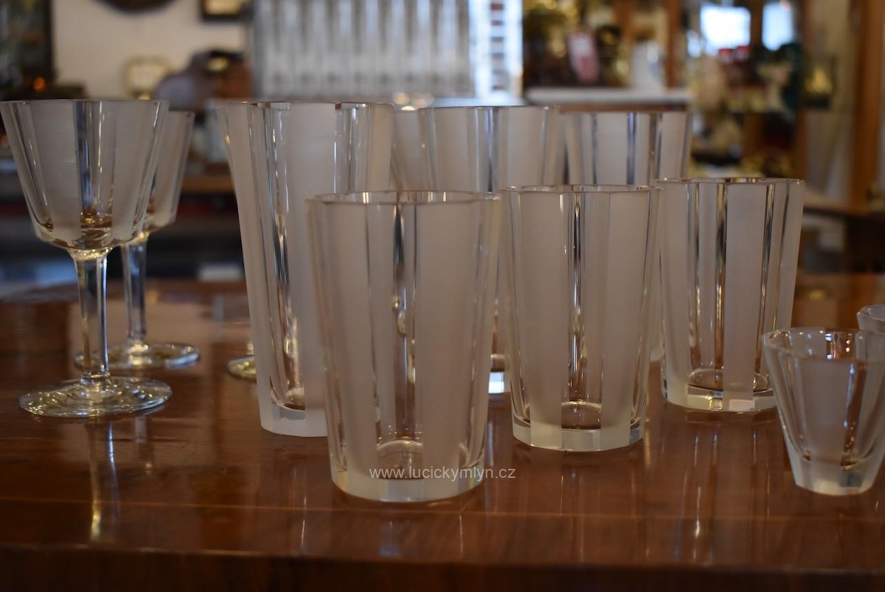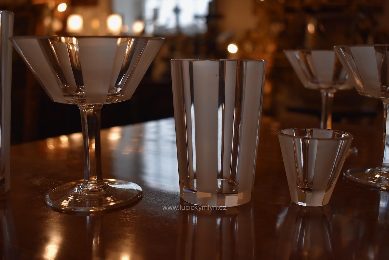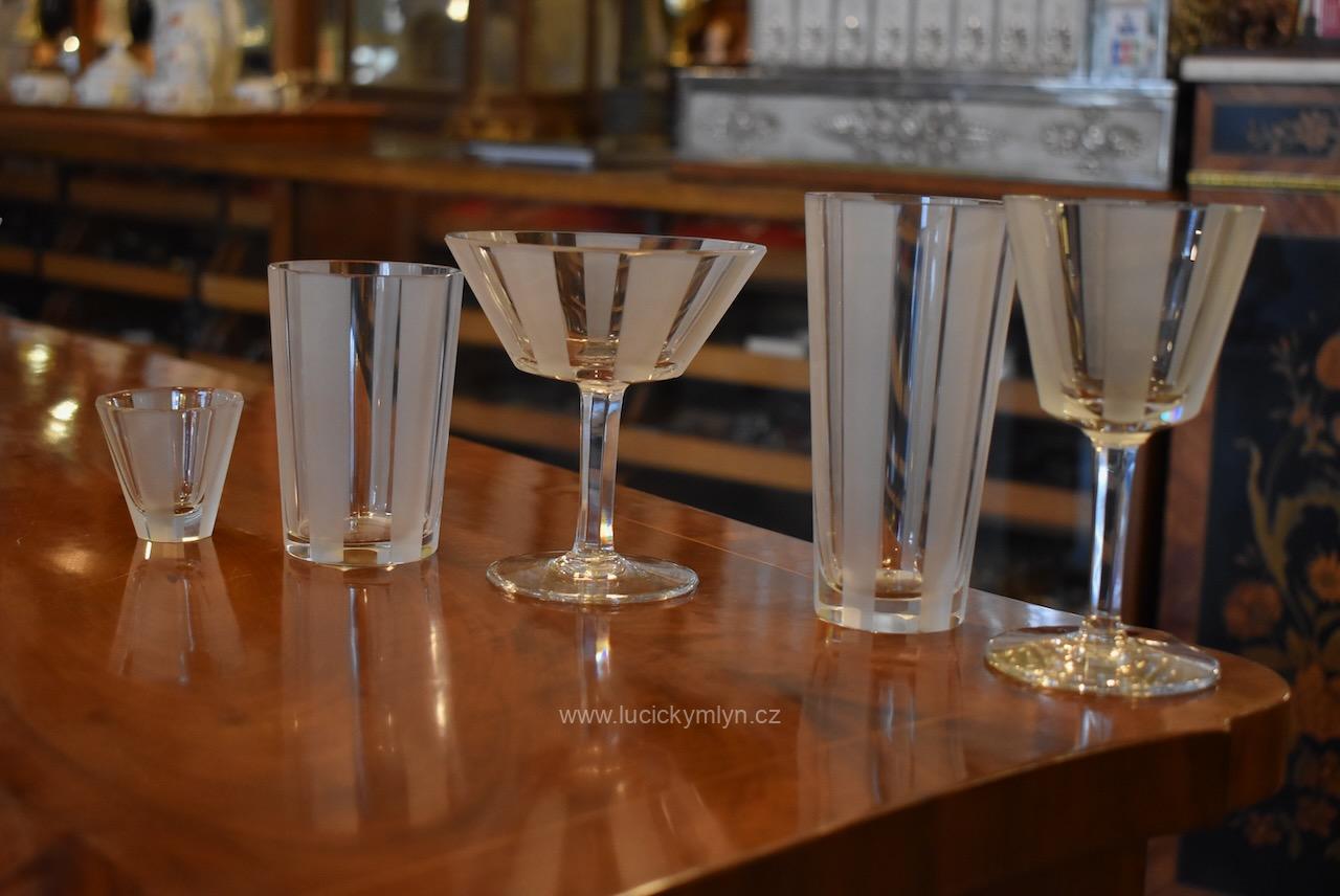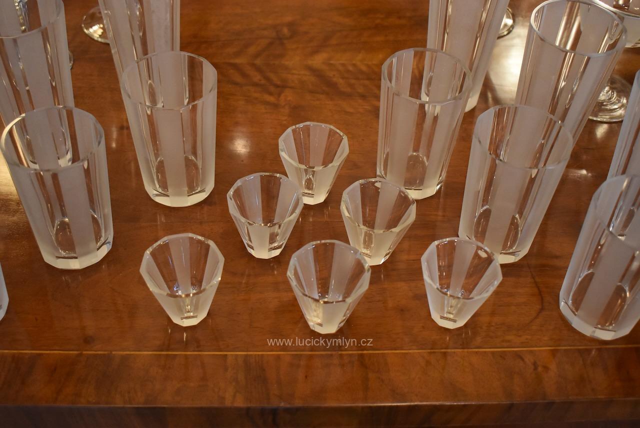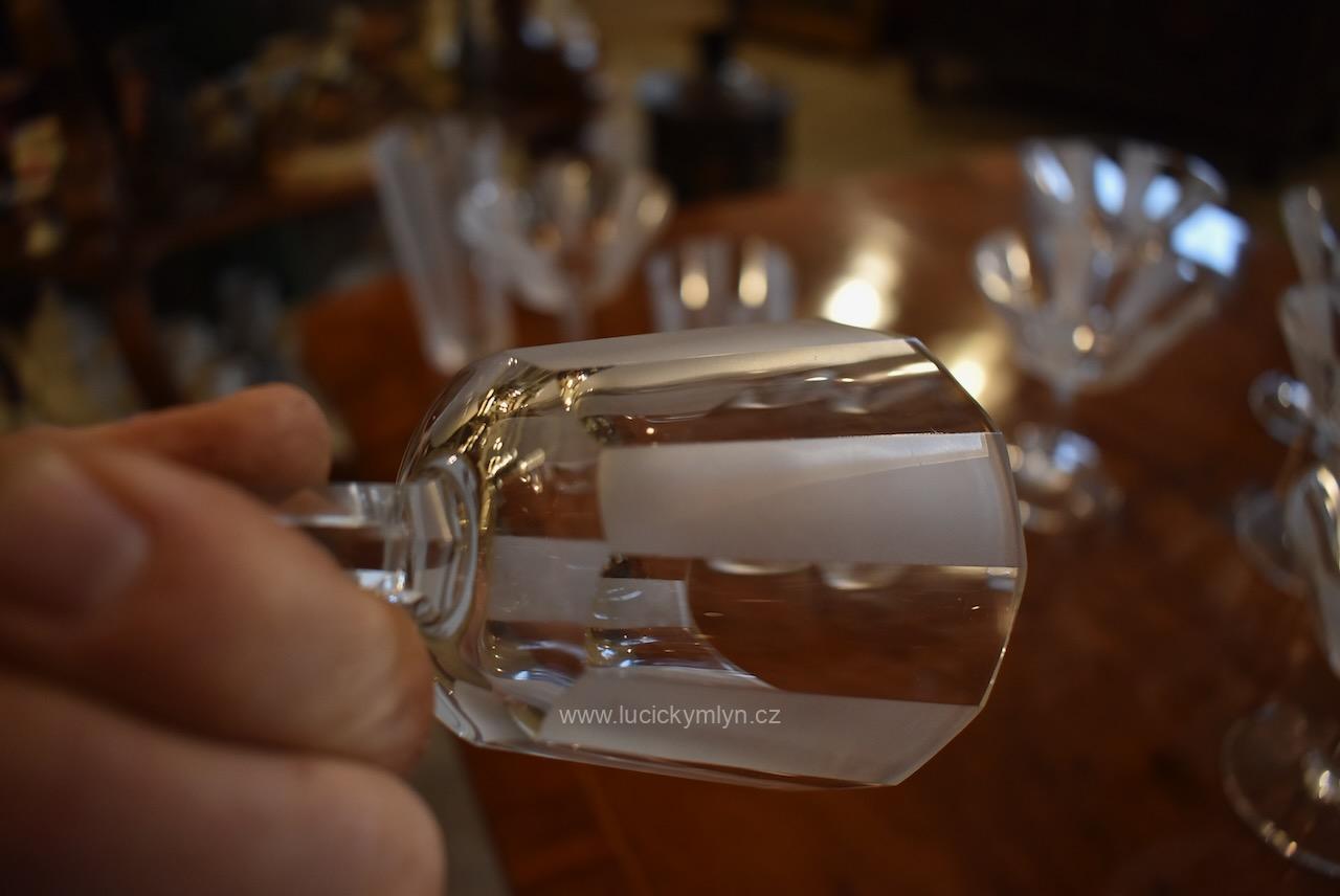 Originální kolekce vyniká osobitým designem, který úspěšně kombinuje na hraněných plochách leštěný a matně leptaný povrch. Kvalitní starožitné servírovací sklo, vhodné k reprezentativním účelům a chvílím při slavnostních i romantických příležitostech. Velká kolekce pro 6 osob s pěti druhy sklenic a skleniček, se zachovala i po užívání několika generací ve velmi dobrém původním stavu. Pracně lze nalézt pouze miniaturní stopy šetrného používání, viz foto.