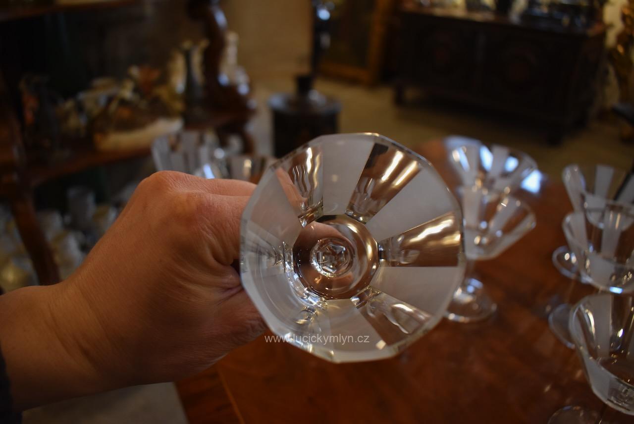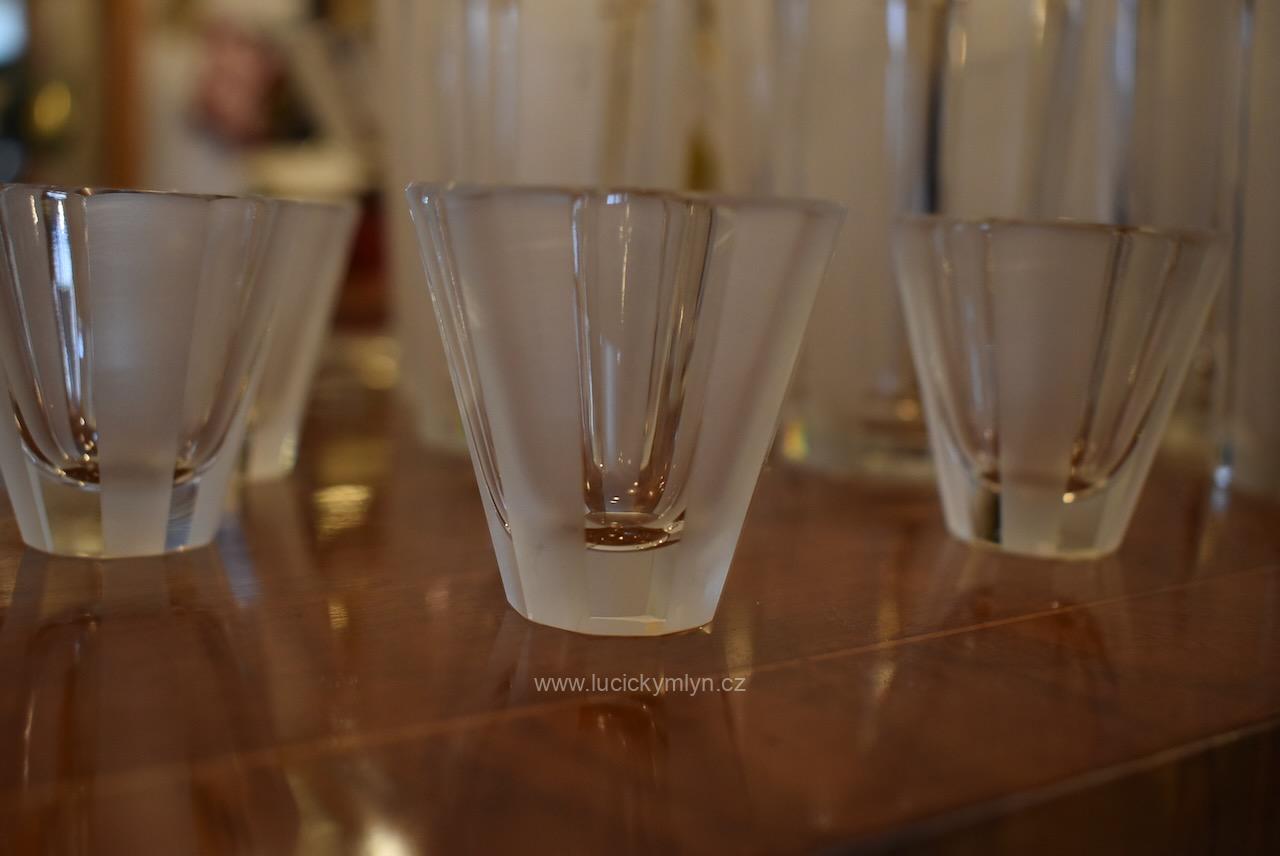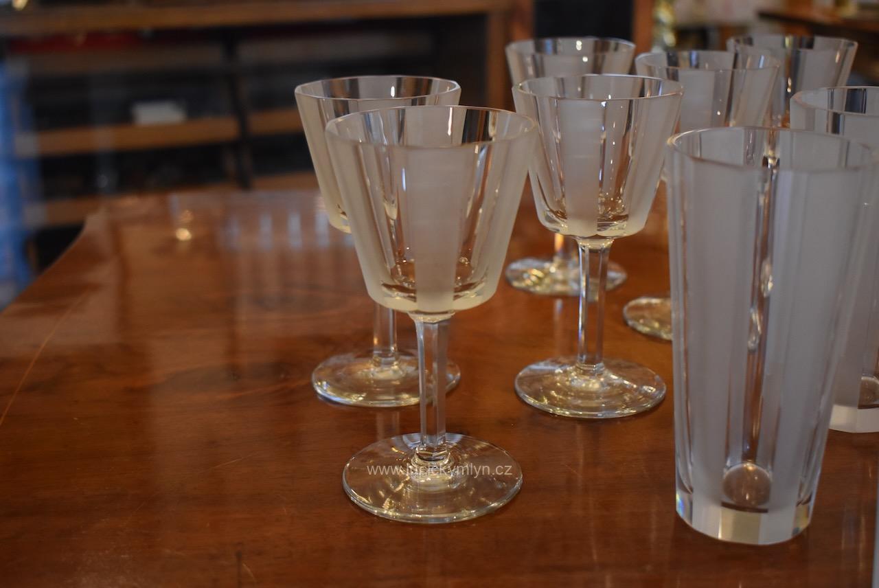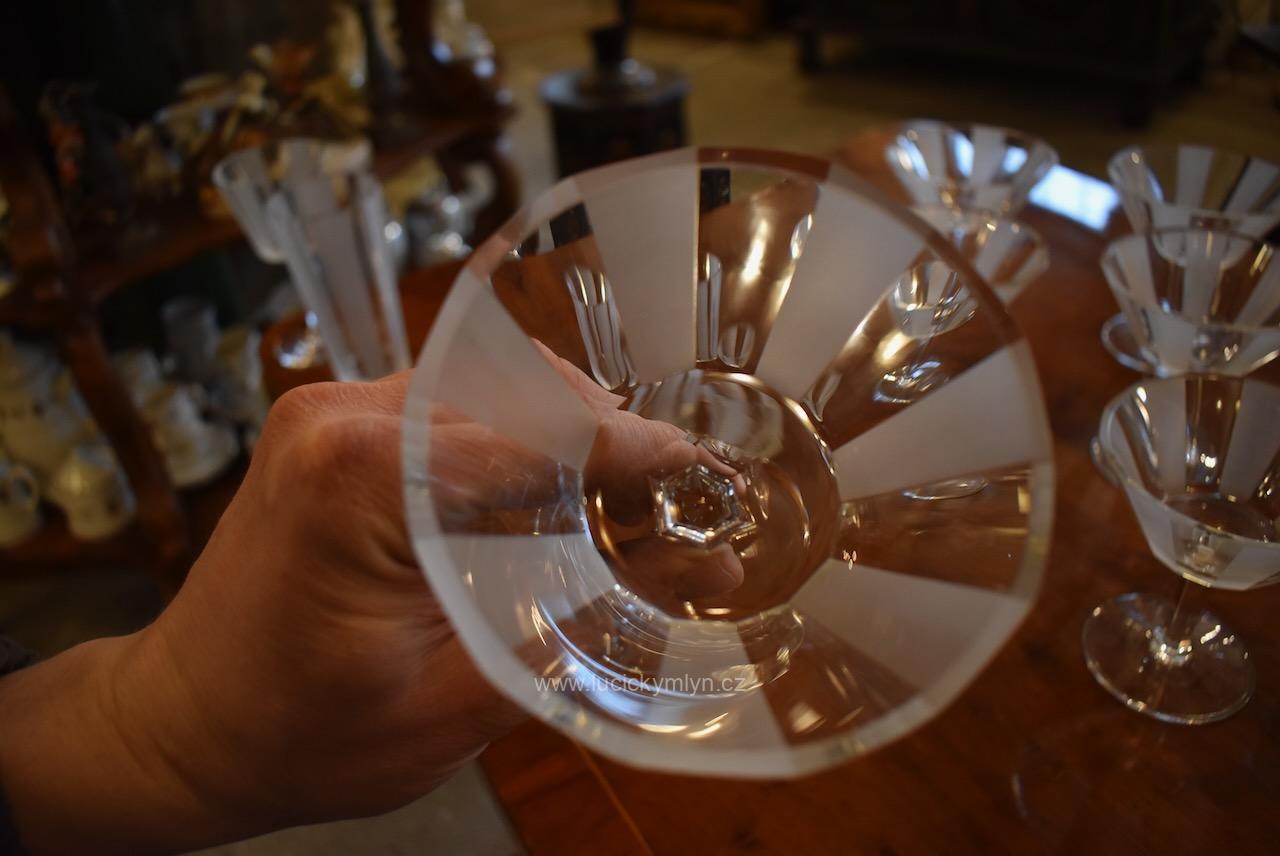 Originální kolekce vyniká osobitým designem, který úspěšně kombinuje na hraněných plochách leštěný a matně leptaný povrch. Kvalitní starožitné servírovací sklo, vhodné k reprezentativním účelům a chvílím při slavnostních i romantických příležitostech. Velká kolekce pro 6 osob s pěti druhy sklenic a skleniček, se zachovala i po užívání několika generací ve velmi dobrém původním stavu. Pracně lze nalézt pouze miniaturní stopy šetrného používání, viz foto.