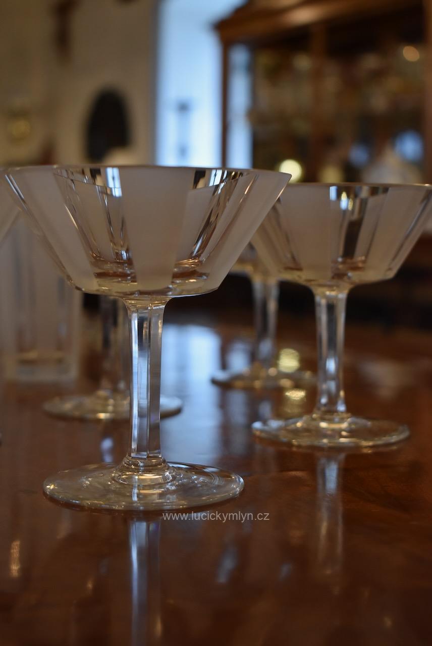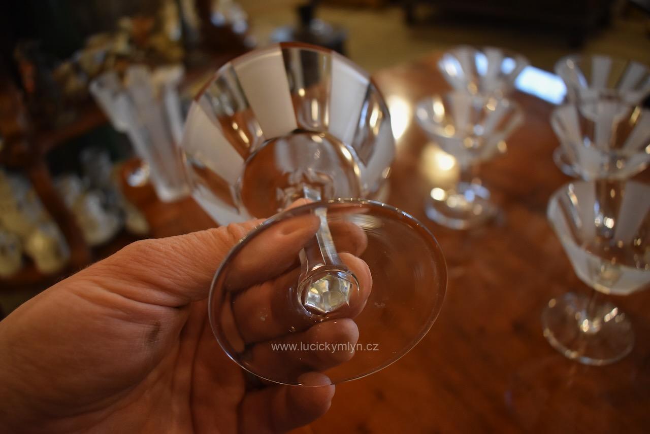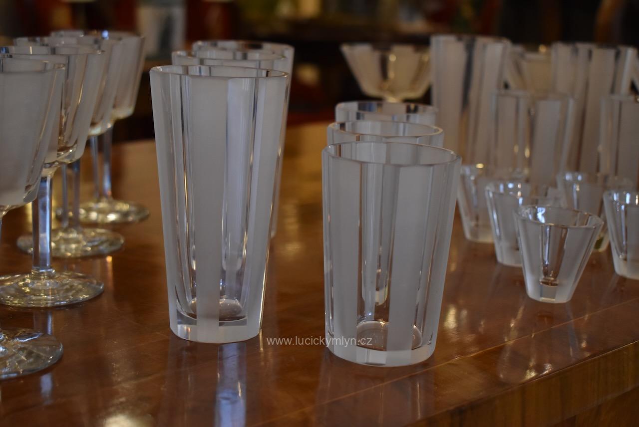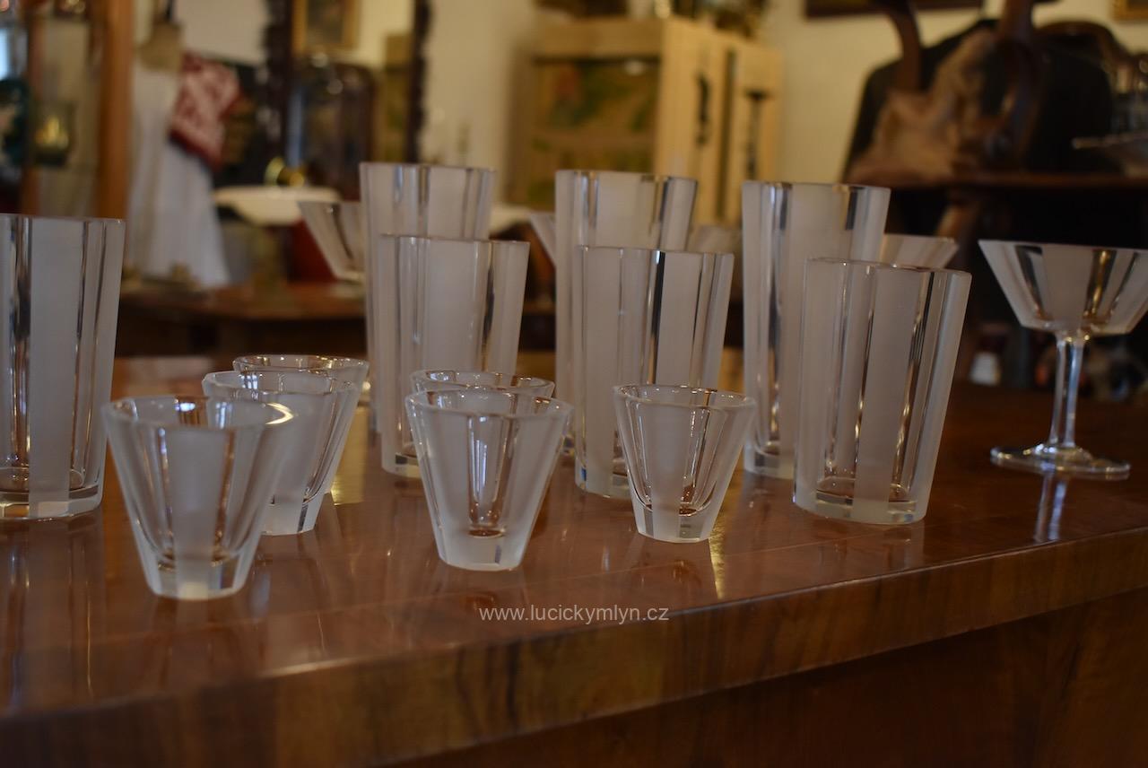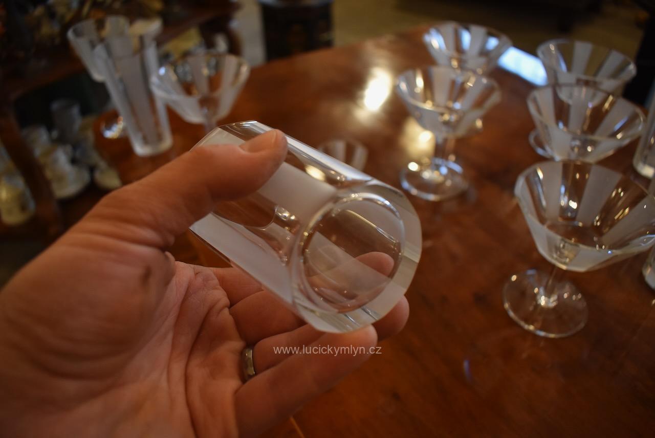 Originální kolekce vyniká osobitým designem, který úspěšně kombinuje na hraněných plochách leštěný a matně leptaný povrch. Kvalitní starožitné servírovací sklo, vhodné k reprezentativním účelům a chvílím při slavnostních i romantických příležitostech. Velká kolekce pro 6 osob s pěti druhy sklenic a skleniček, se zachovala i po užívání několika generací ve velmi dobrém původním stavu. Pracně lze nalézt pouze miniaturní stopy šetrného používání, viz foto.