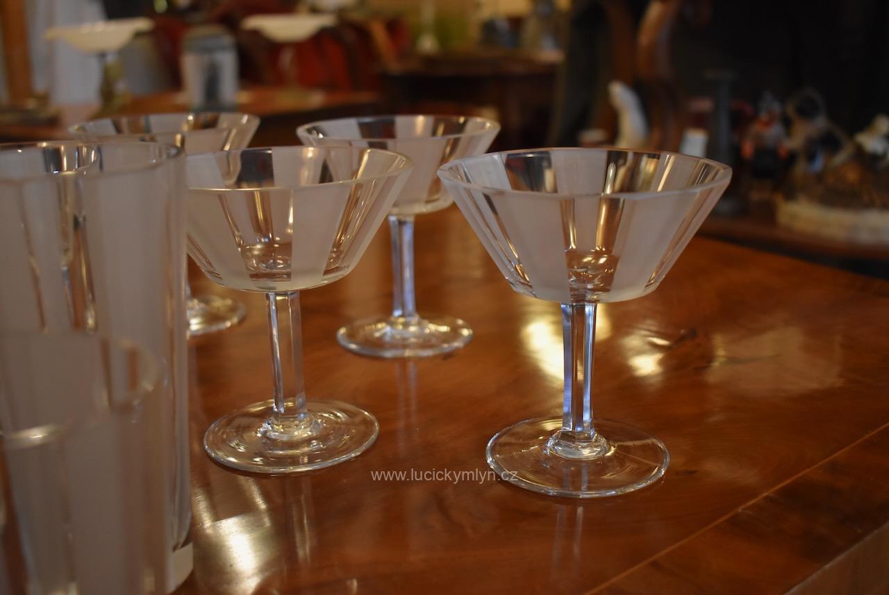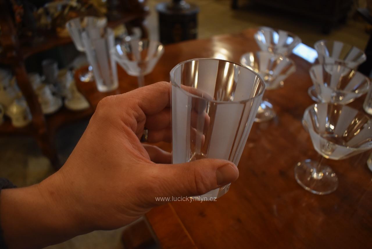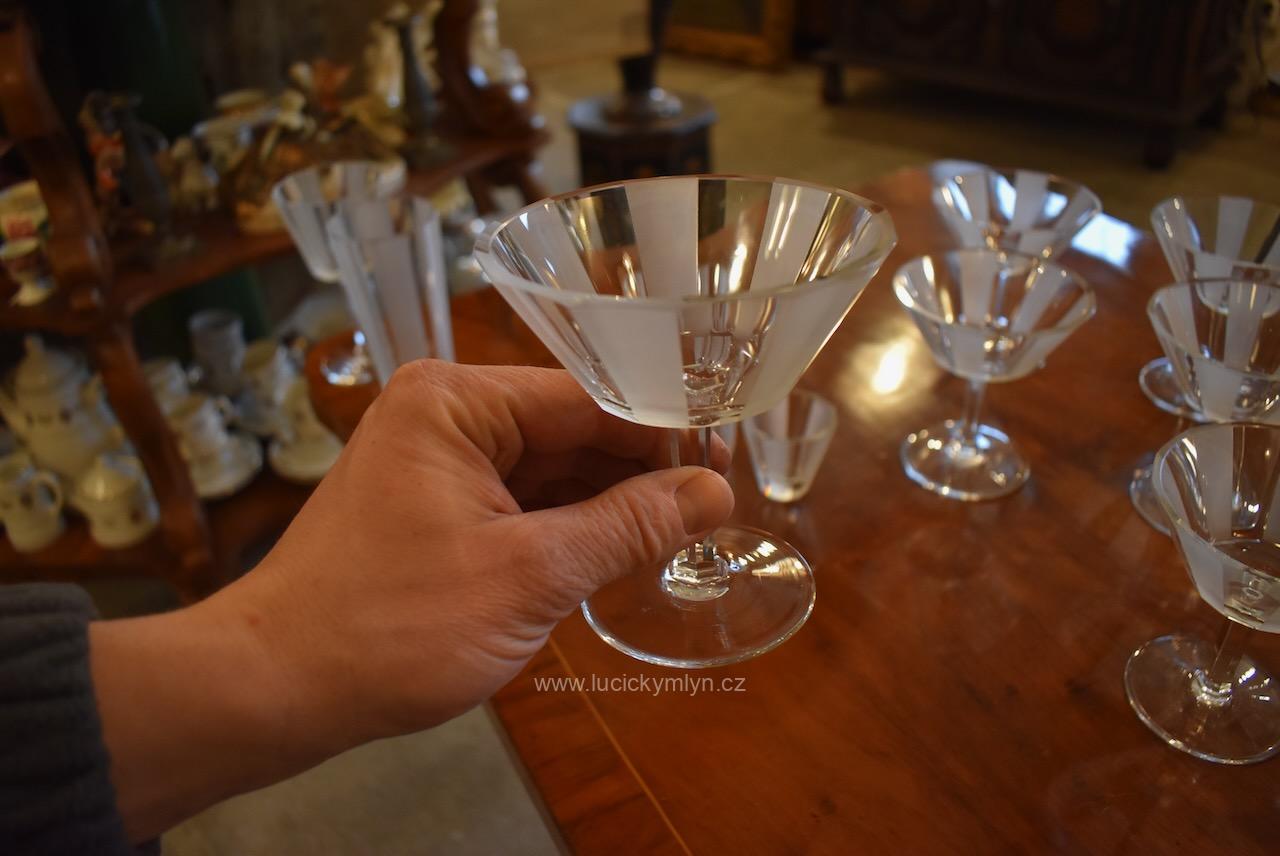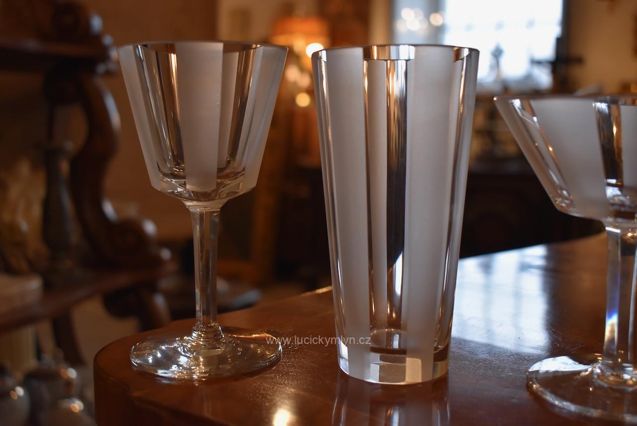 Originální kolekce vyniká osobitým designem, který úspěšně kombinuje na hraněných plochách leštěný a matně leptaný povrch. Kvalitní starožitné servírovací sklo, vhodné k reprezentativním účelům a chvílím při slavnostních i romantických příležitostech. Velká kolekce pro 6 osob s pěti druhy sklenic a skleniček, se zachovala i po užívání několika generací ve velmi dobrém původním stavu. Pracně lze nalézt pouze miniaturní stopy šetrného používání, viz foto.