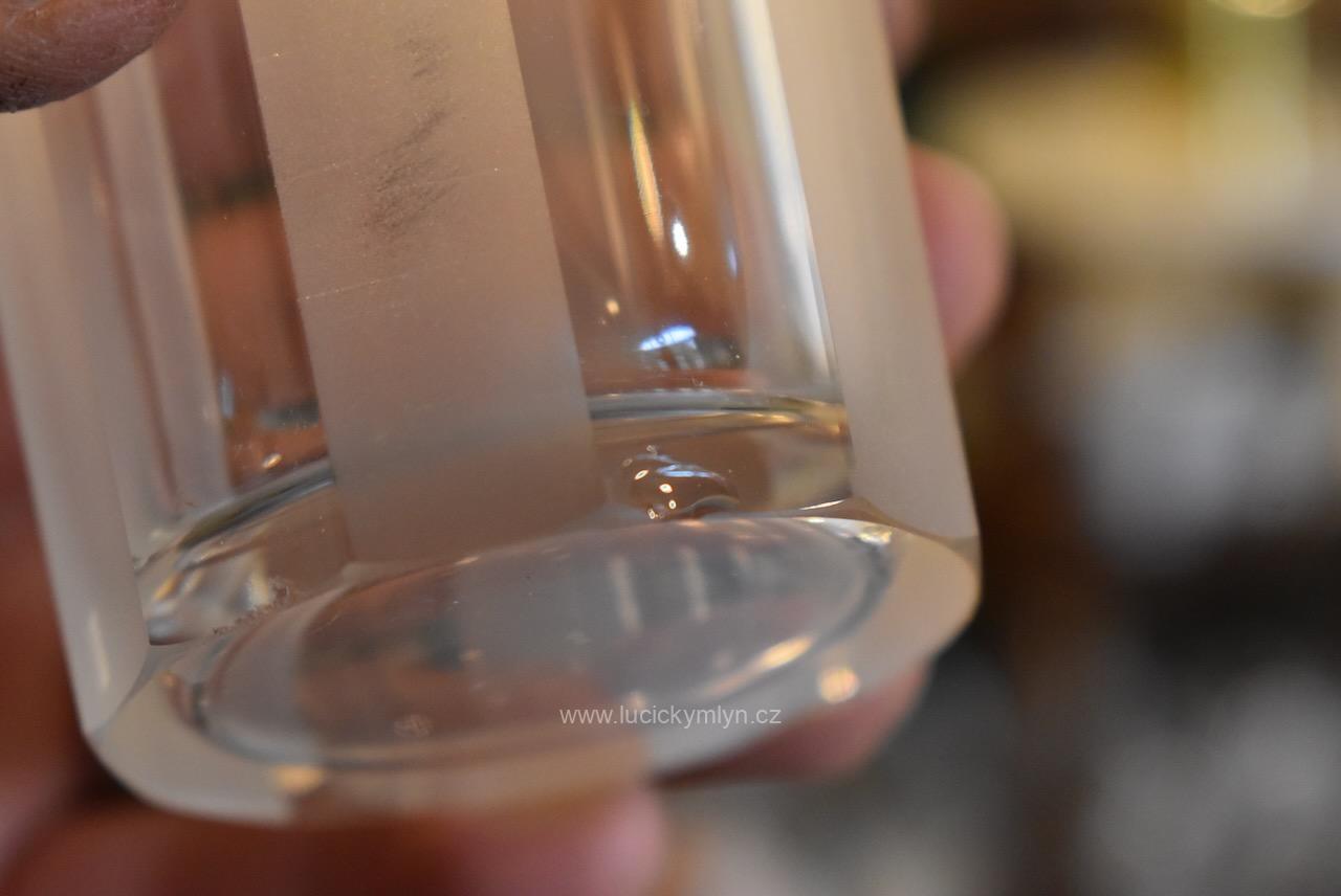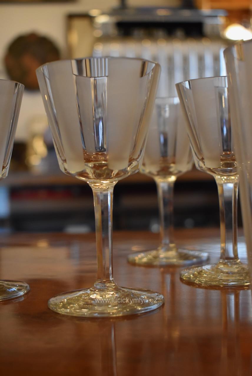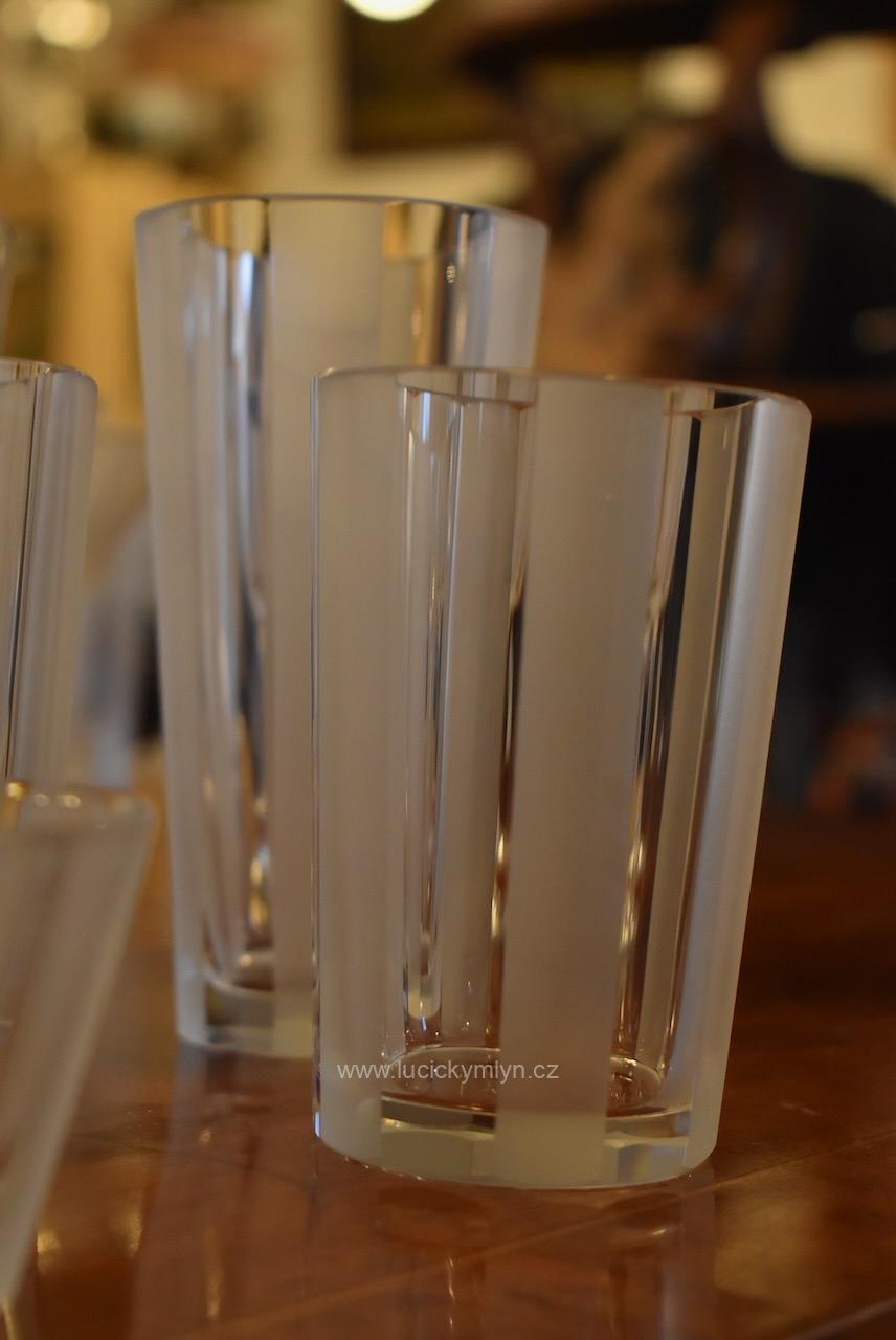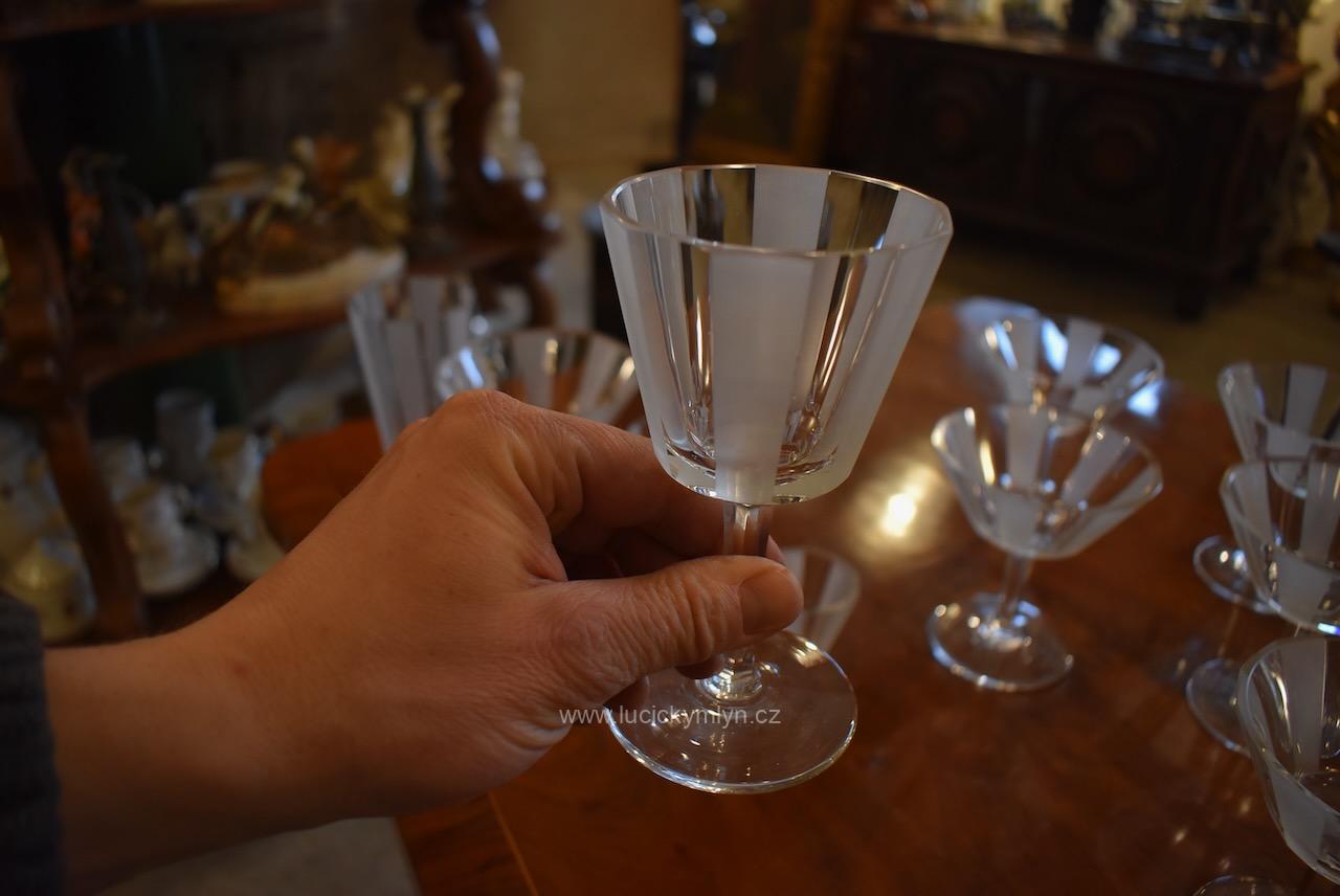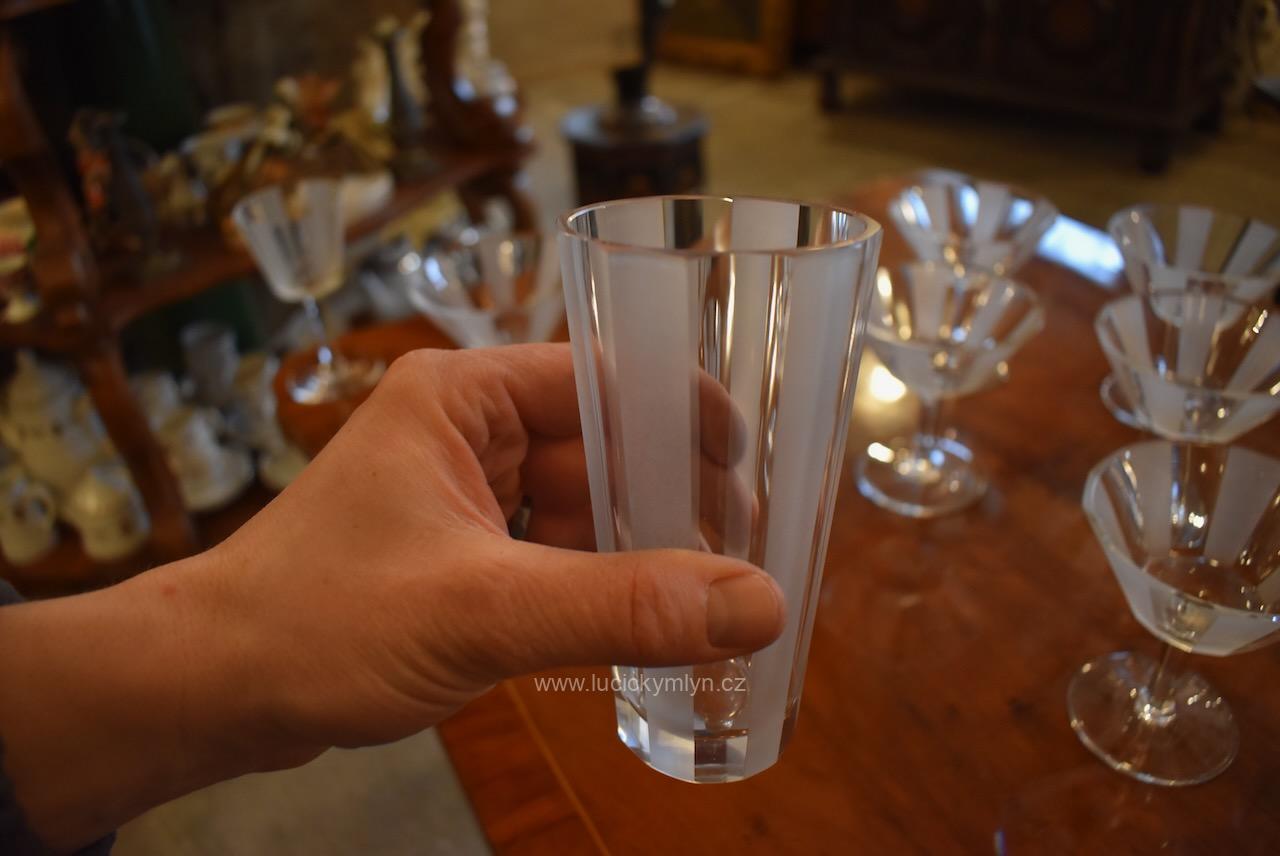Originální kolekce vyniká osobitým designem, který úspěšně kombinuje na hraněných plochách leštěný a matně leptaný povrch. Kvalitní starožitné servírovací sklo, vhodné k reprezentativním účelům a chvílím při slavnostních i romantických příležitostech. Velká kolekce pro 6 osob s pěti druhy sklenic a skleniček, se zachovala i po užívání několika generací ve velmi dobrém původním stavu. Pracně lze nalézt pouze miniaturní stopy šetrného používání, viz foto.