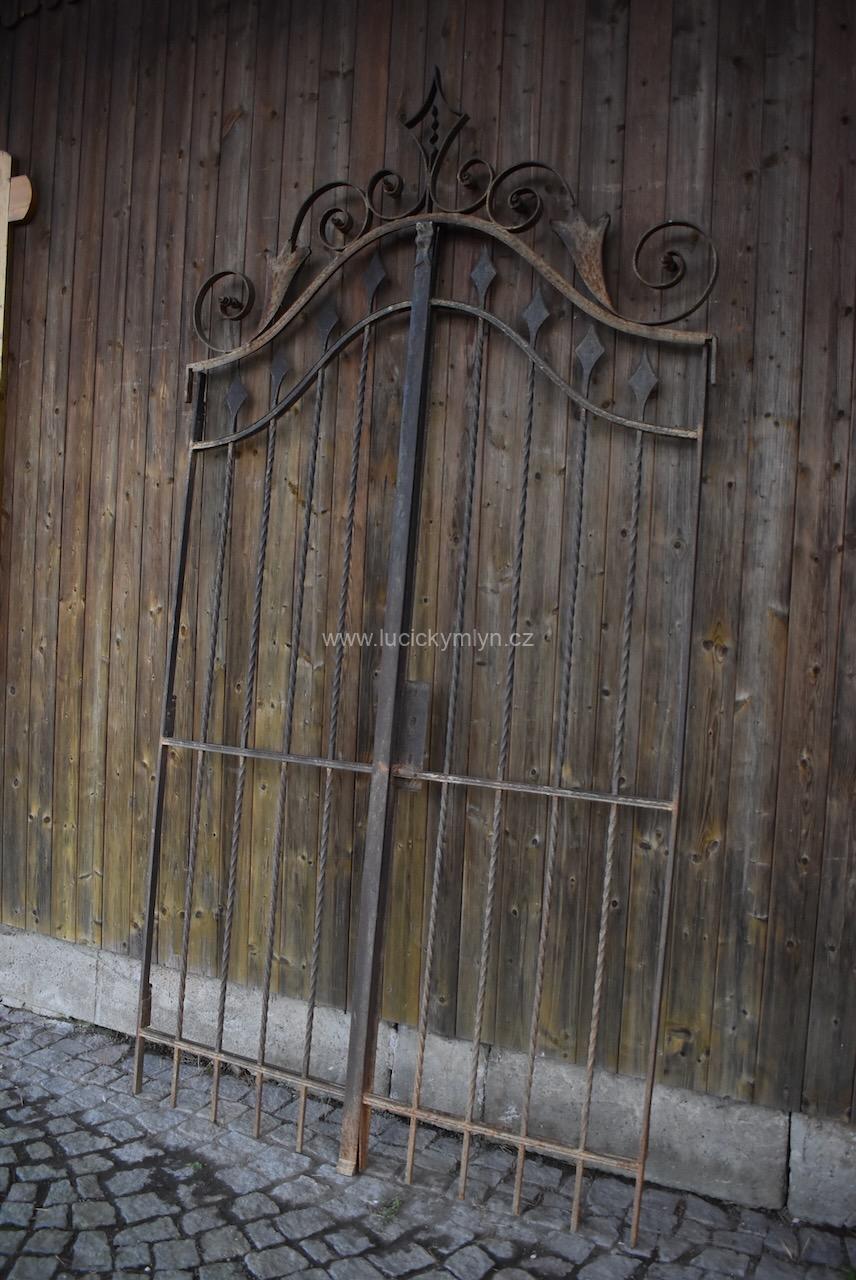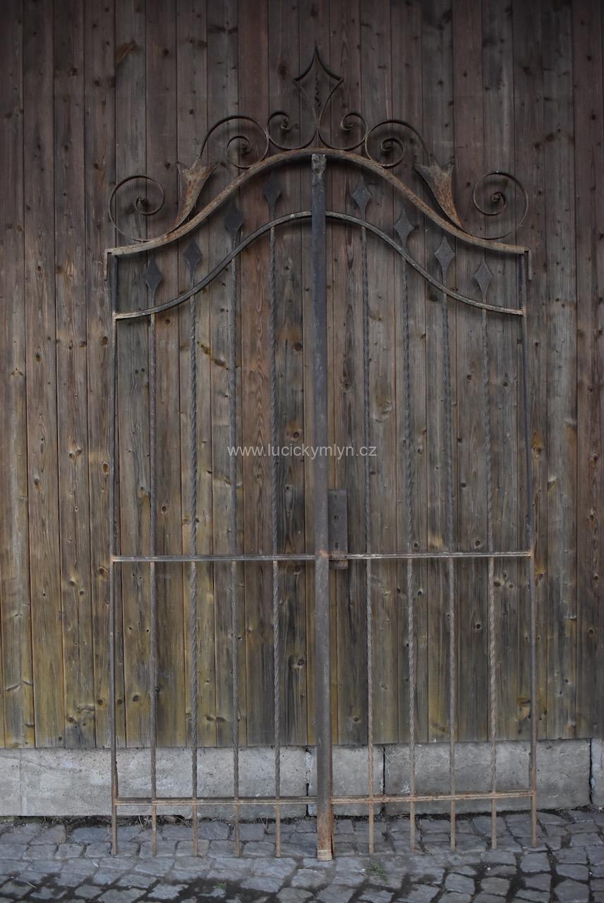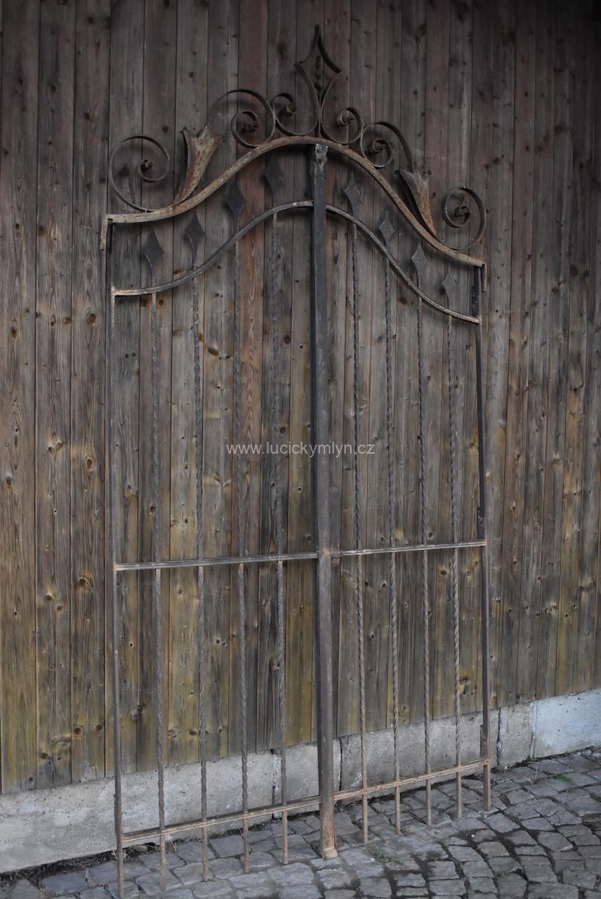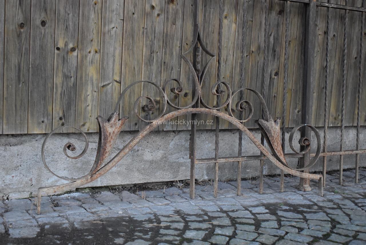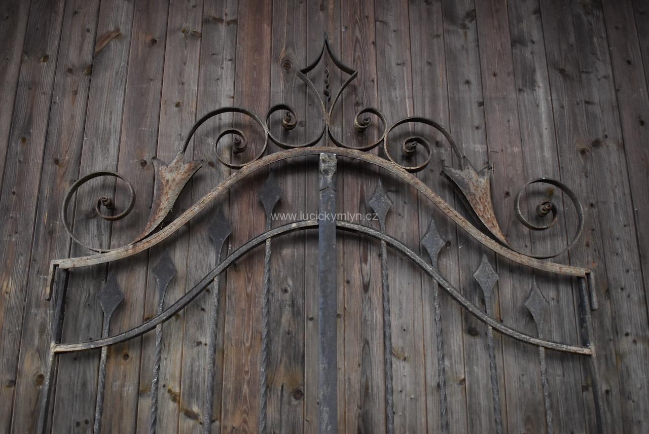 Krásná starožitná umělecky kovaná dvoukřídlá brána s okouzlující vrchní obloukovou ozdobou ze 3.třetiny 19. stol.
