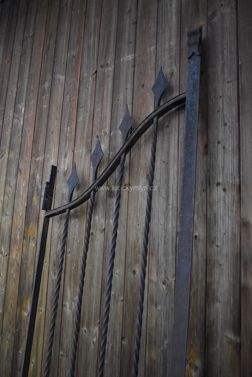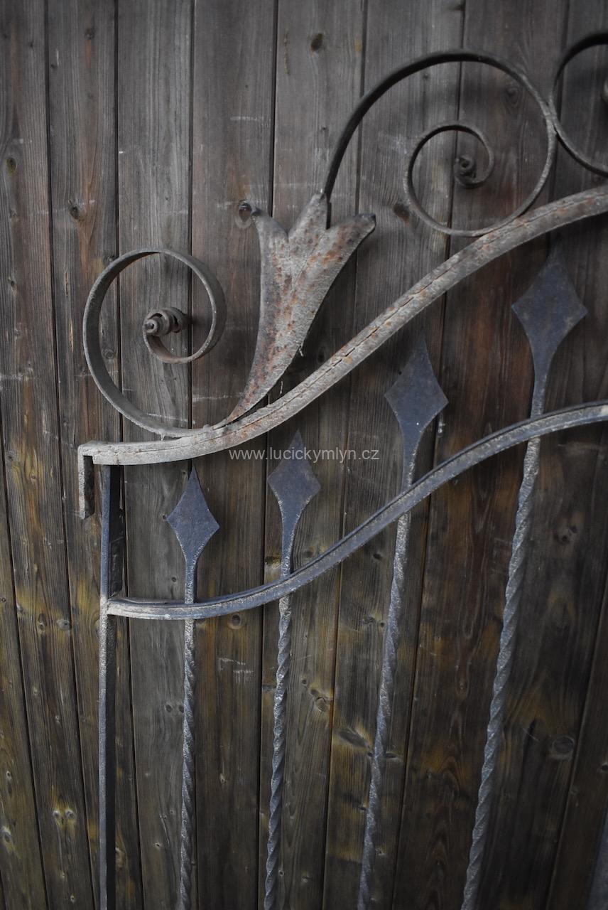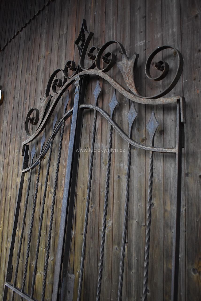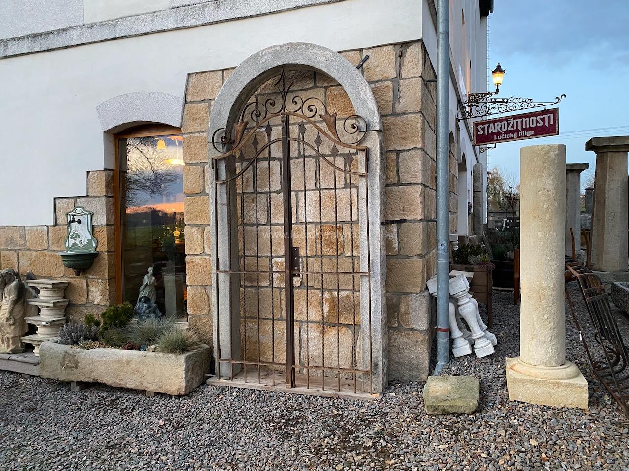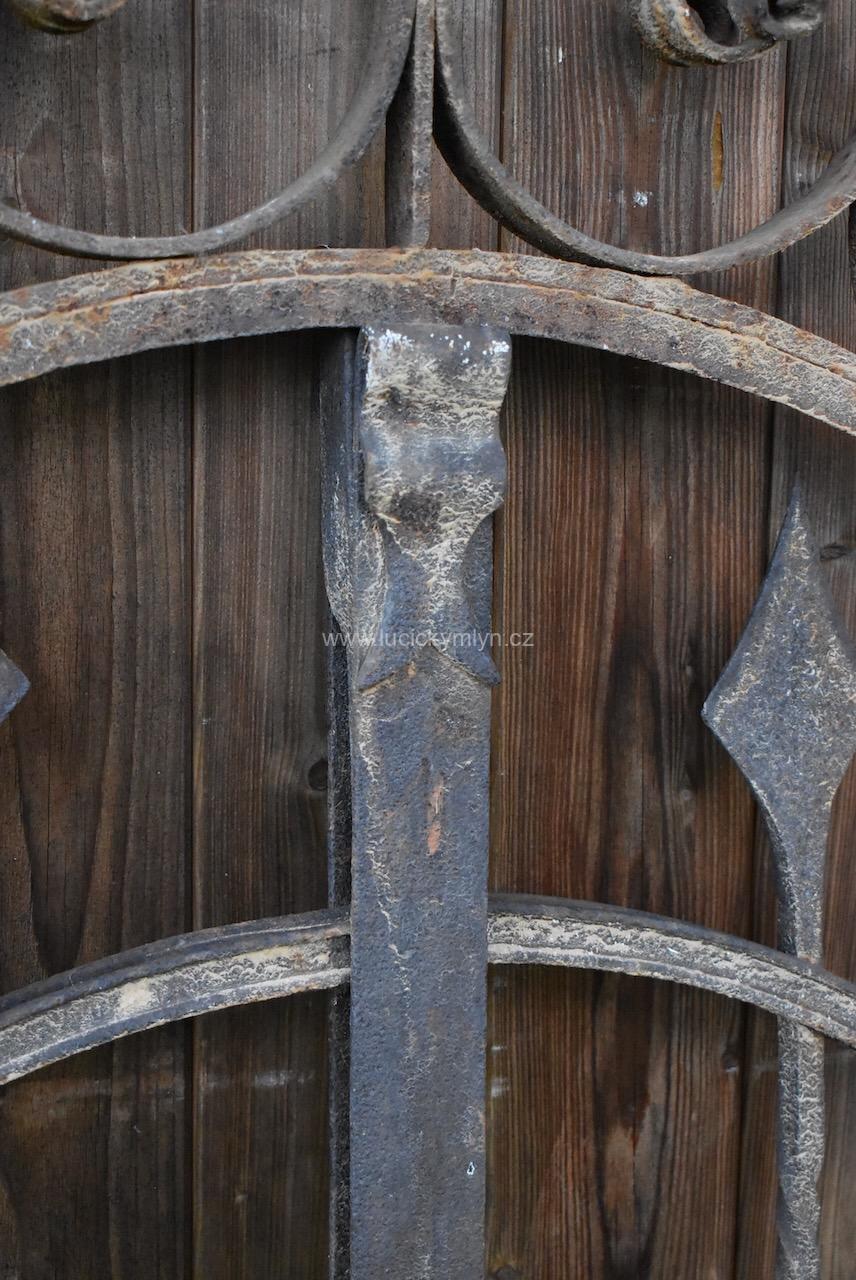 Krásná starožitná umělecky kovaná dvoukřídlá brána s okouzlující vrchní obloukovou ozdobou ze 3.třetiny 19. stol.