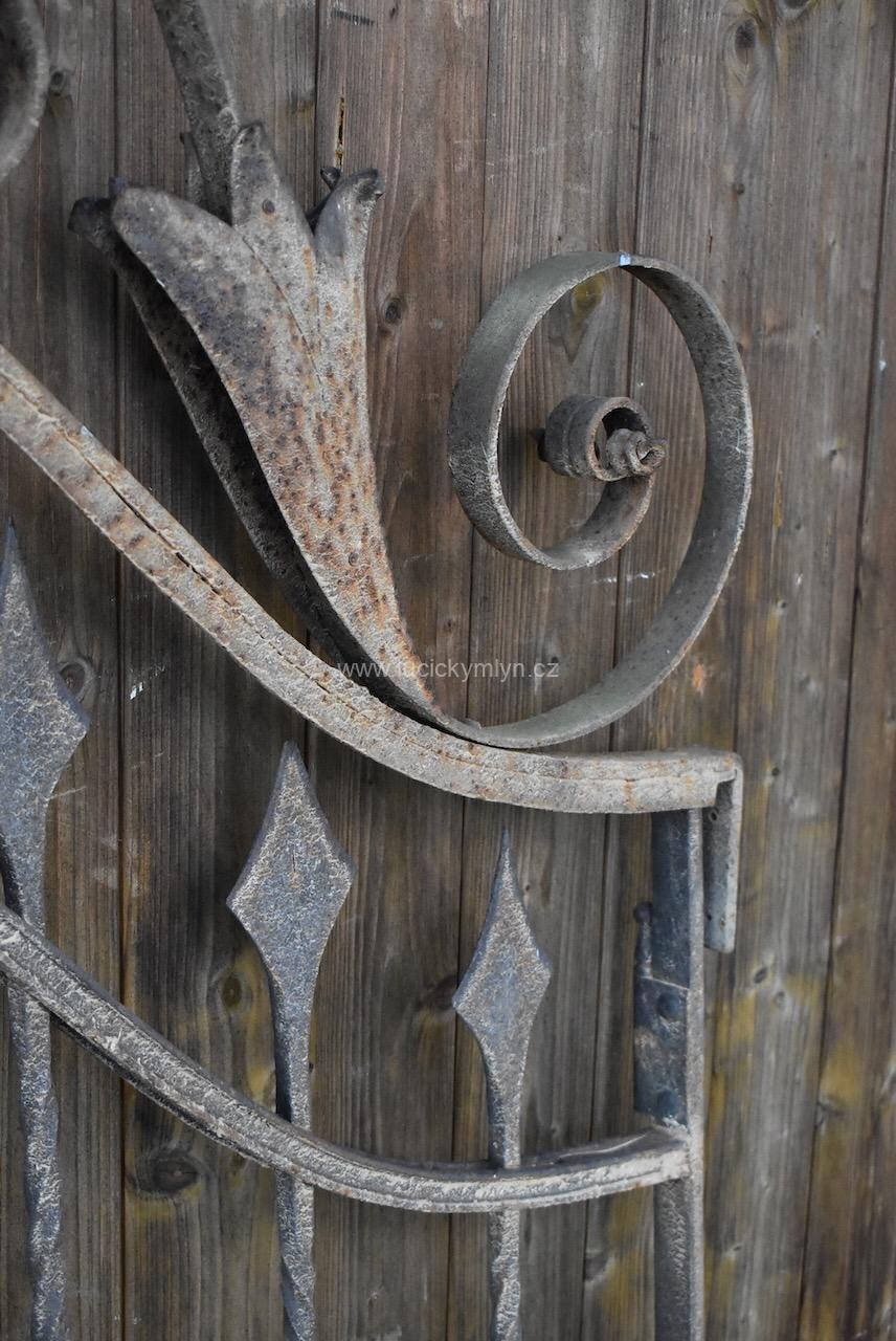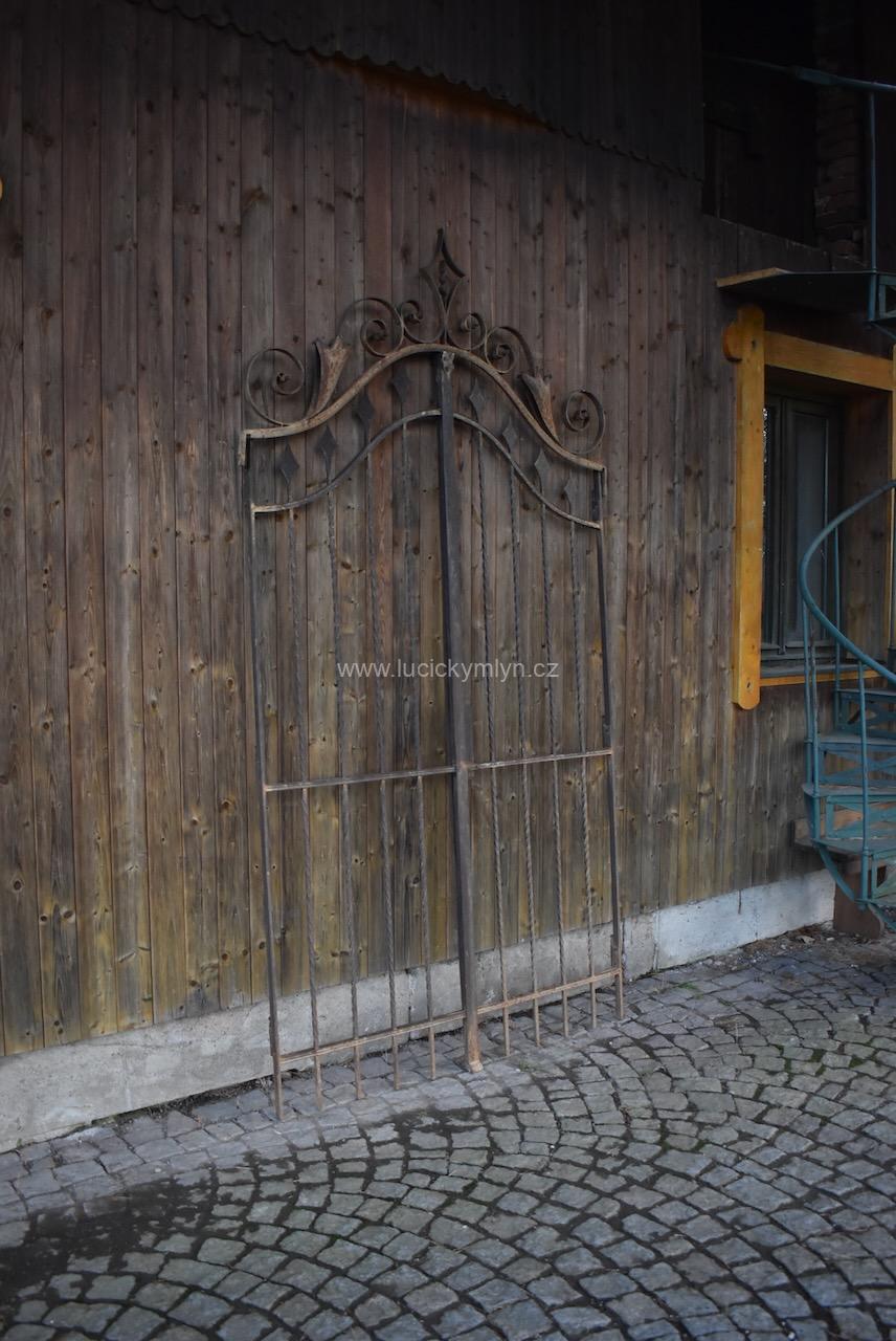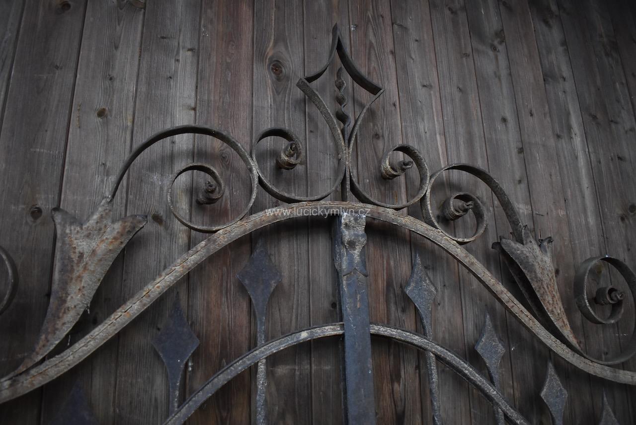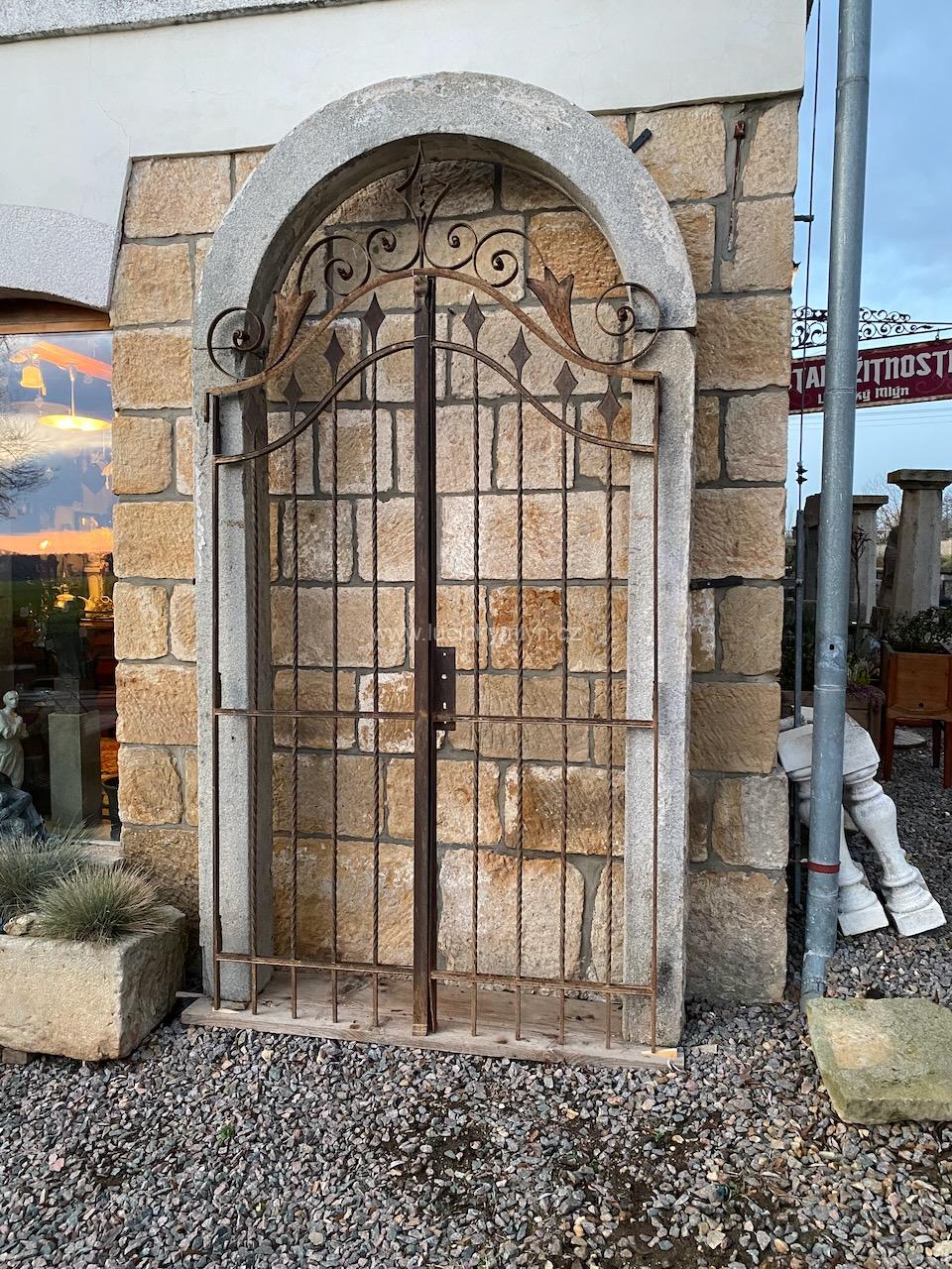 Krásná starožitná umělecky kovaná dvoukřídlá brána s okouzlující vrchní obloukovou ozdobou ze 3.třetiny 19. stol.
