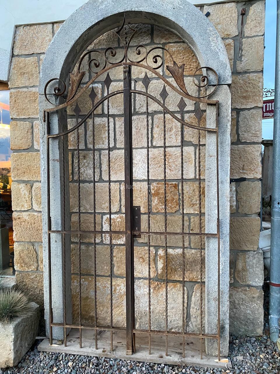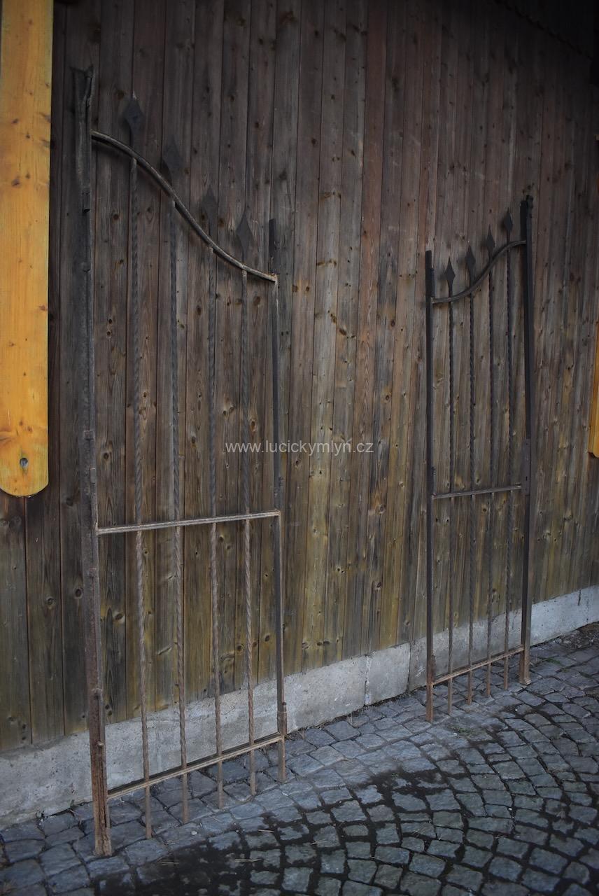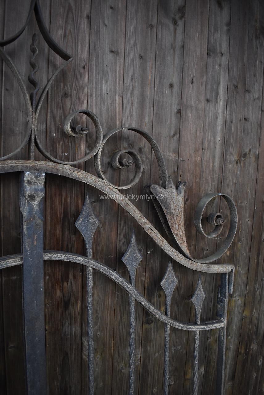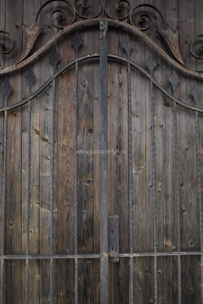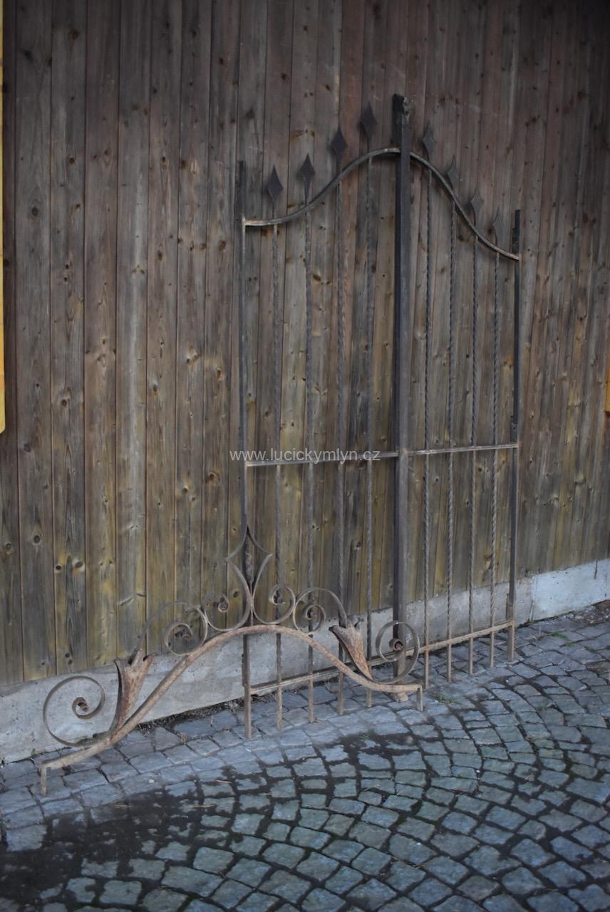 Krásná starožitná umělecky kovaná dvoukřídlá brána s okouzlující vrchní obloukovou ozdobou ze 3.třetiny 19. stol.