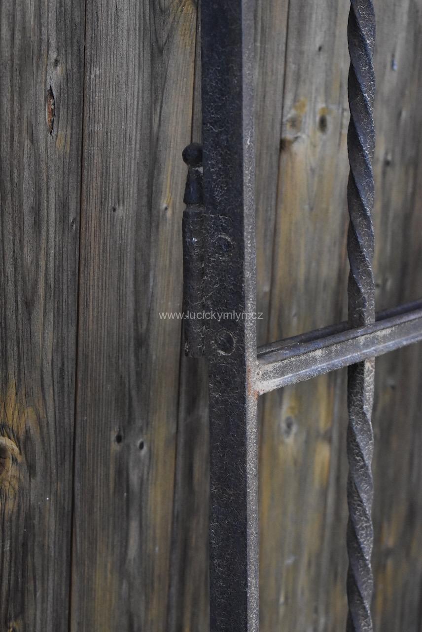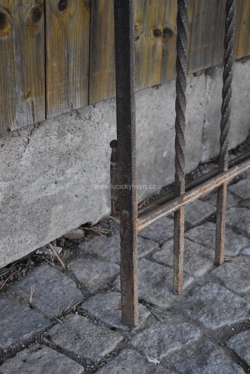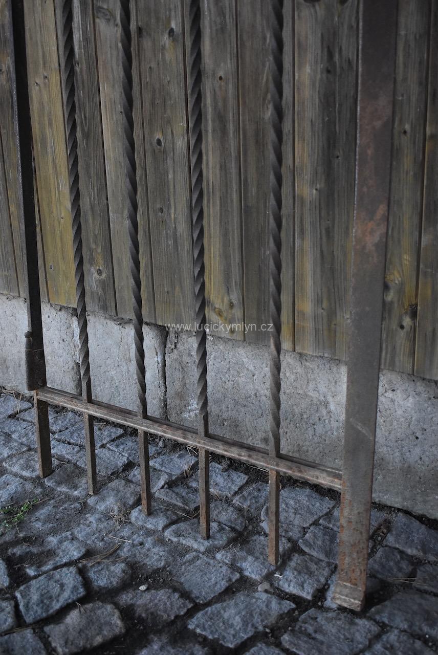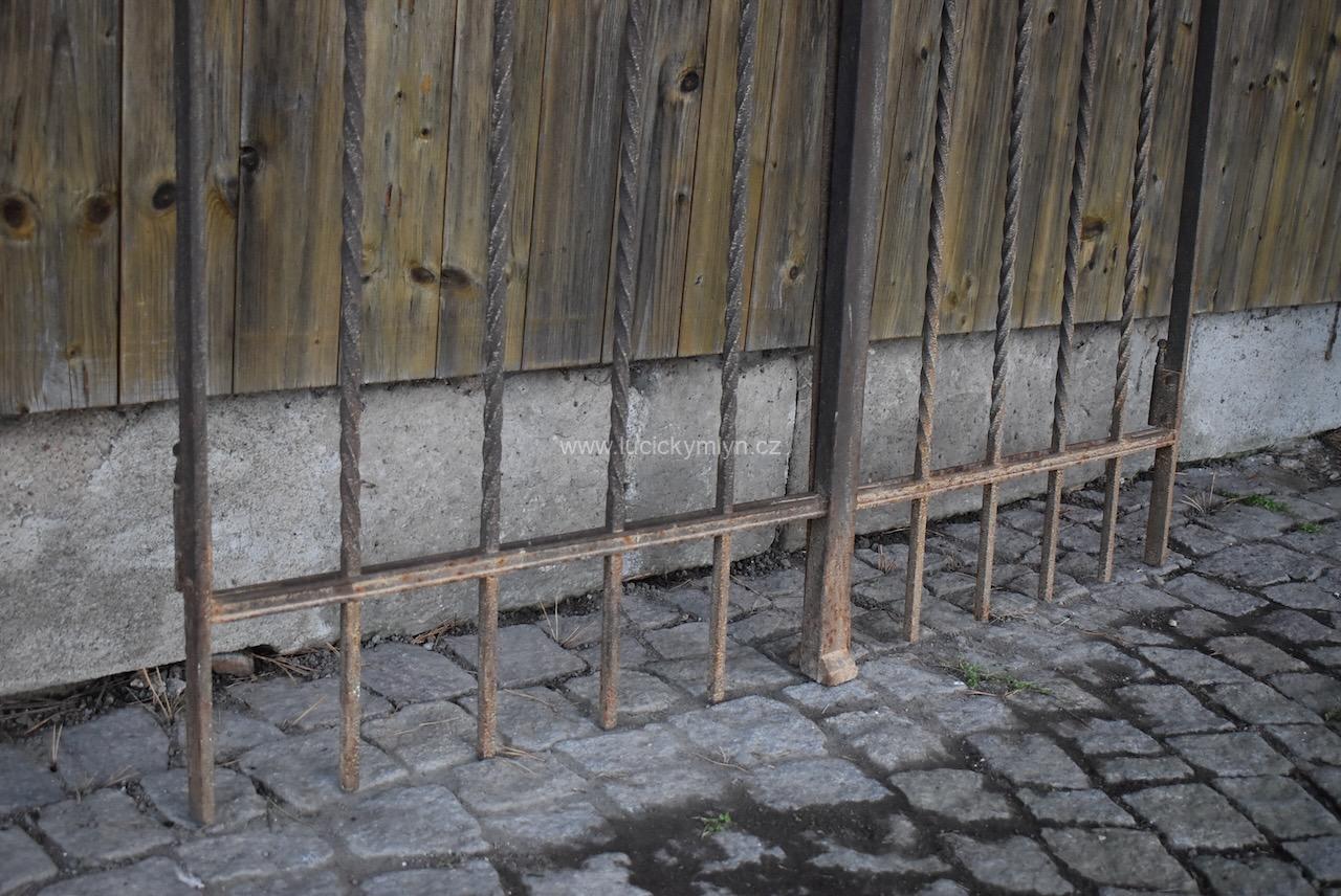 Užší a velmi „vzdušná” brána od staré vily, byla kovářsky vyrobena v okouzlujícím, historizujícím stylu z ručně kovaných, tzv. tordovaných (stáčených) hranolů a pásoviny. I přes více jak staleté, povrchové opotřebení je brána stále zdravá a má velmi kvalitní ocel, která vydrží mnohem více, než dnešní, rychle korodující a výrazně měkčí materiály. Bránu v hezkém stavu, stačí lehce mechanicky očistit či opískovat, mírně porovnat a doplnit rám z pásoviny či „L“ profilu, na který se navaří závěsné panty. Na tento velmi jednoduchý, obvodový rám se nahoře osadí pevná oblouková ozdoba, která je součástí reprezentativní brány. Kovanou ocel je na závěr vhodné opatřit základním a následně i vrchním nátěrem. I pokud by tato brána zůstala zcela bez nátěru, vydržela by nejméně dalších sto let. Nová reprezentativní branka této velikosti a výrazně vyšší úrovně zpracování, Vás jistě vyjde několikanásobně dráž. Chladná krása kovářského řemesla vznikala odedávna ve žhnoucím ohništi. Po tisíciletí ji utvářely neumdlévající ruce kovářovy, poháněné bezbřehou fantazií, umem i nezměrnou touhou po dokonalosti.