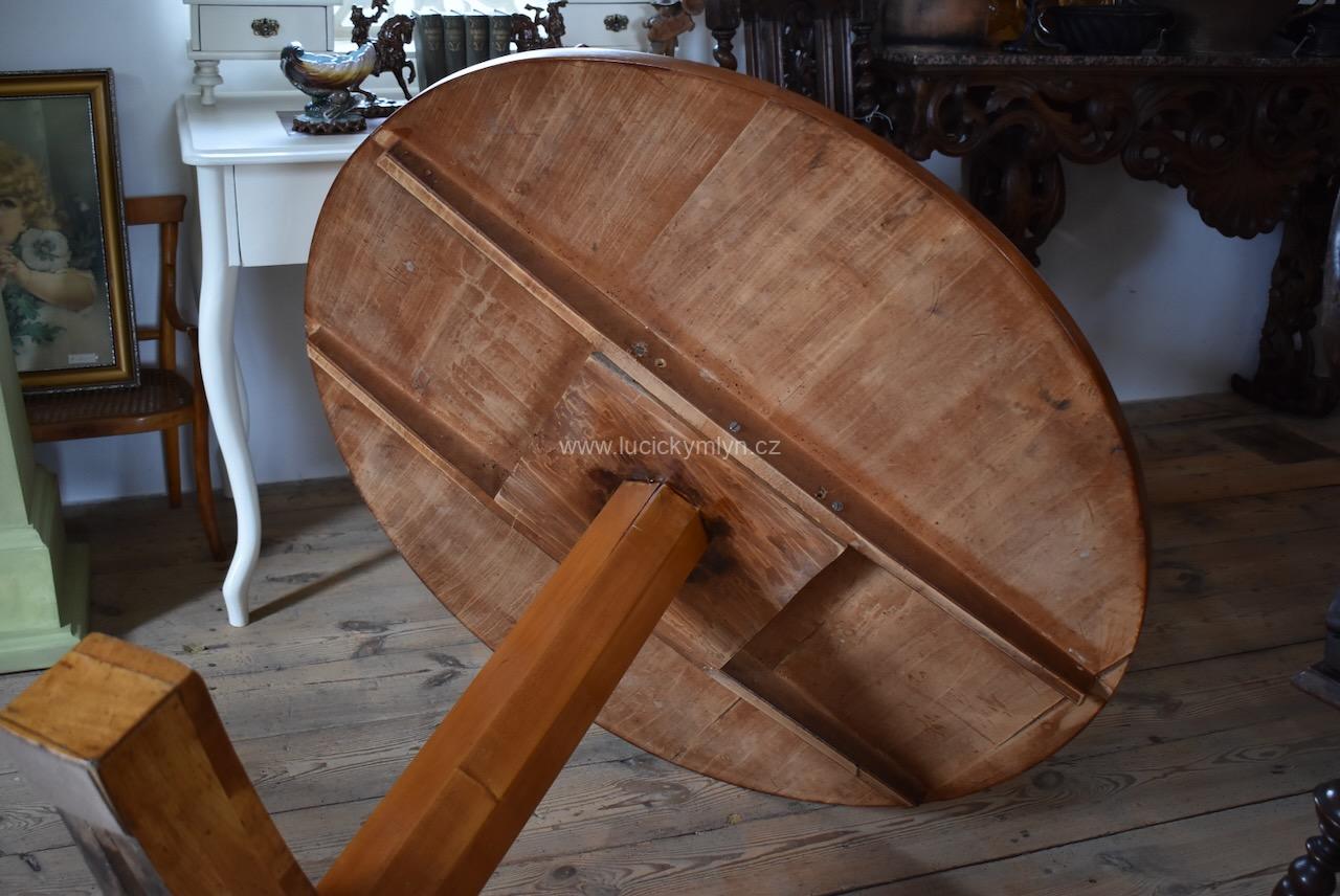 Byl zhotoven z masivního olšového dřeva, mořeného do krásného odstínu třešně. Měšťanský typ nábytku, který postupně přebírali od šlechty a zámožných vrstev i venkovští majitelé mlýnů či nově vznikajících továren a manufaktur. Za tehdy novým módním stylem nemohla zaostávat ani církev. Proto se zachovalo více obdobných stolů i z chudších venkovských far. Tyto barokní nebo klasicistní fary byly většinou nejlépe vystavěnými stavbami hned po případných zámcích. Zanechme úvah o možném původu stolu a vraťme se k popisu jeho konstrukce. Náš kulatý stůl má sundávací desku vyztuženou dvěma zapuštěnými svlaky. Stačí odšroubovat čtyři vruty a deska se uvolní. Noha stolu je štíhlým osmibokým sloupkem, dole zakončeným výrazně černě lakovanou přechodovou lištou. Široce rozevřená tří-ramenná podstava je elegantně vykrojená. Její sendvičová konstrukce z vrstveného masivního dřeva je odolná pnutí dřeva i jeho sesychání. Tato varianta stolu sice nemá honosně skládanou dýhu do figur, ale i tak se jedná o kvalitní řemeslo z hezky upraveného masivu. Výsledkem je kvalitní a nejen na svou dobu moderní stůl. Toto období bylo později nazvané biedermeier.