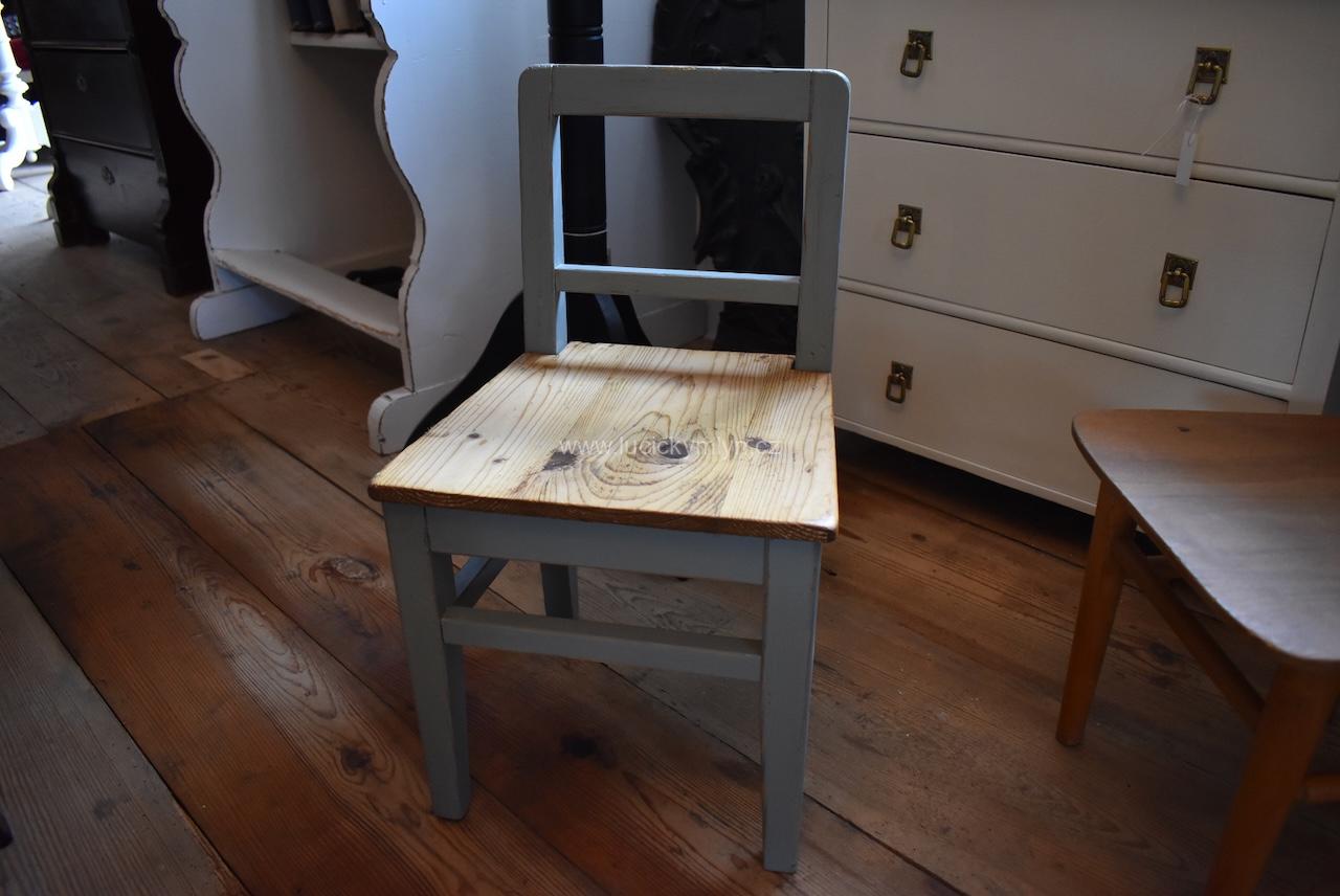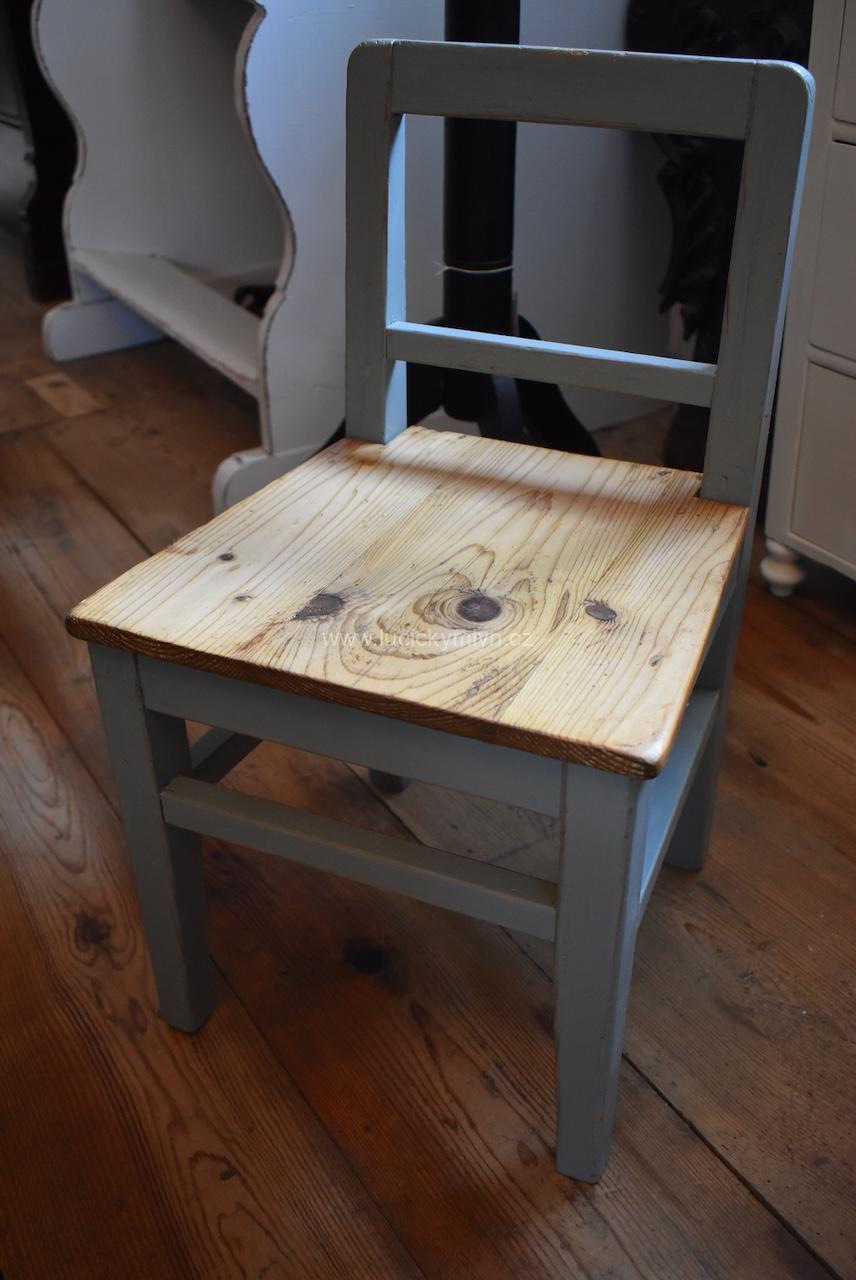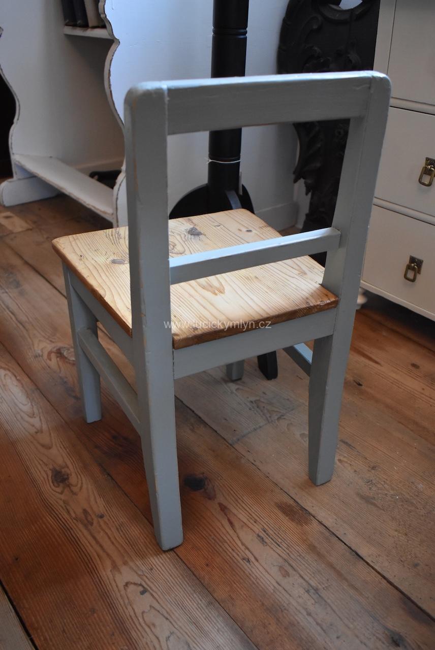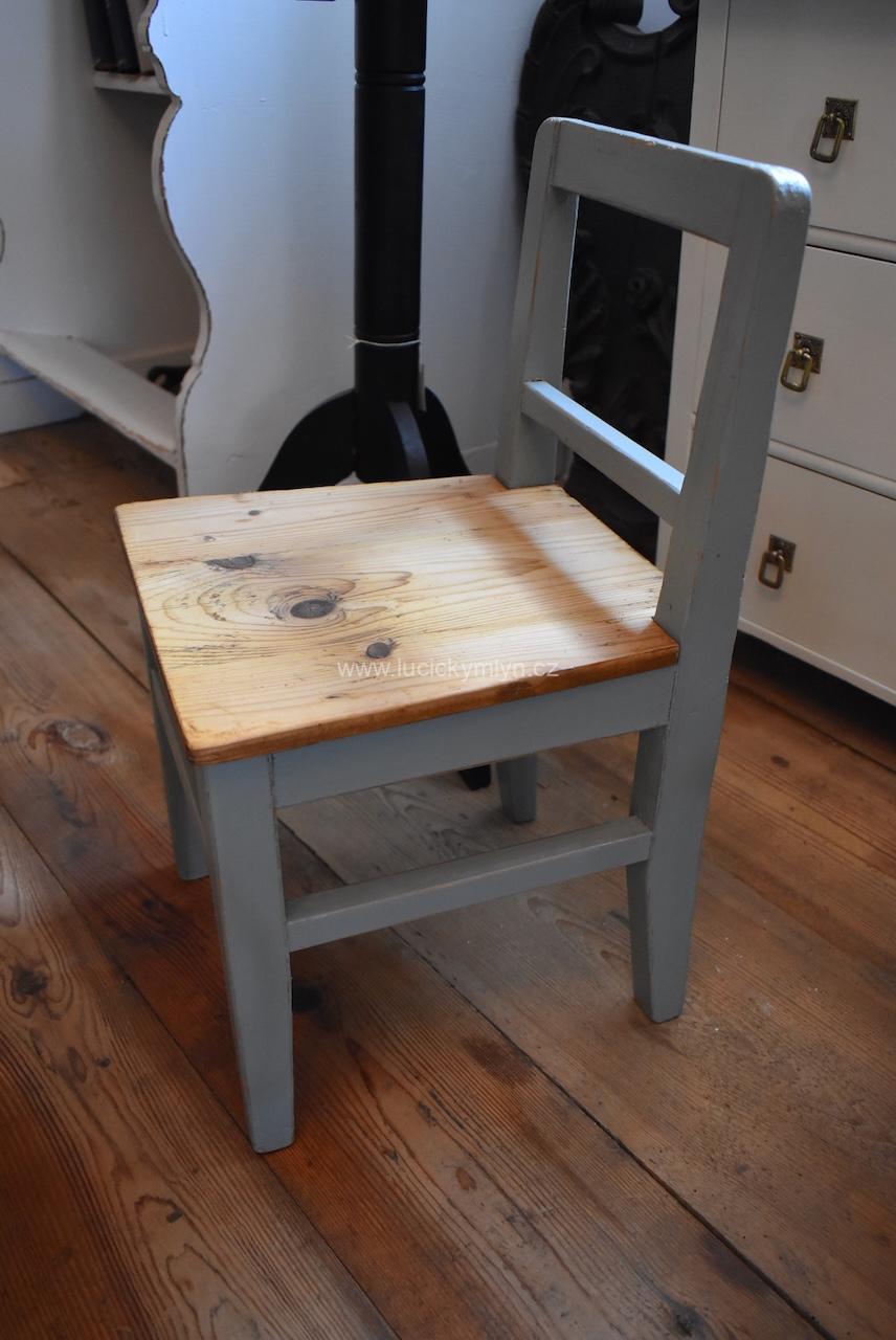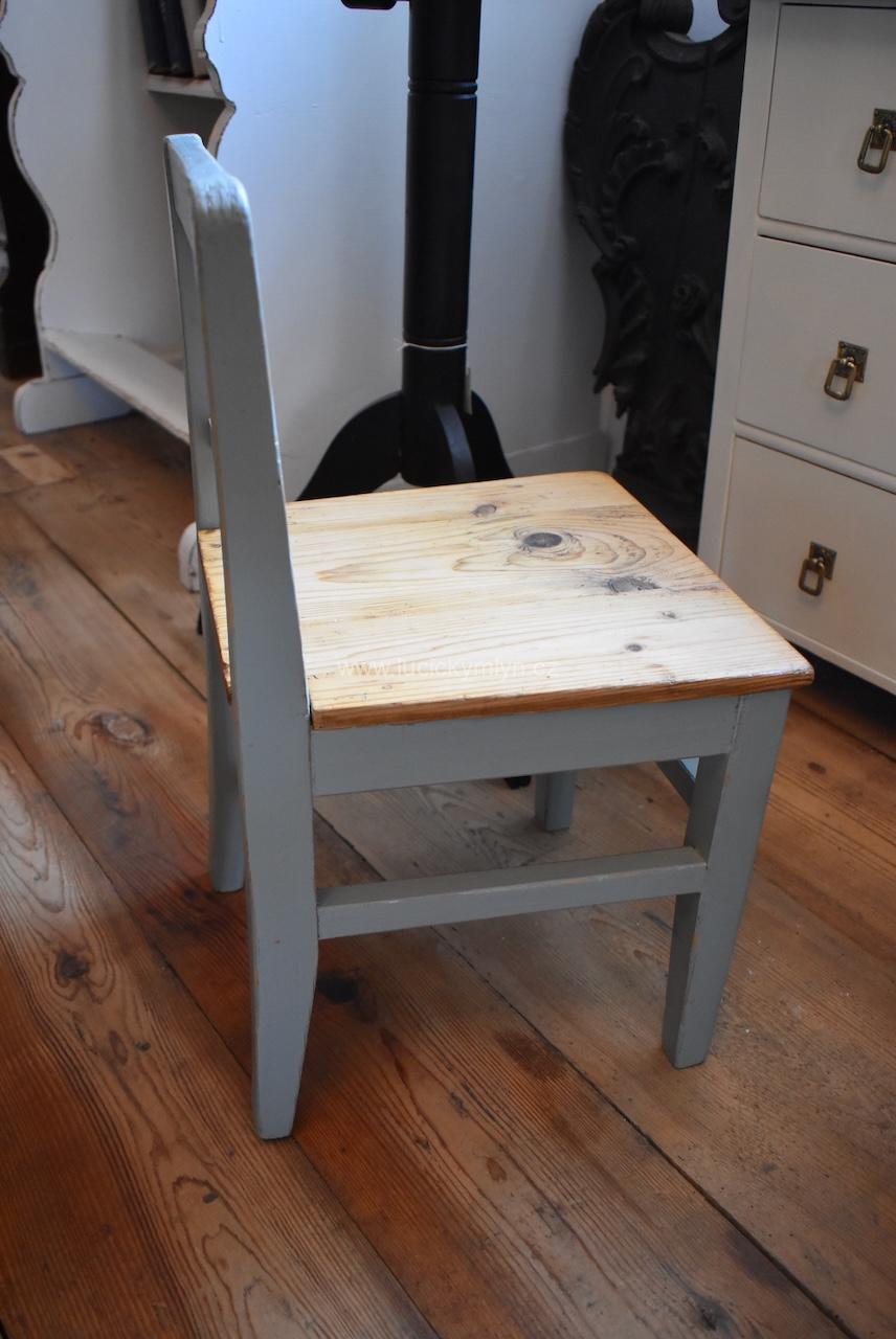 Malá starožitná dětská židlička z období po roce 1910 si jistě zasloužila pečlivou RENOVACI a vkusný šedý nátěr