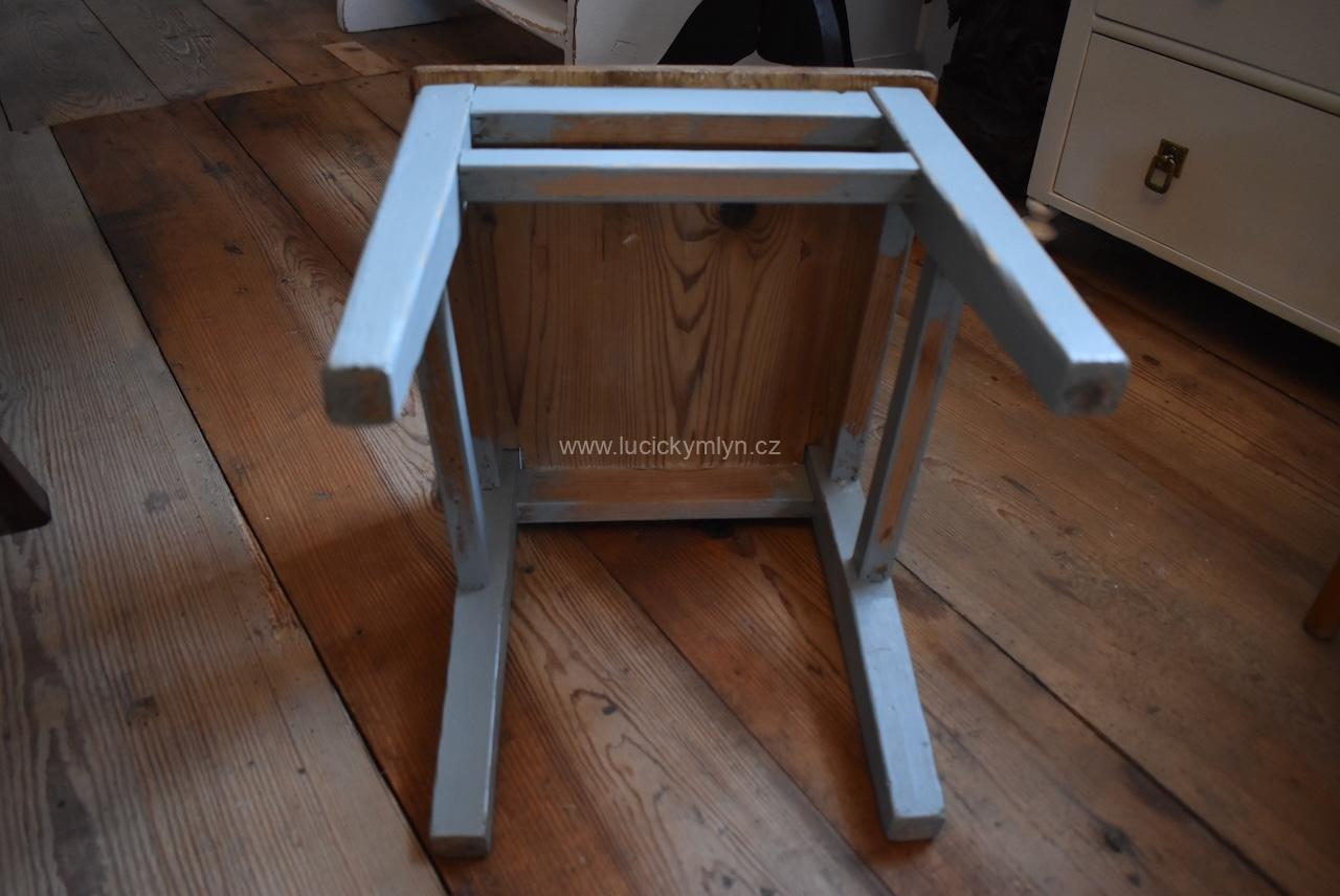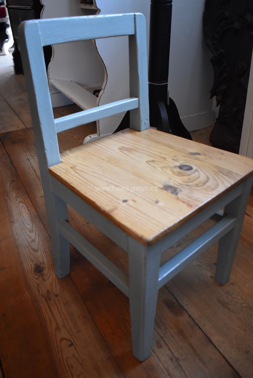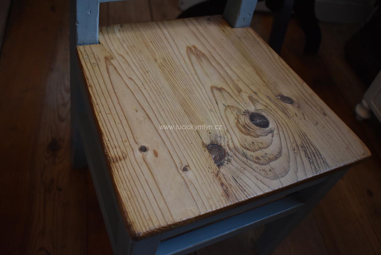 Dětská venkovská židlička s širokým sedákem i opěradlem, byla poctivě truhlářsky vyrobena ze smrkového dřeva a po stu letech, téměř nepřetržitého užívání, preventivně ošetřena proti červotoči. Po truhlářské renovaci, ošetření a nátěru čepované konstrukce, jsme na smrkový sedák pro změnu použili čirý lak. Povrch židličky, byl na frekventovaných hranách, citlivě náznakově probroušen, aby se umocnil jeho historický charakter.