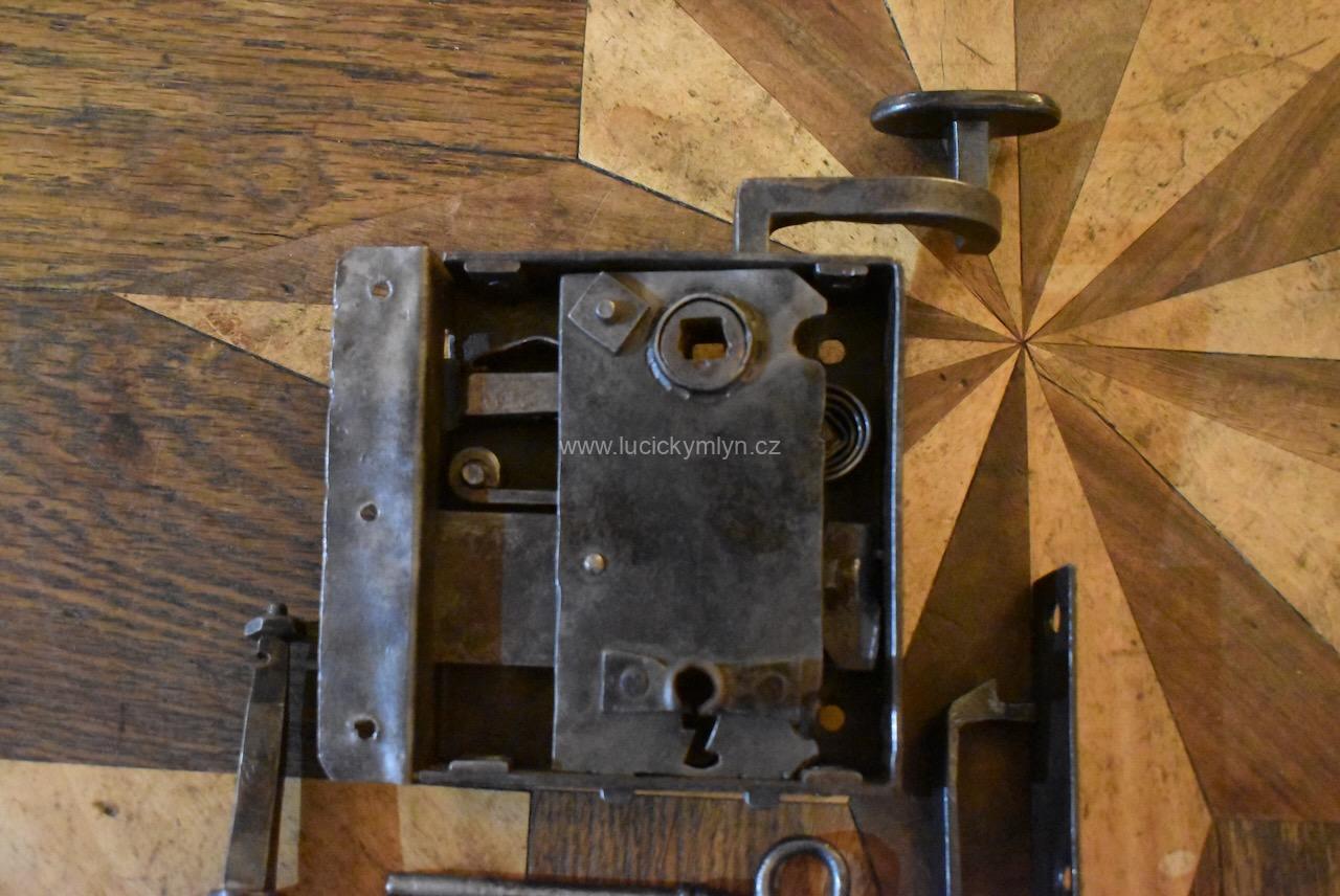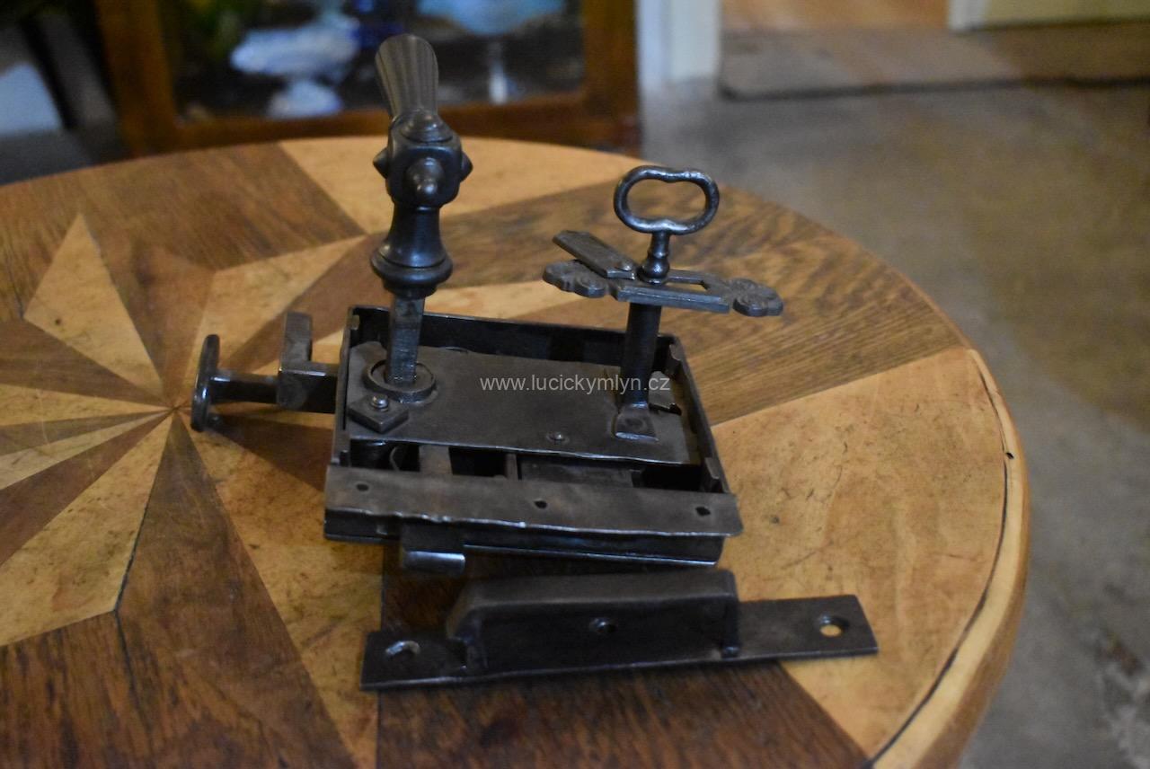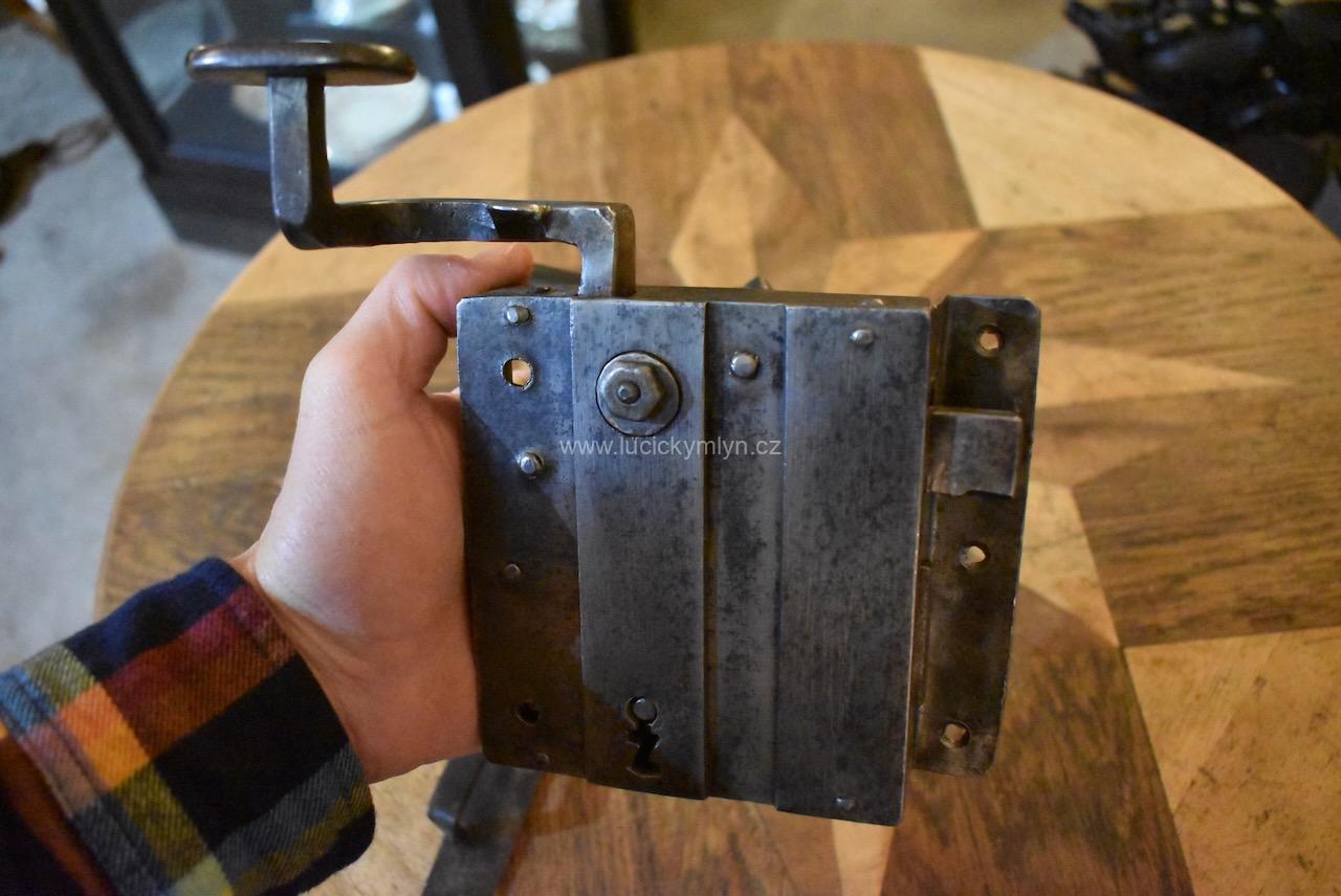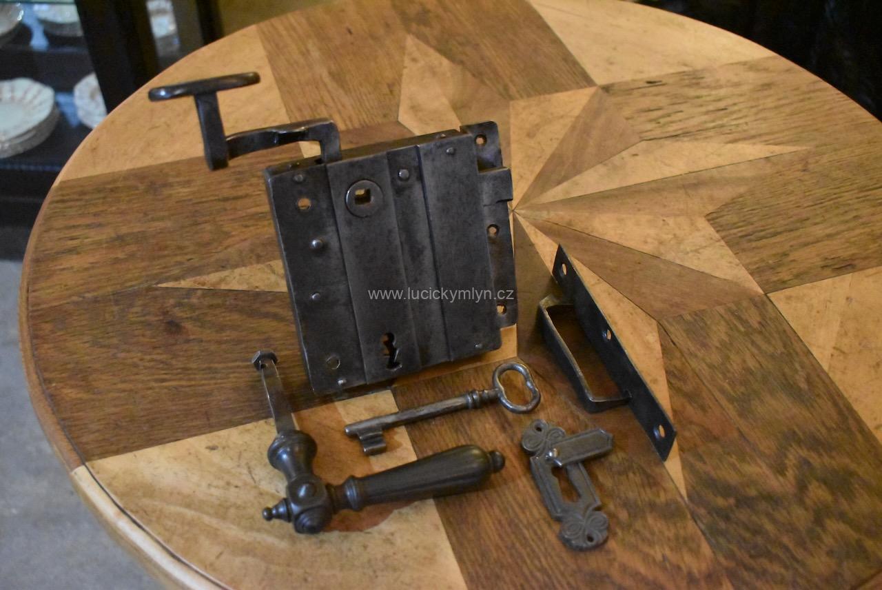 Menší starožitný dveřní zámek krabicového typu i s funkčním klíčem pocházející ze 2. pol. 19.stol.