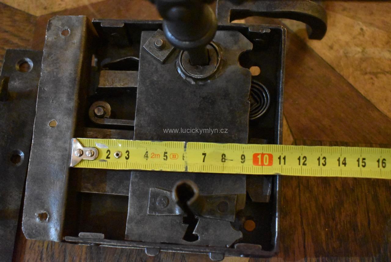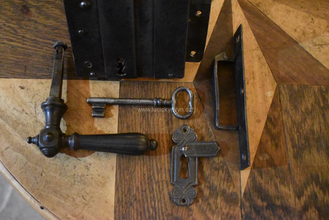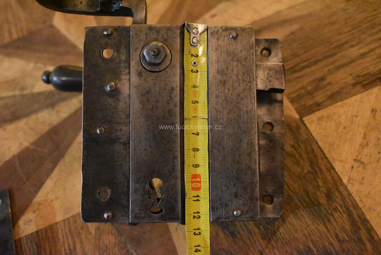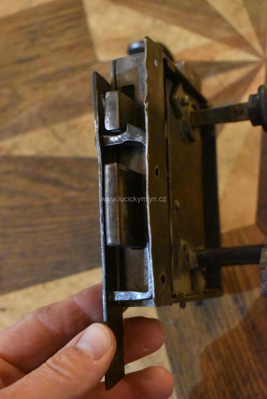 Menší starožitný dveřní zámek krabicového typu i s funkčním klíčem pocházející ze 2. pol. 19.stol.