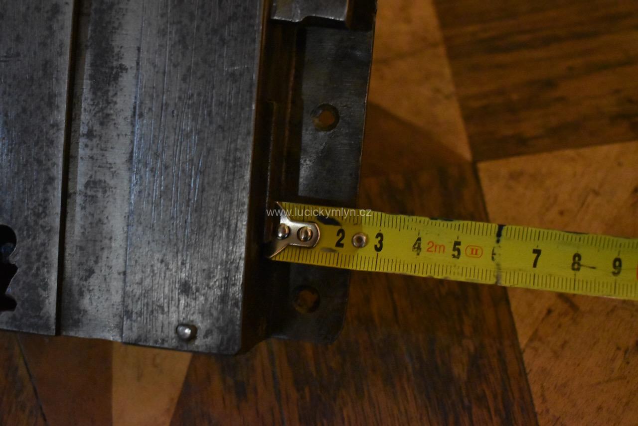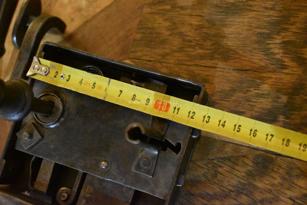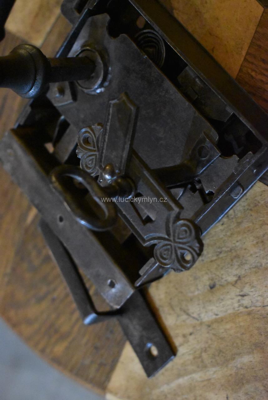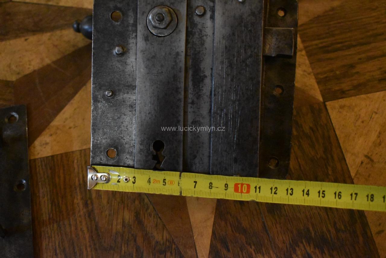 Menší starožitný dveřní zámek krabicového typu i s funkčním klíčem pocházející ze 2. pol. 19.stol.