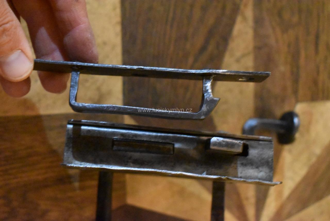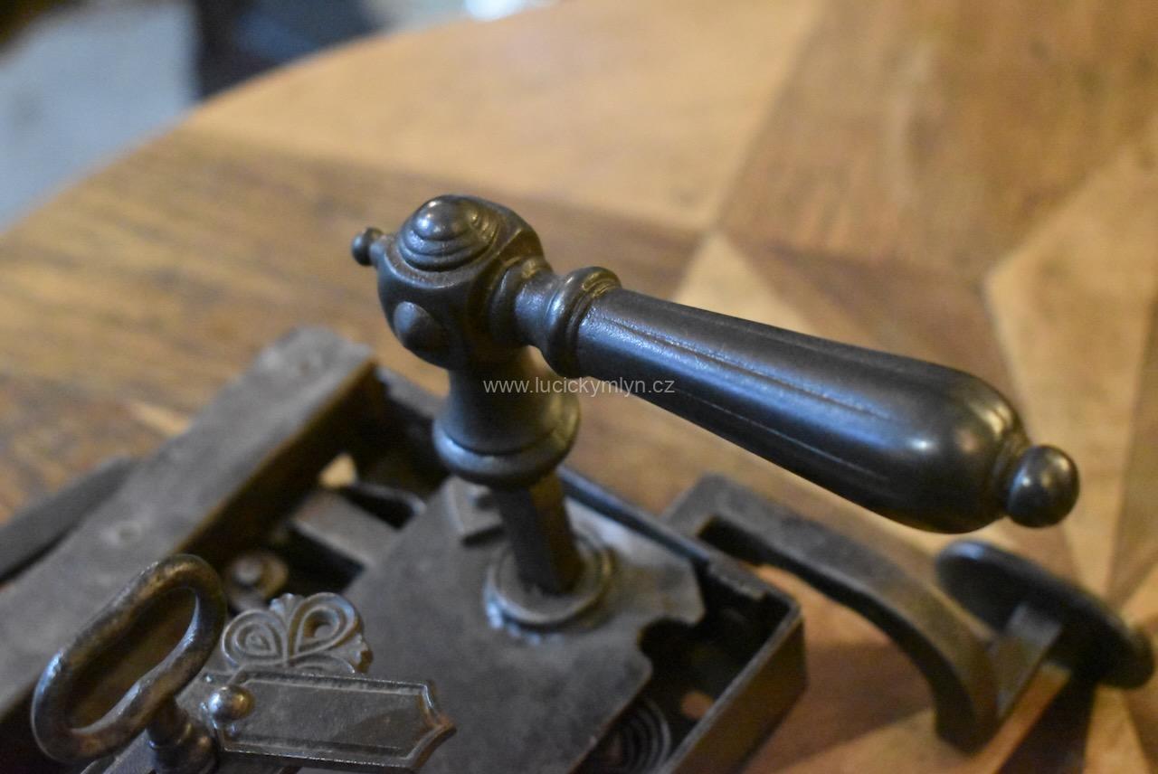 Venkovský zámek ze vchodových dveří nebo branky je na vnitřní straně osazený ocelovou klikou s tlačným terčíkem, která je jeho součástí. Vnitřní klika vyrobená převážně z ozdobné litiny má kónusové uložení, zakončené závitovým zajištěním s matkou. Tento generacemi osvědčený typ pevného a funkčního zámku má klíč a byl vyroben v pozdně klasicistním stylu. Zámek lze uzamknout až na dvě polohy. Nyní je starožitný krabicový zámek s funkčním klíčem, štítkem klíčového otvoru i protikusem, který se šroubuje k dveřnímu rámu, po celkové renovaci. Zámečnicky vyrobený zámek, starý okolo 150 let je promazaný a konzervovaný voskovým nátěrem.