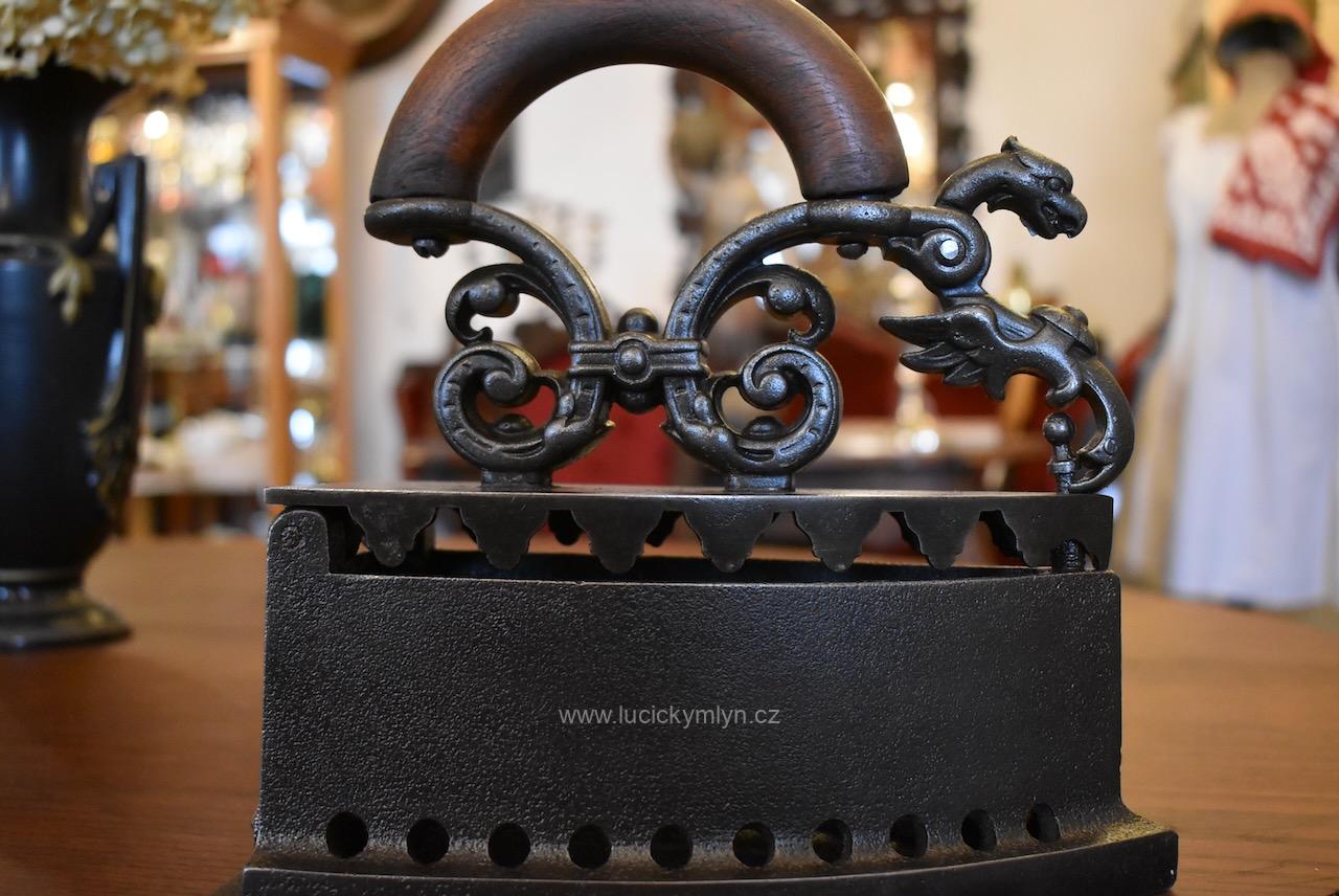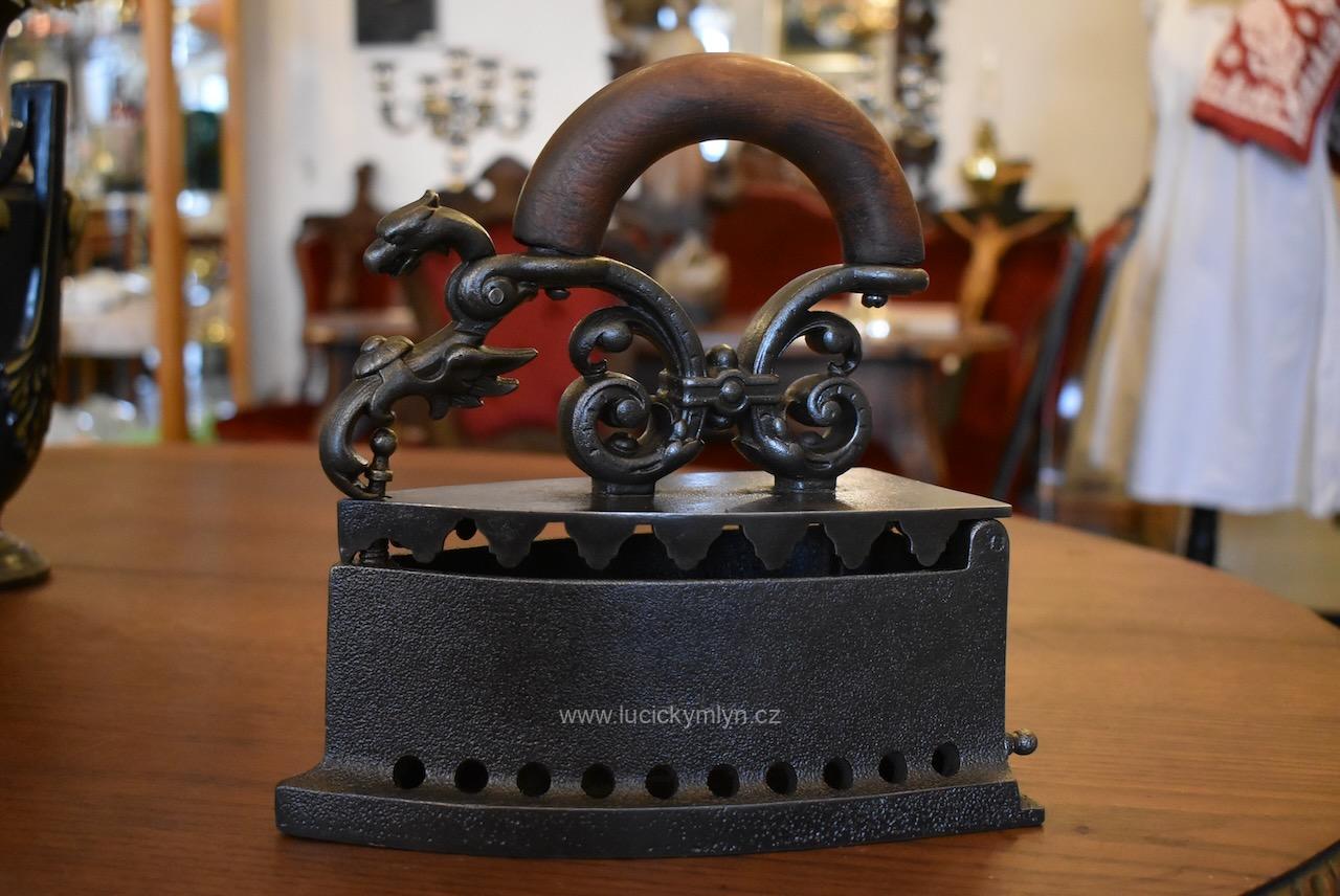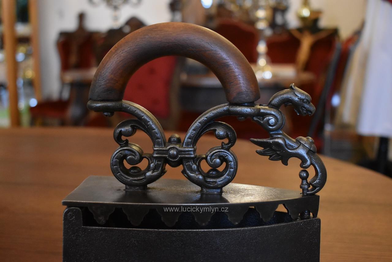 Žehlička má nadstandardní a romanticky provedený odklápěcí mechanismus a prodlužovací symetrický nástavec, evokující krásného pohádkového draka, přikrášleného četnými rostlinnými volutkami a listovým. Renesančně ztvárněný nástavec, účinně chránící ruku před sálajícím horkem, je osazený obloukovým držadlem z masivního bukového dřeva. Okouzlující starožitná žehlička se zachovala ve velmi dobrém a původním stavu. Uvnitř je označena číslem 5 a židovskou hvězdou. Tato sběratelsky zajímavá žehlička byla ztvárněna v romantickém duchu dávné renesance ve 2. pol. 19. století. Nyní po vyčištění, přeleštění a konzervaci.