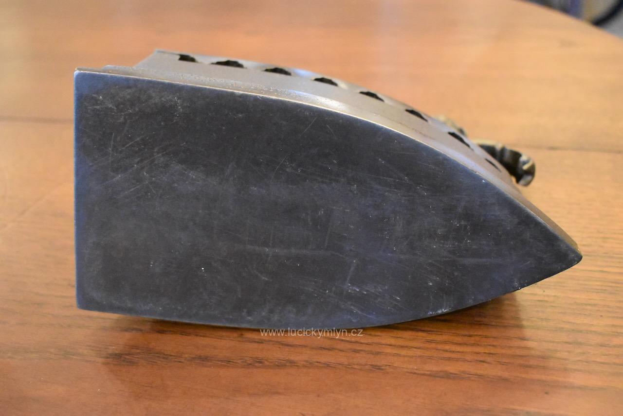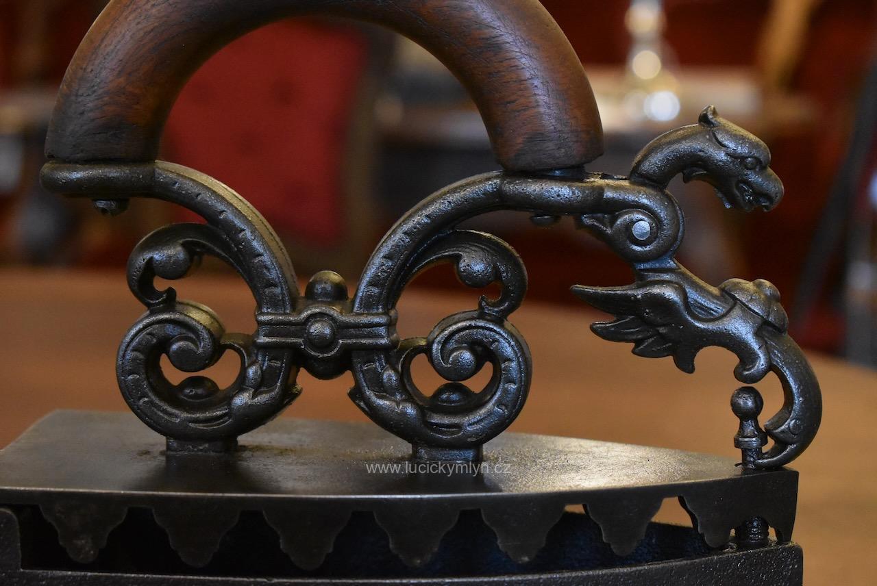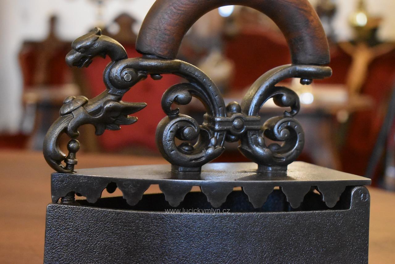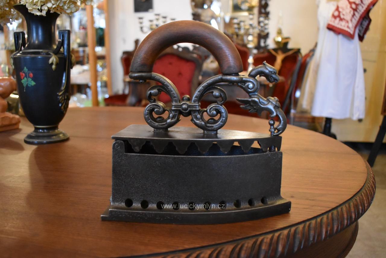 Žehlička má nadstandardní a romanticky provedený odklápěcí mechanismus a prodlužovací symetrický nástavec, evokující krásného pohádkového draka, přikrášleného četnými rostlinnými volutkami a listovým. Renesančně ztvárněný nástavec, účinně chránící ruku před sálajícím horkem, je osazený obloukovým držadlem z masivního bukového dřeva. Okouzlující starožitná žehlička se zachovala ve velmi dobrém a původním stavu. Uvnitř je označena číslem 5 a židovskou hvězdou. Tato sběratelsky zajímavá žehlička byla ztvárněna v romantickém duchu dávné renesance ve 2. pol. 19. století. Nyní po vyčištění, přeleštění a konzervaci.