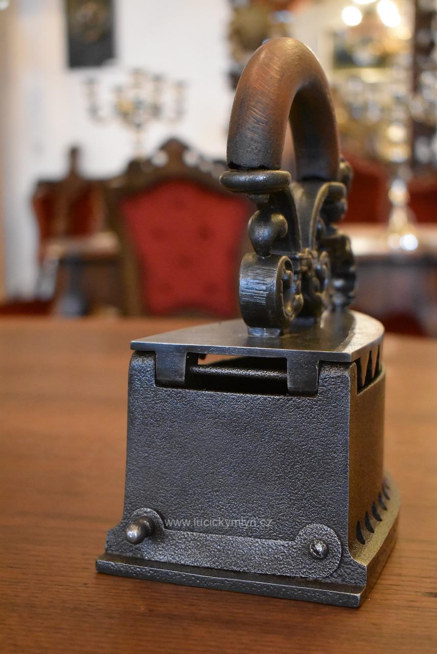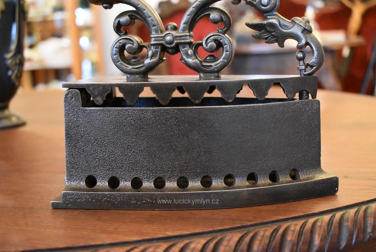 Mimořádně pěkná a hodnotnější starožitná žehlička z umělecké litiny tzv. parník, vyhřívaná dřevěným uhlím