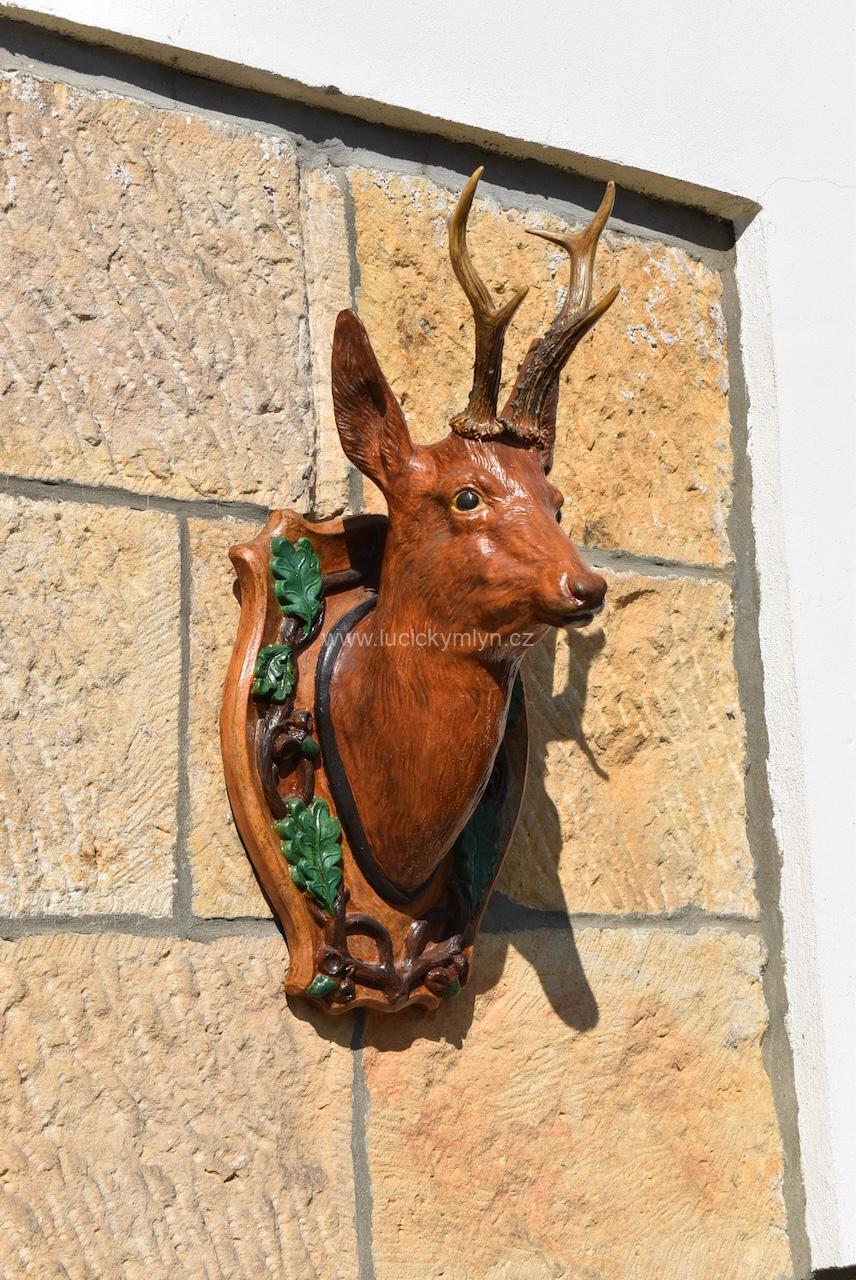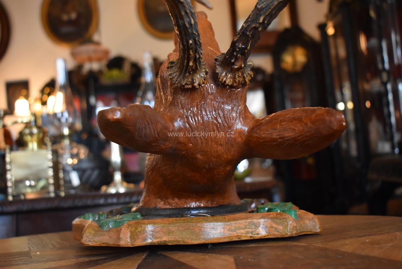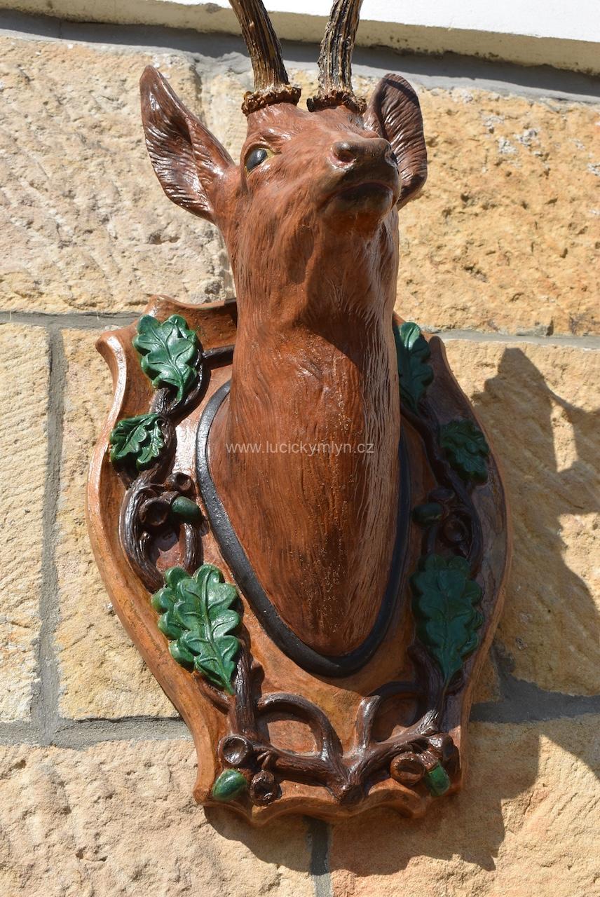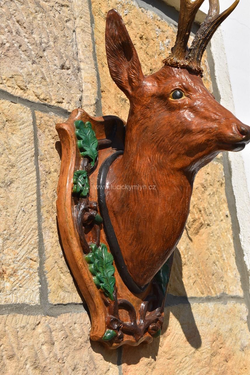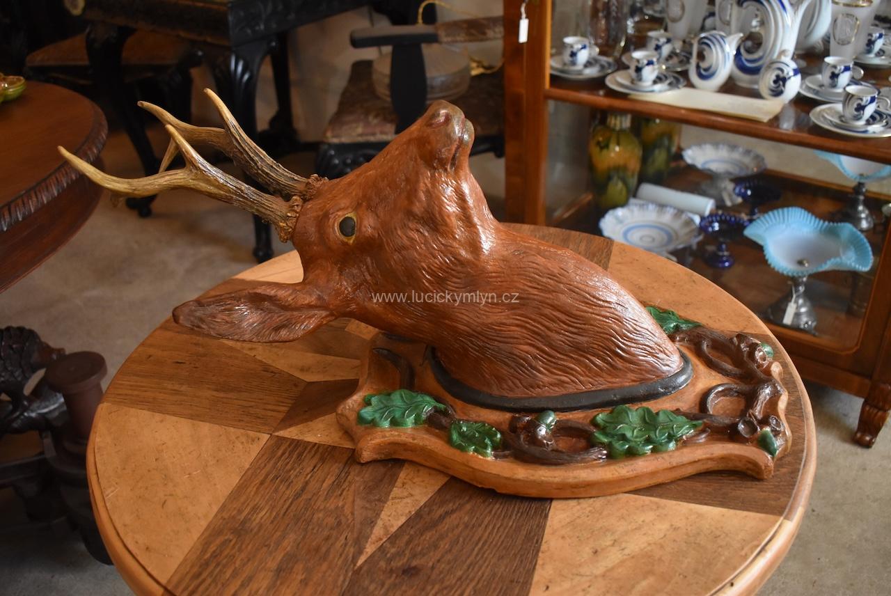 Nástěnná starožitná dekorace z hájovny – tvrdá keramika, věrně zpodobňující srnčí trofej na ozdobně řezané podložce