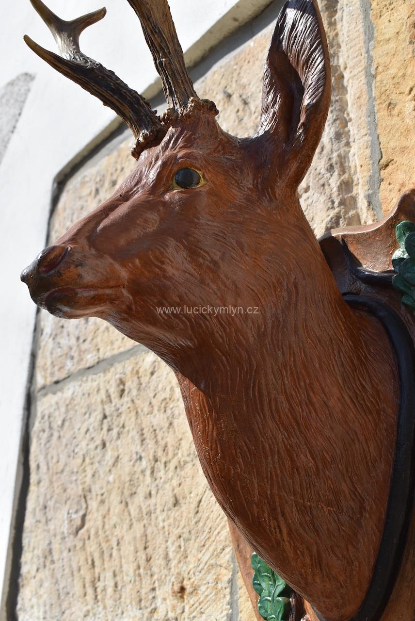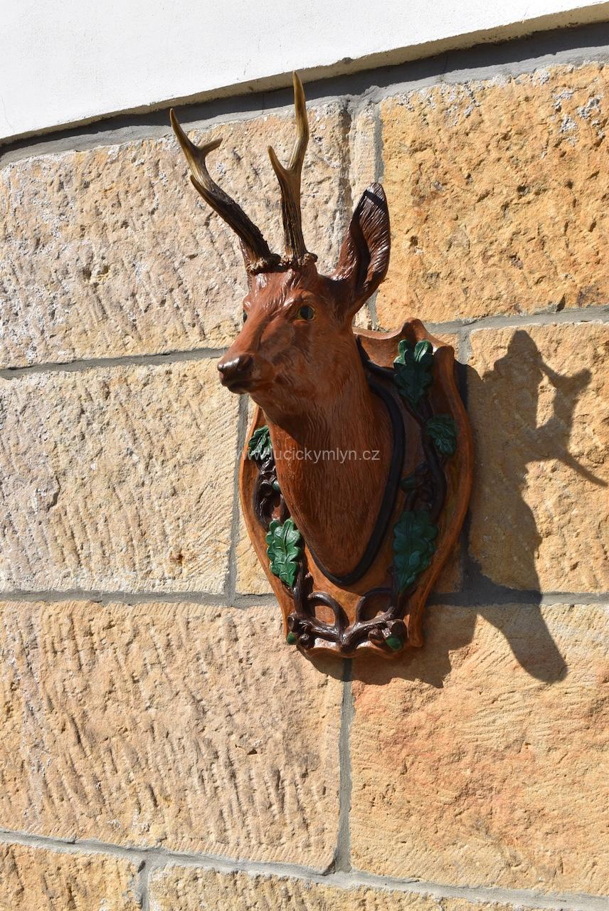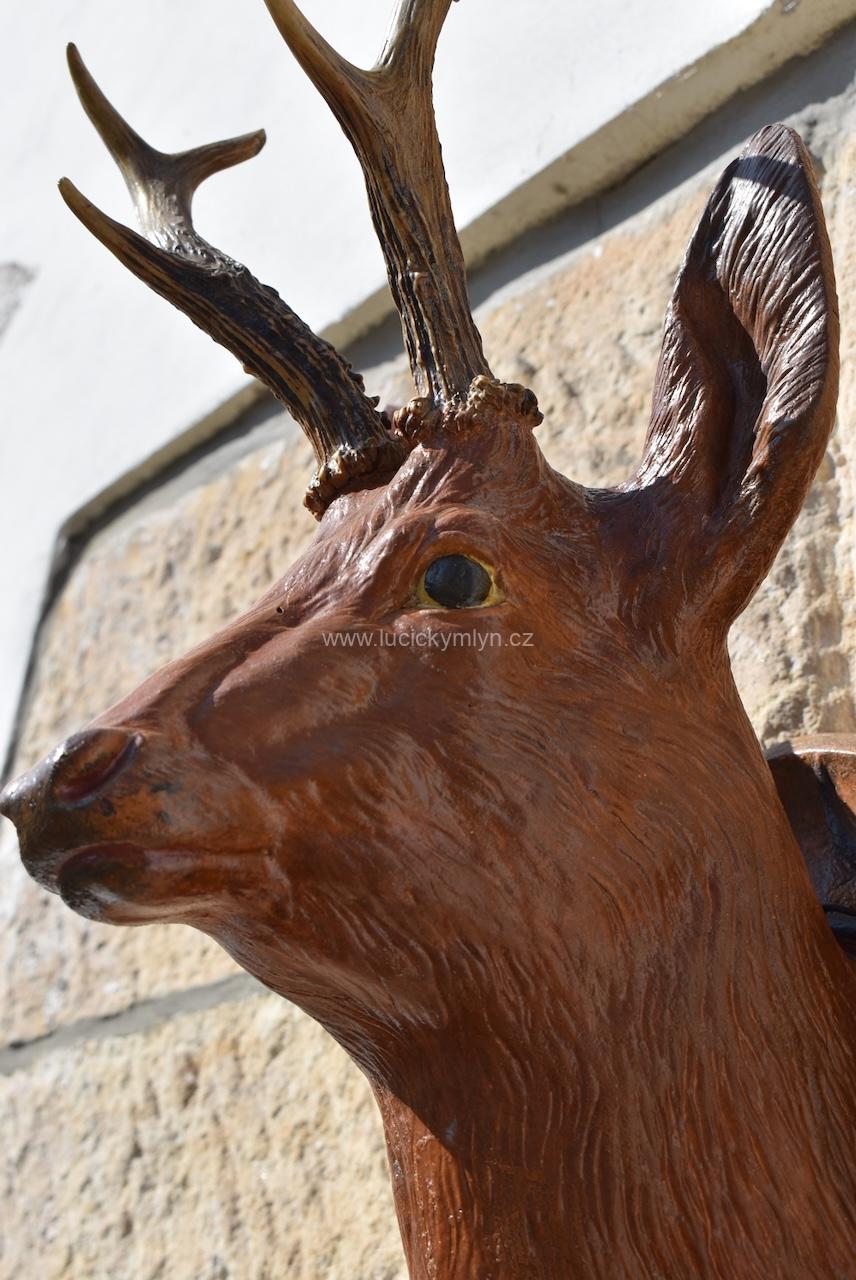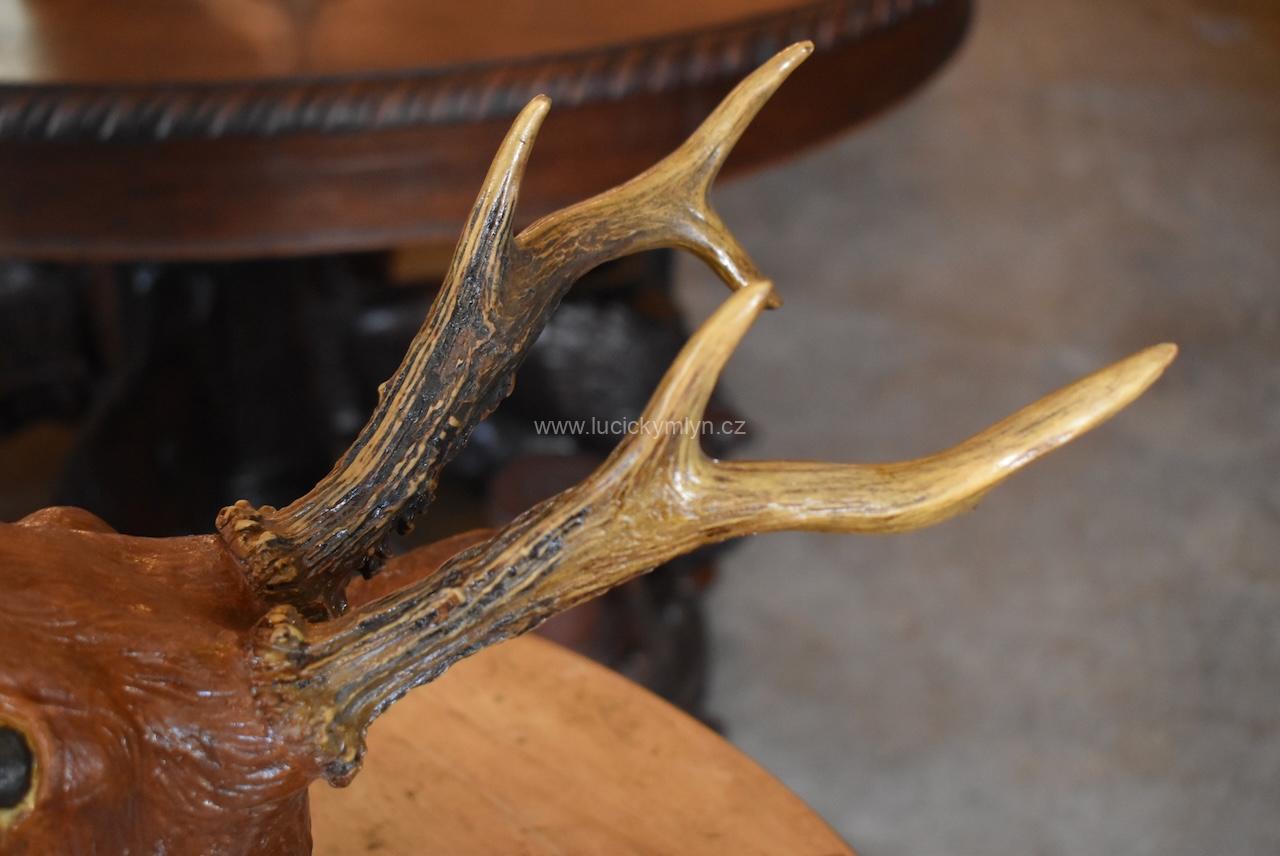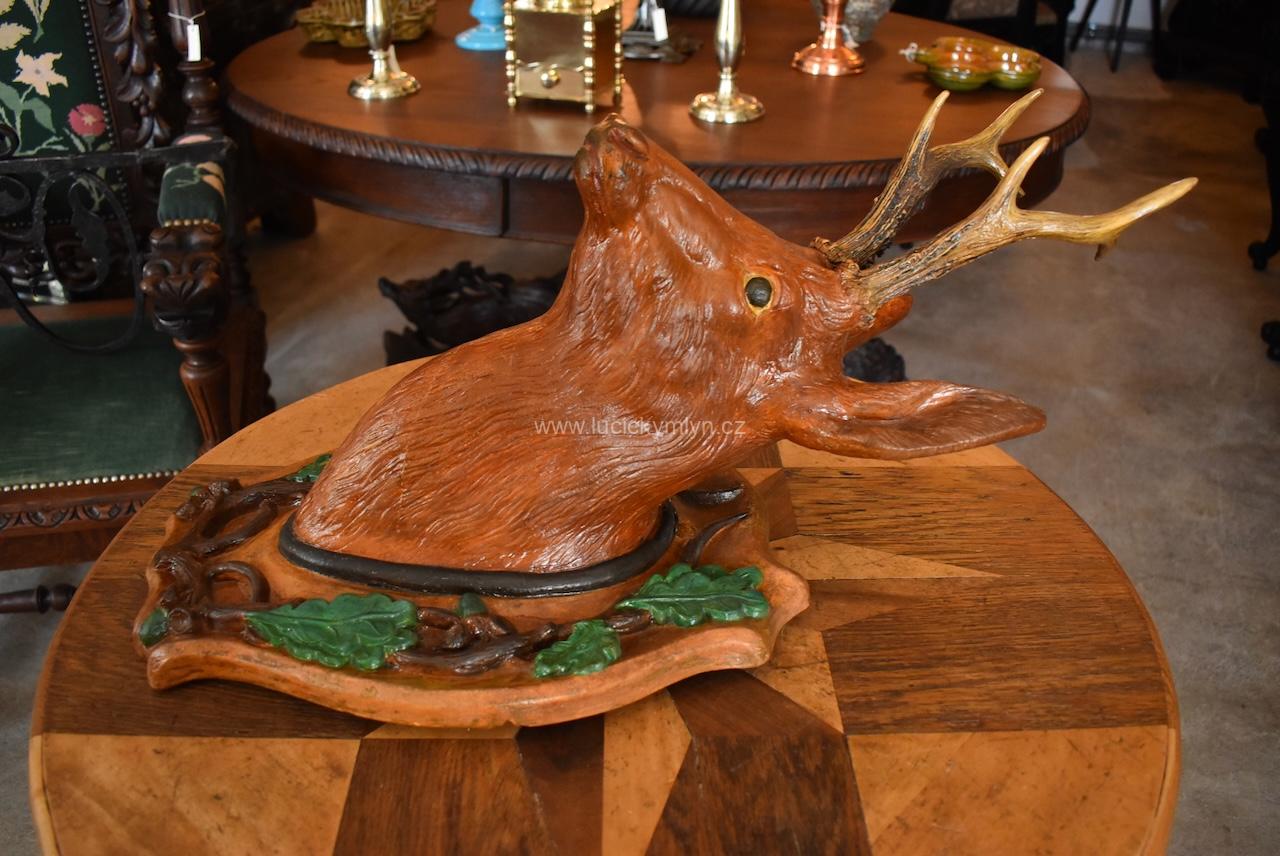 Nástěnná starožitná dekorace z hájovny – tvrdá keramika, věrně zpodobňující srnčí trofej na ozdobně řezané podložce
