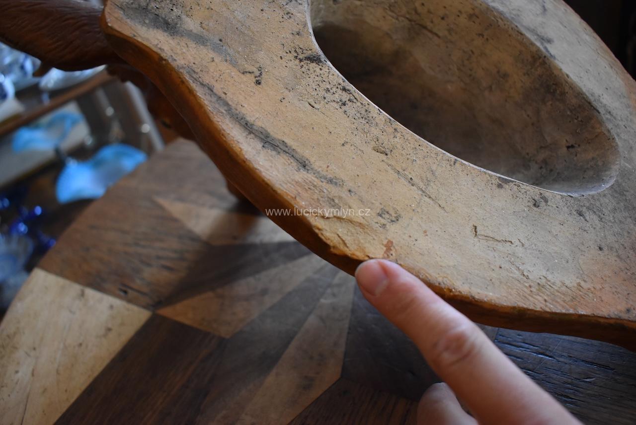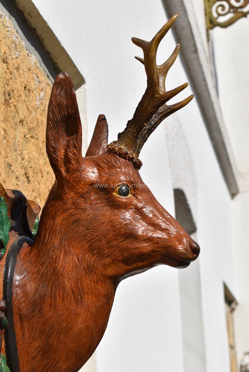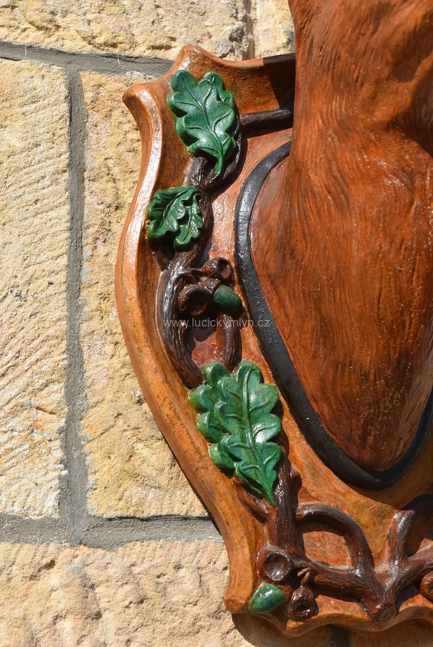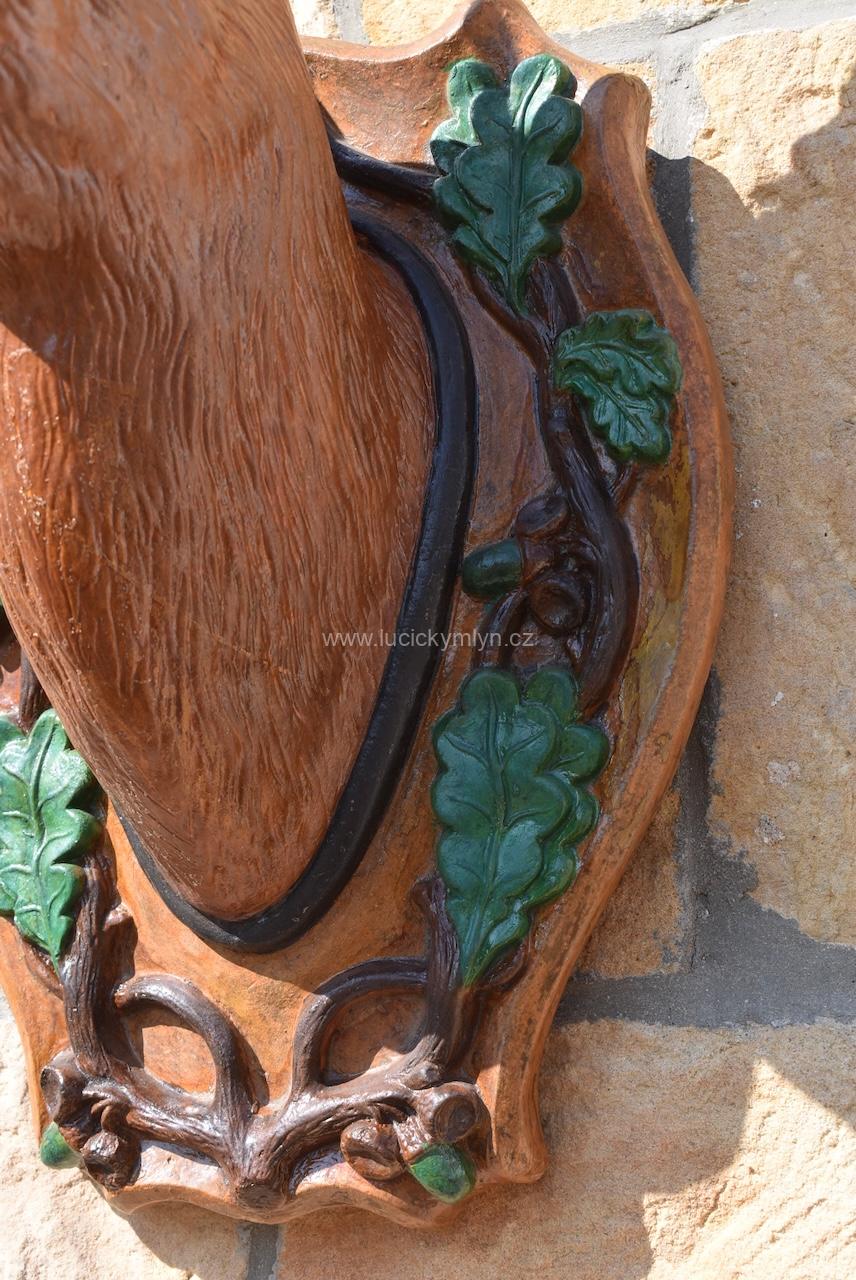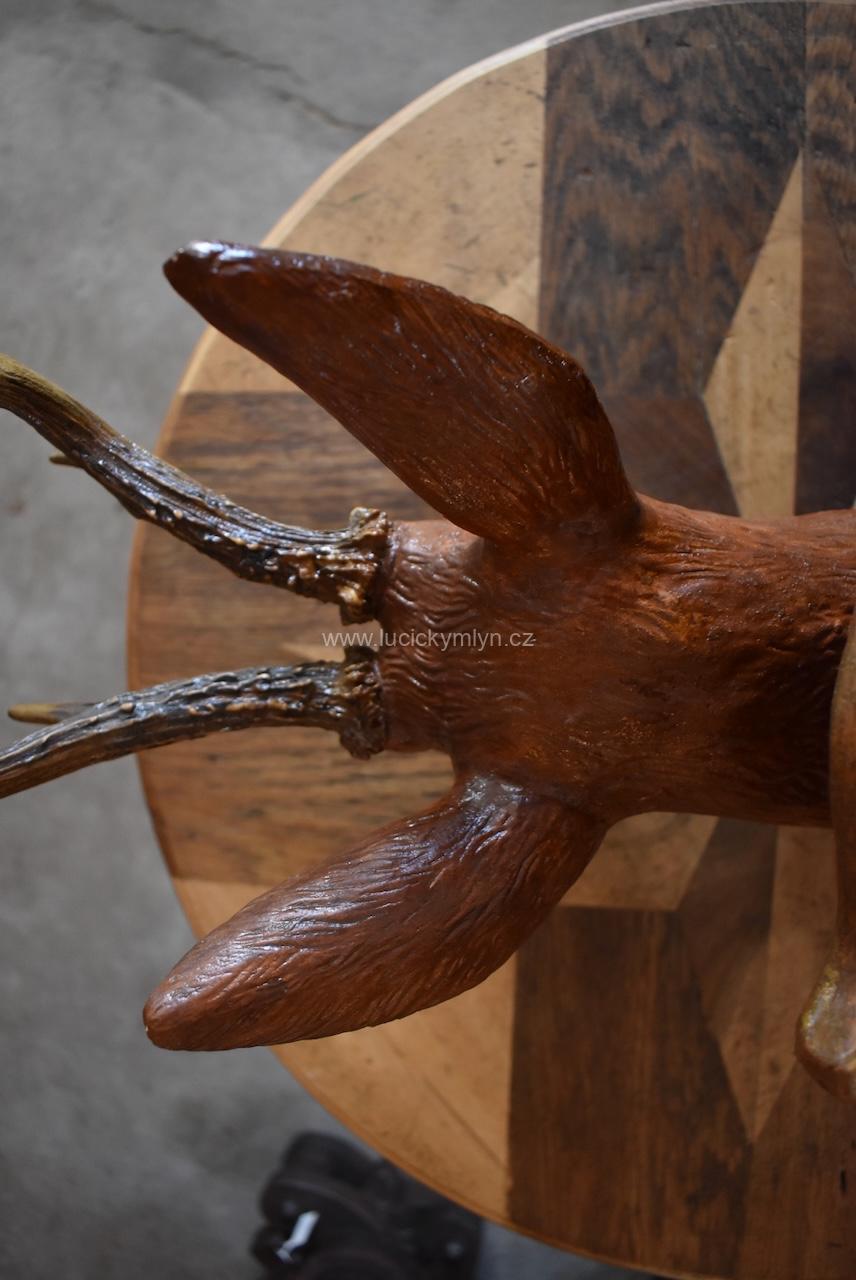 Nástěnná starožitná dekorace z hájovny – tvrdá keramika, věrně zpodobňující srnčí trofej na ozdobně řezané podložce