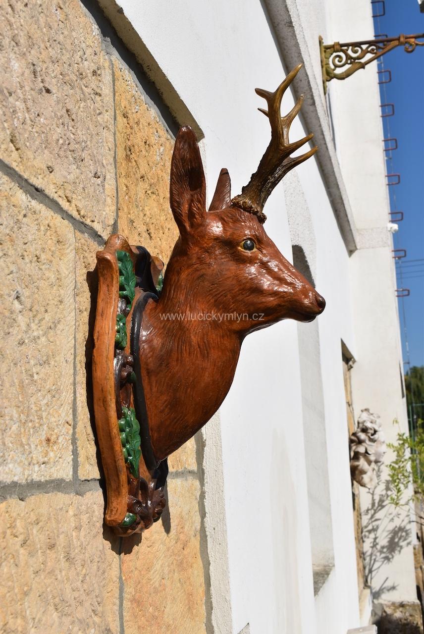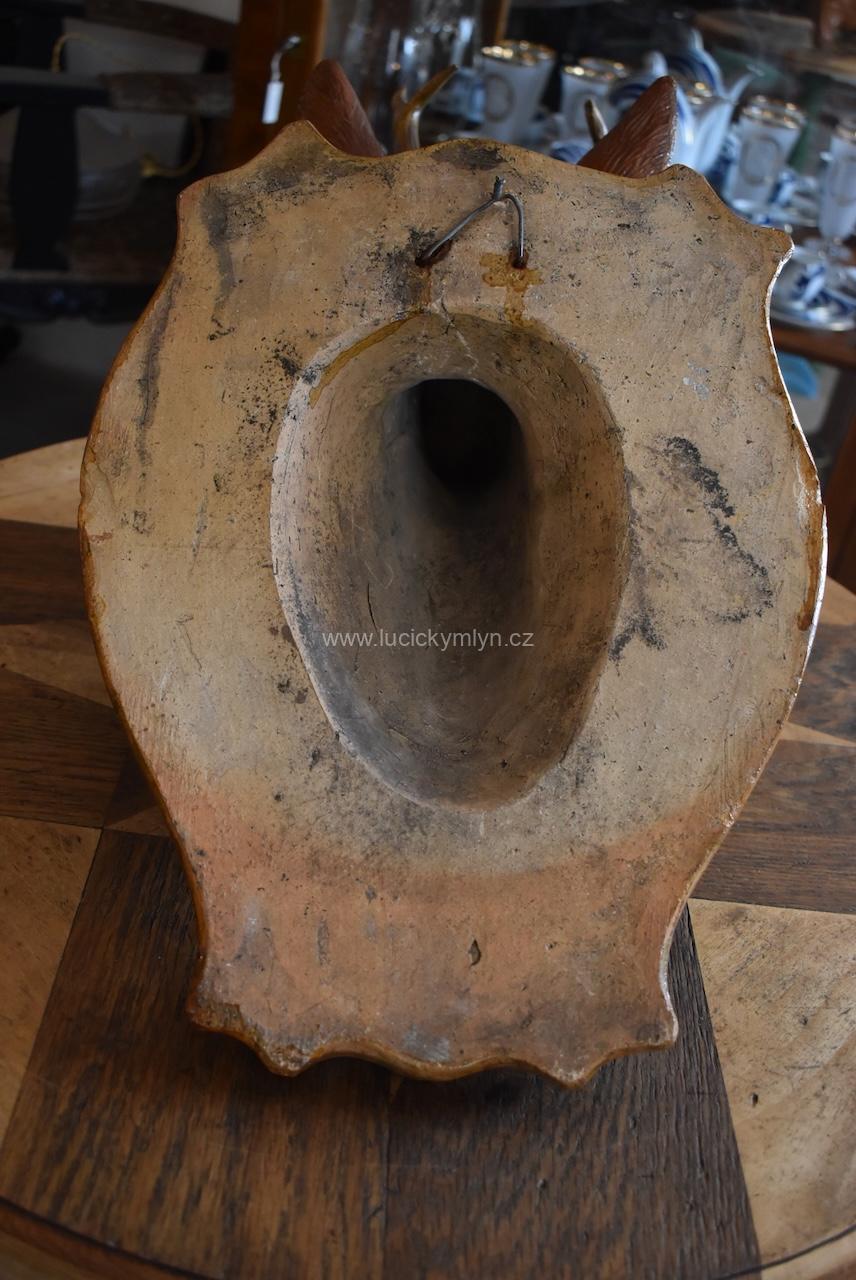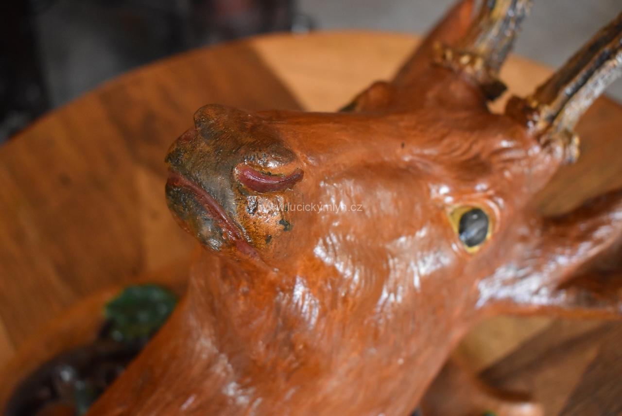 Originální závěsný předmět plasticky provedený i vybarvený v loveckém stylu. Hlava srnce s věrně ztvárněnými parůžky, byla i s prkénkem vyrobena z kolorované a leskle glazované keramiky. Nástěnná starožitná dekorace z 1.třetiny 20. stol. je svým provedením i kvalitou, vhodná nejen pro použití v interiéru, ale i exteriéru. Velmi dobrý původní stav, bez poškození.